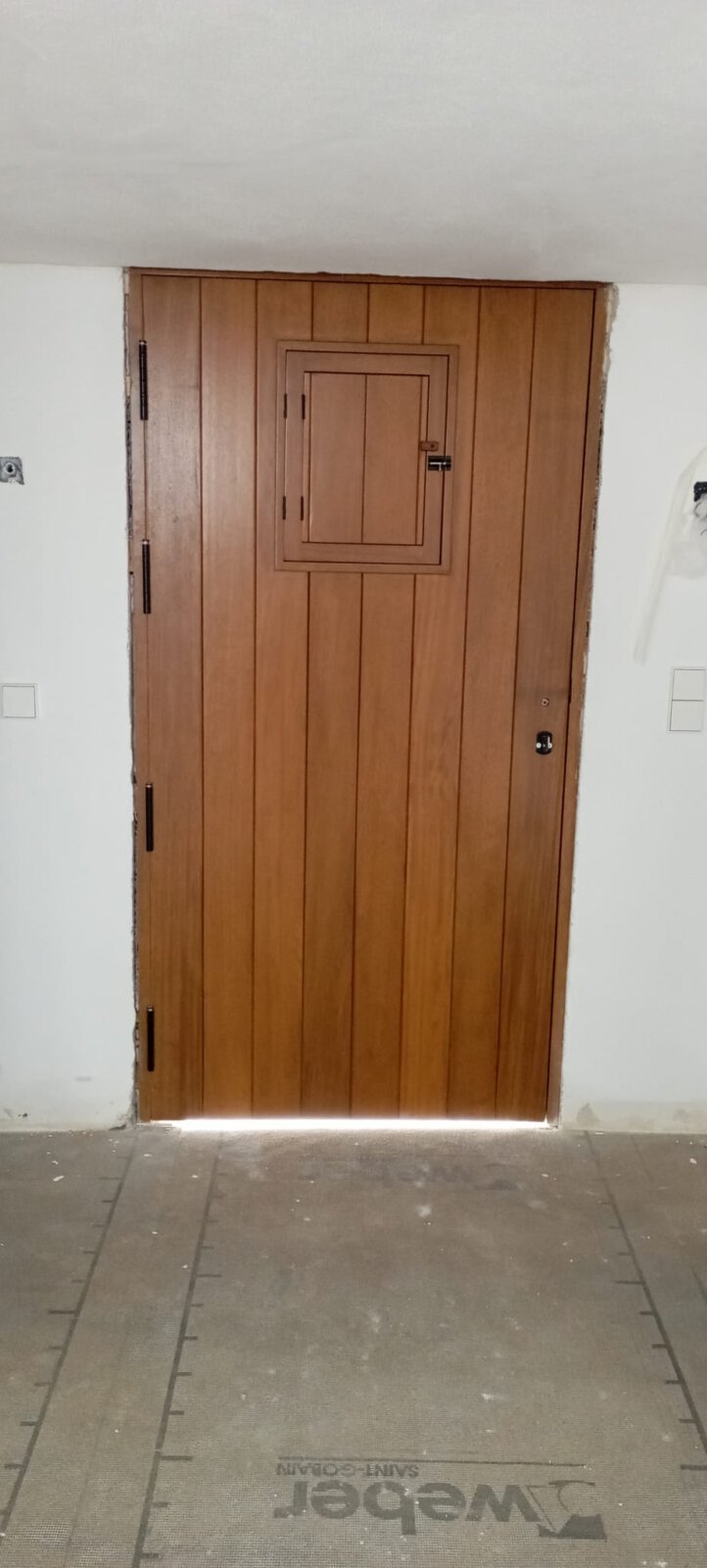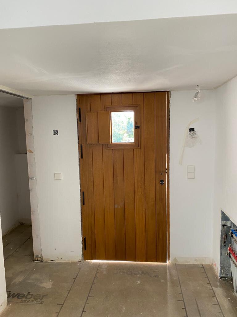 - Einbau und Abnahme der fehlenden Fenster sowie der Eingangstür aus lasiertem Iroko-Holz durch die örtliche Schreinerei