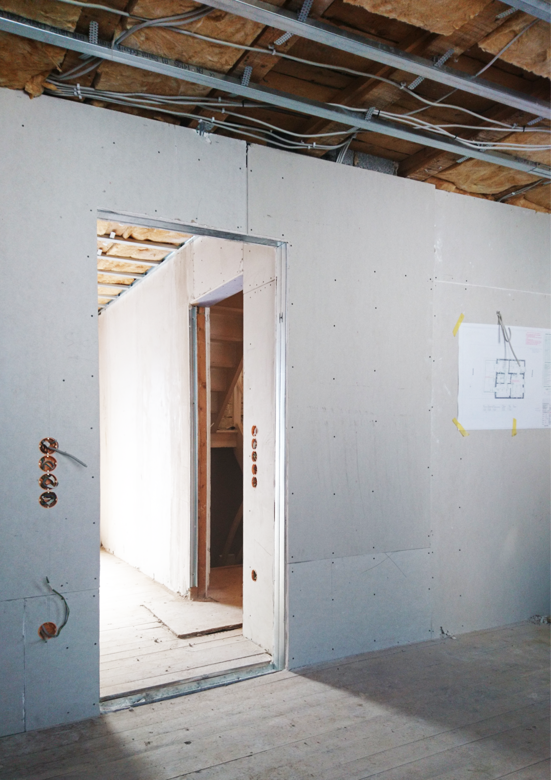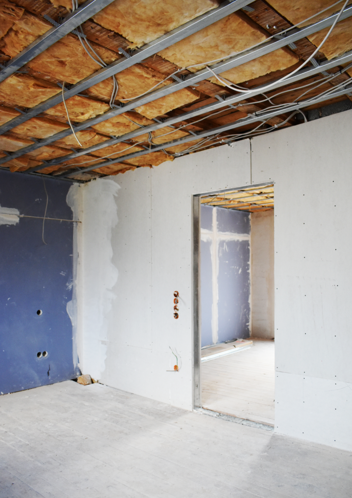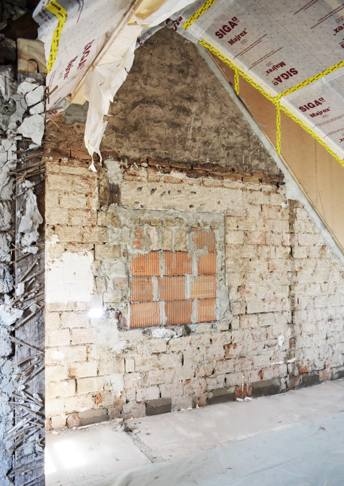 - Beginn des Ausbaus des Dachgeschosses, Dachabdichtung und Herstellung der Attika