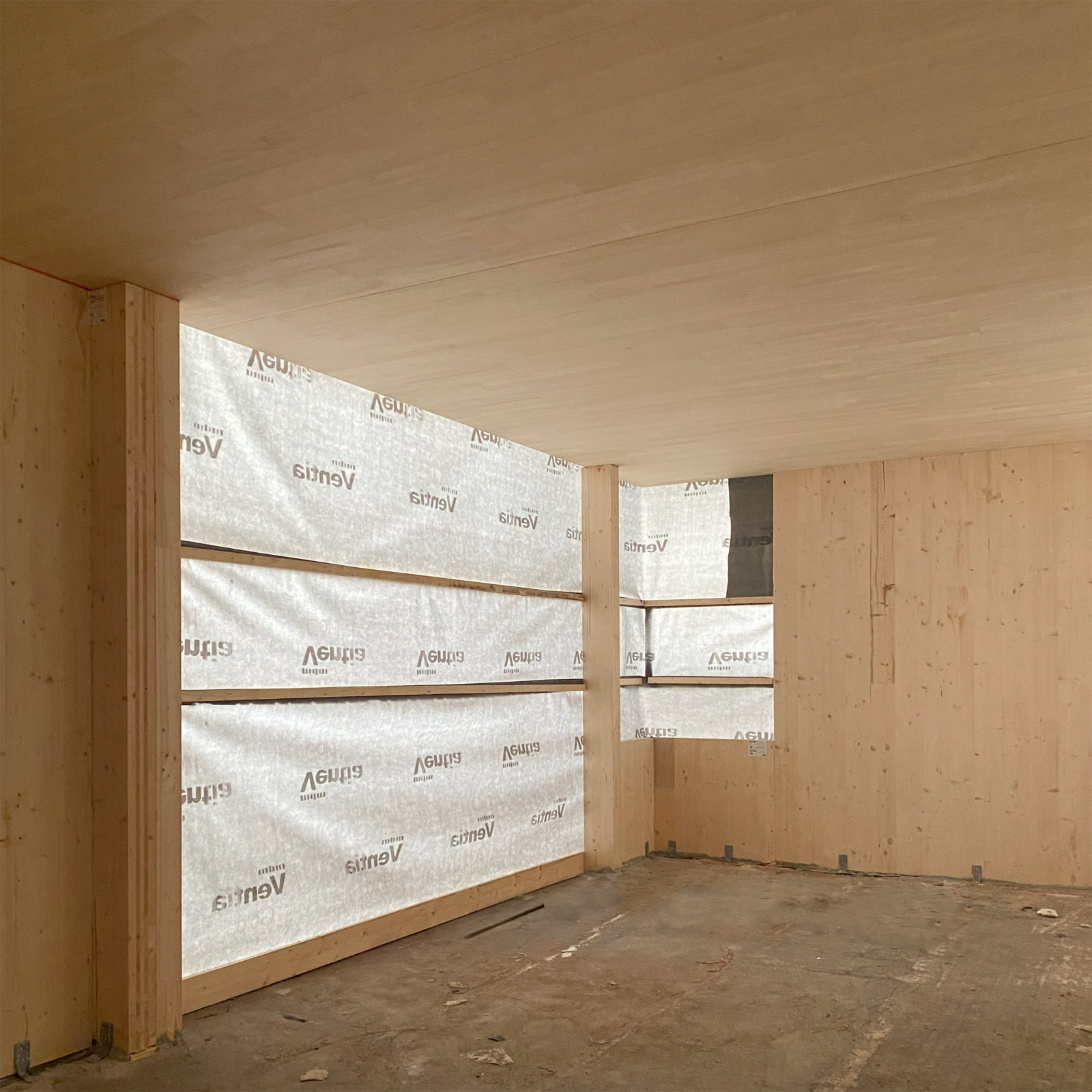 - Stellung des Rohbaus in CLT-Massivbauweise (Holzbau)