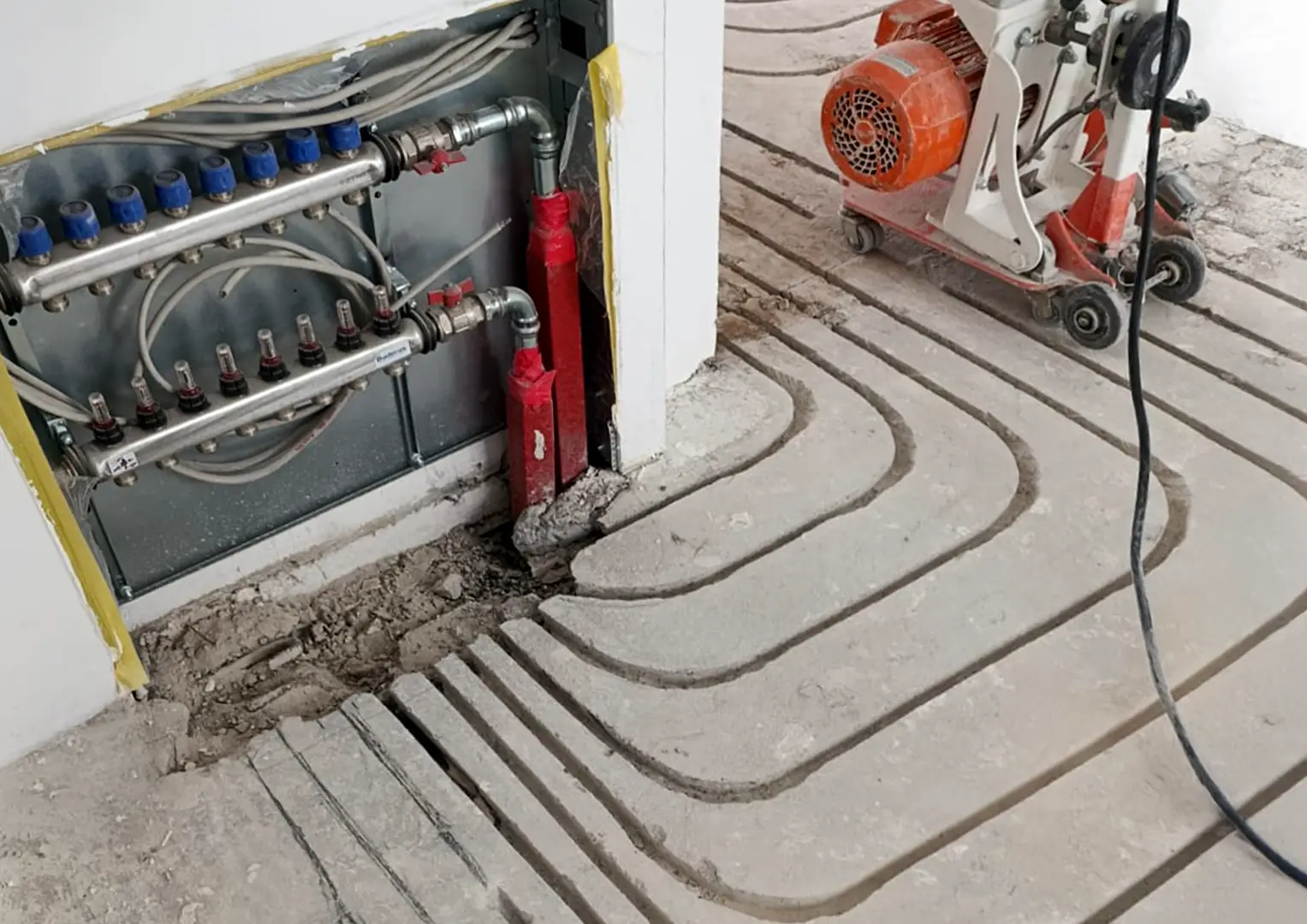 - Fußbodenverrohrung teilweise verlegt