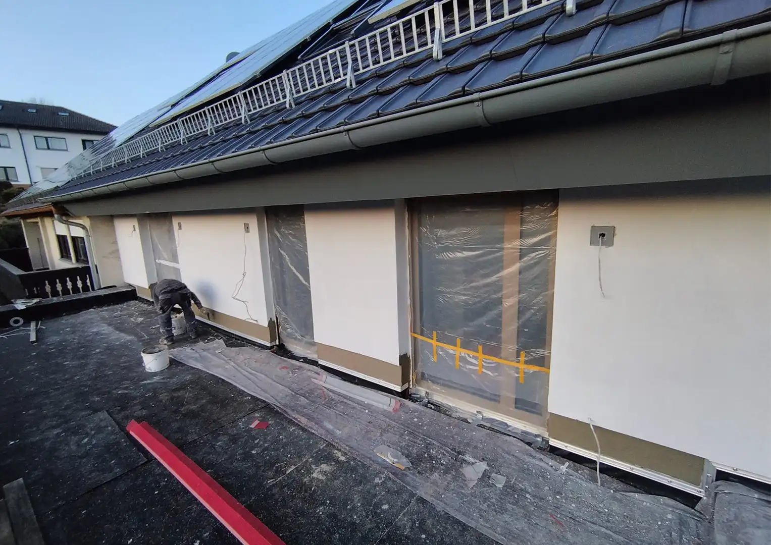 - Armierungsschicht inkl. Gewebe eingebracht; Profile und Anschlüsse ausgeführt (z. B. Tropfkanten, Fensteranschlüsse)