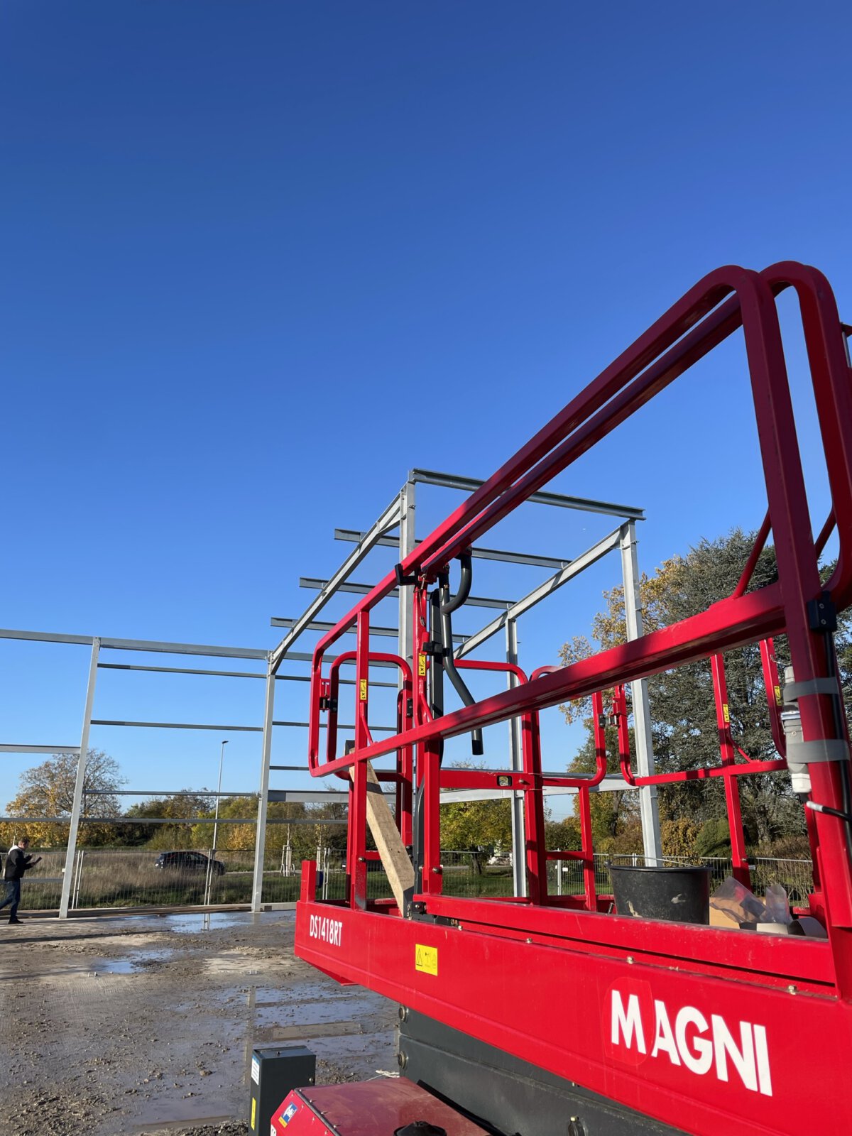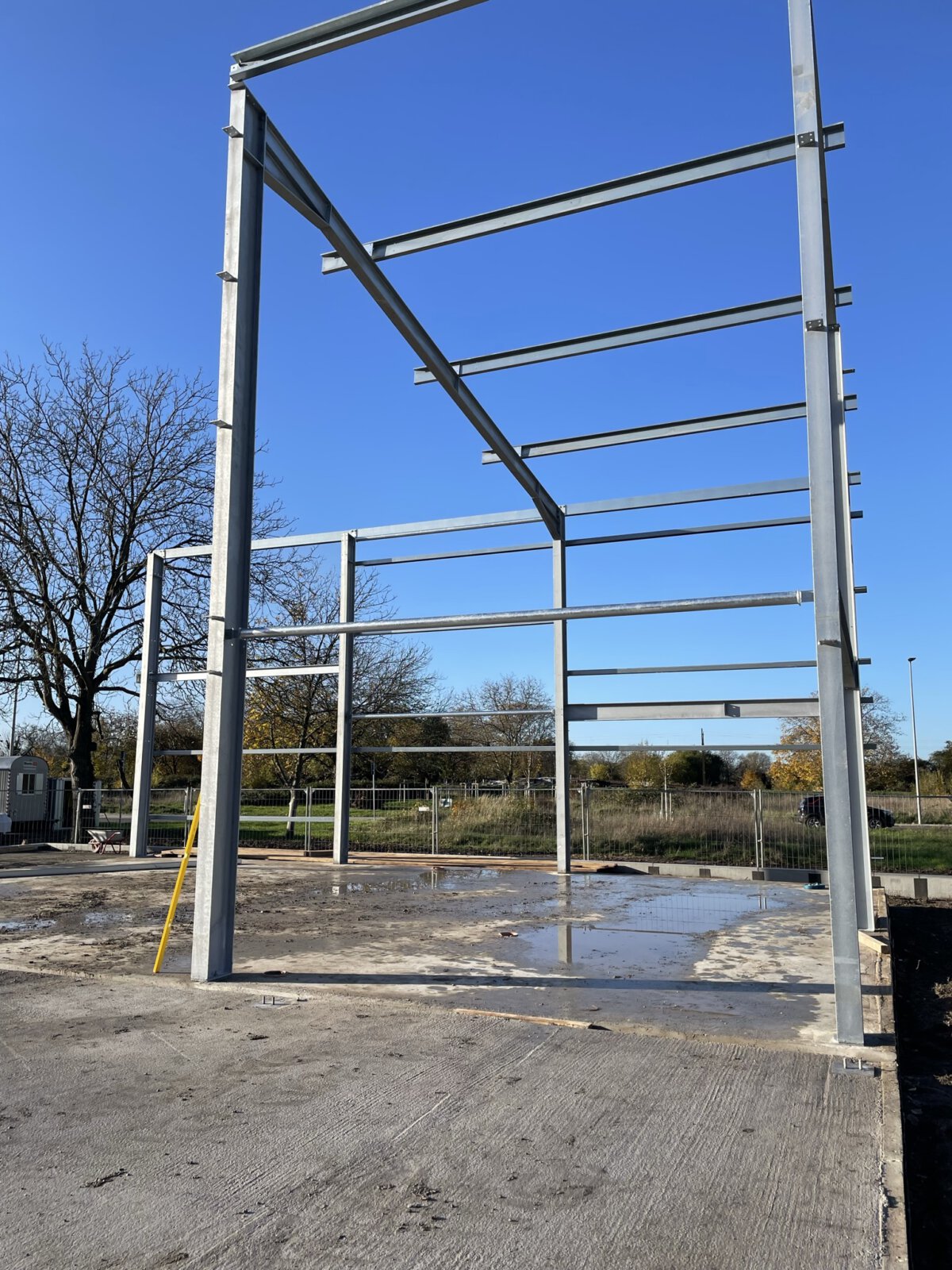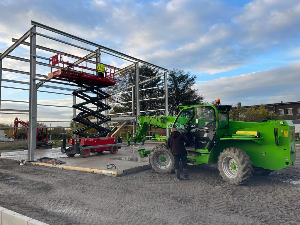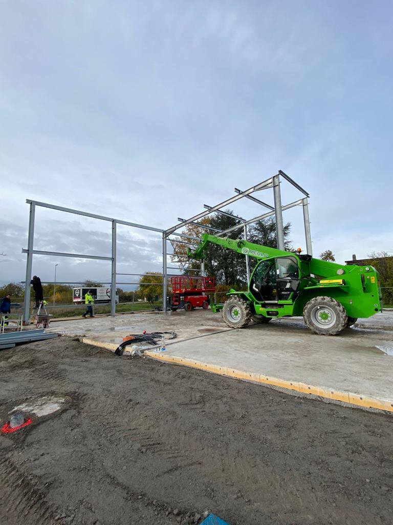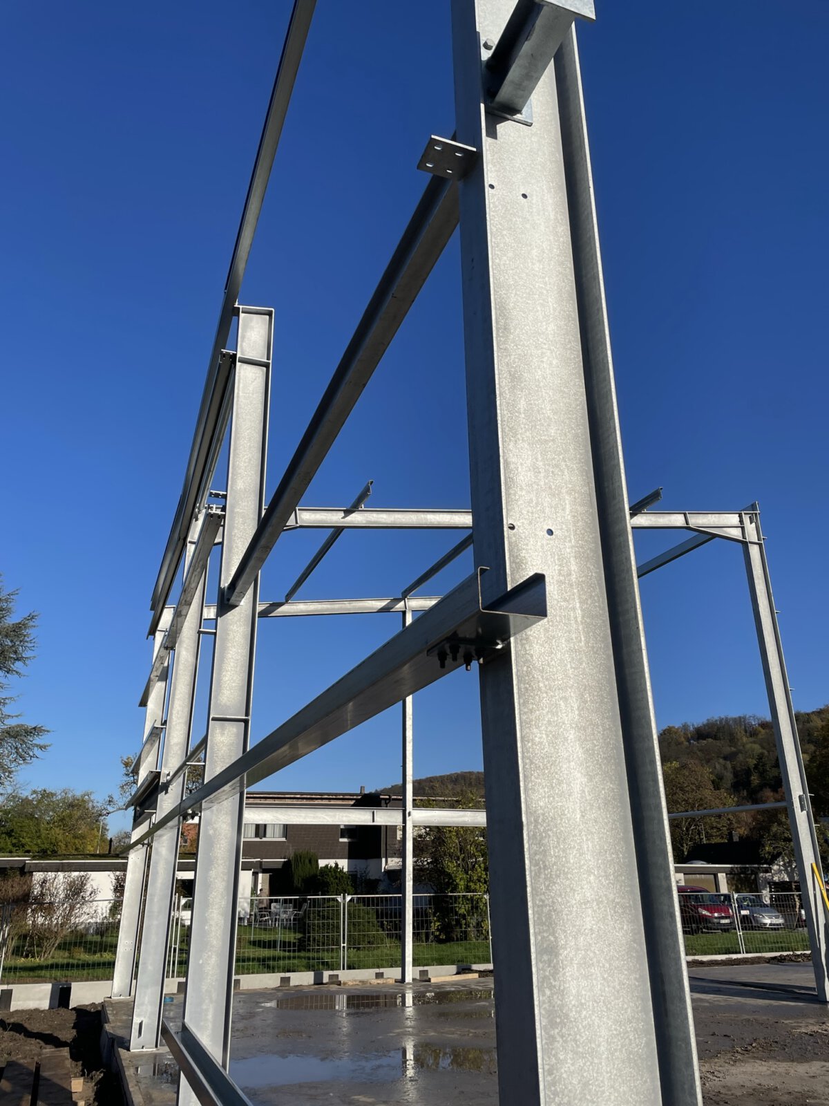 • Montage der Stahlunterkonstruktion für die Sandwichpaneele der Fahrzeug- Halle