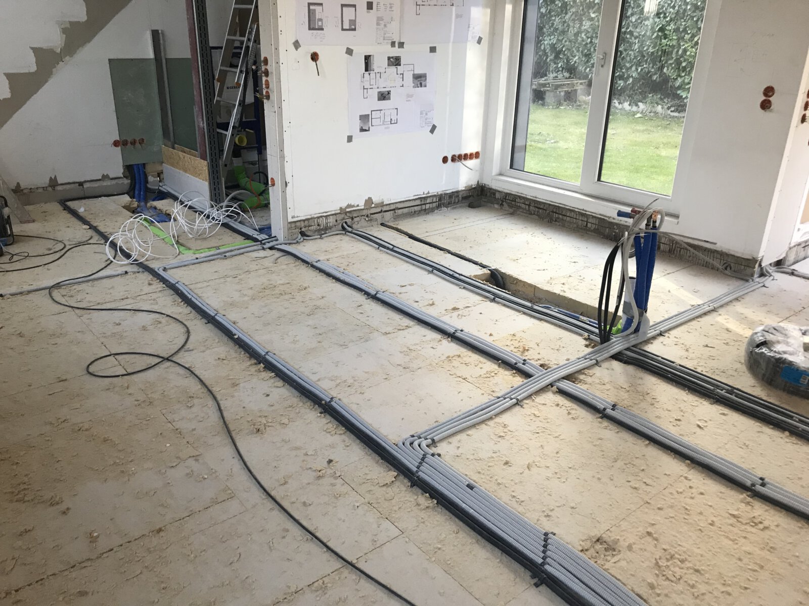 Im kompletten Erdgeschoss wird ein neuer Heizestrich mit Fußbodenheizung verlegt, um in Kombination mit neuen, großformatigen Fliesen eine komfortable Wohnatmosphäre zu schaffen.