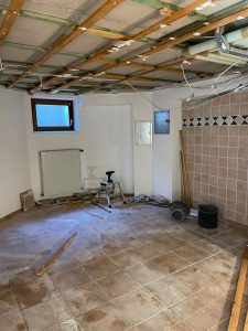- Demontage der Einbaumöbel, Ausbau der Türen und Zargen und Entfernen sämtlicher Bodenbeläge und Fliesen