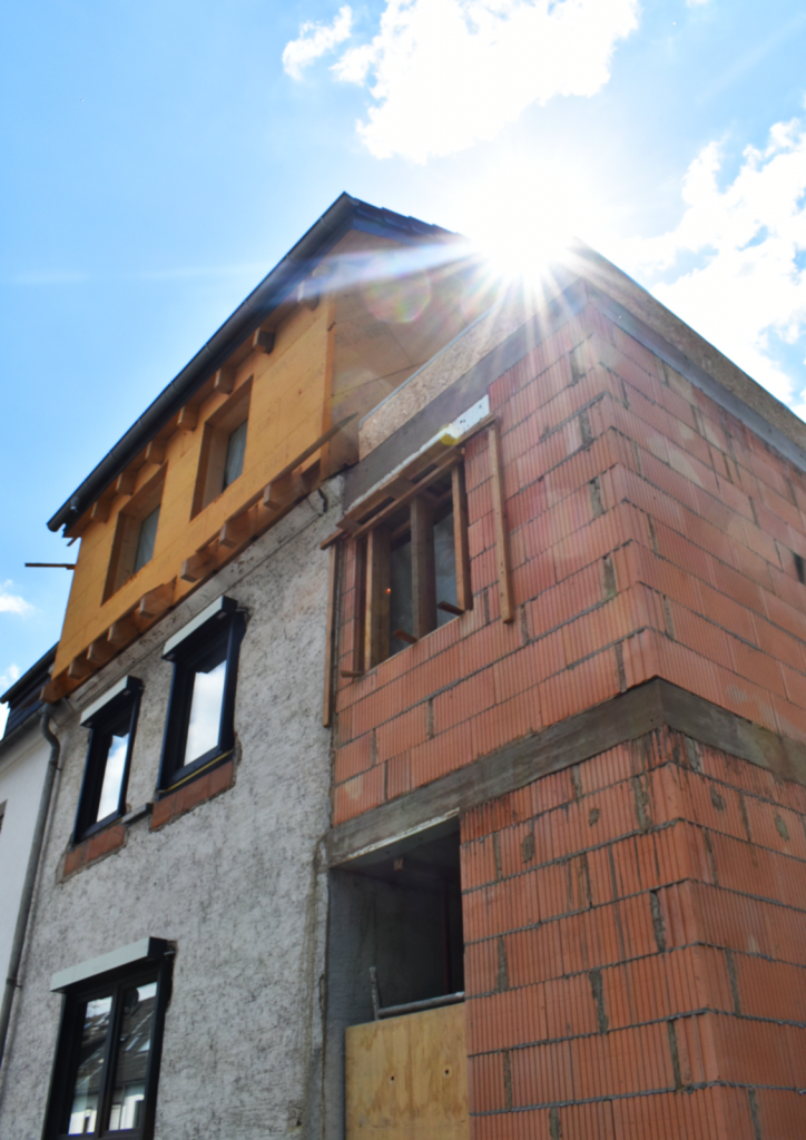 Fertigstellung der Rohbauarbeiten im Bestandshaus Fertigstellung der Rohbauarbeiten des Anbaus Anlage und Vergrößerung der Fenster- und Türöffnungen Erstellung der Dachgaube Beginn des Ausbaus des Dachgeschosses, Dachabdichtung und Herstellung der Attika Trockenbauwände stellen, spachteln und verputzen Herstellen der Deckenunterkonstruktion, Einbau der Dämmung Rohinstallation Heizung-/Sanitär Beginn der Verputzarbeiten