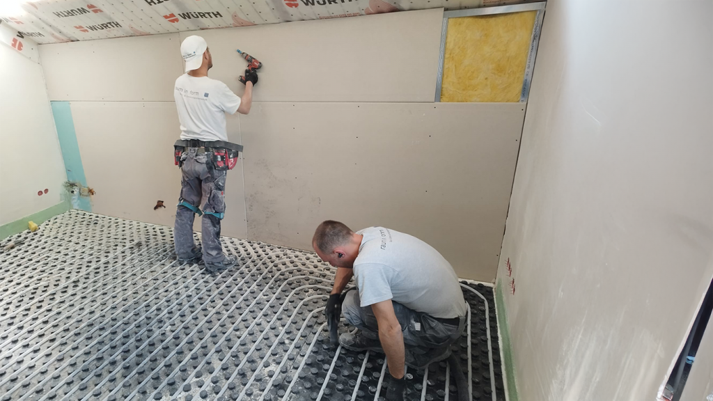 Abbruch der Fenster und Vergrößern der Fensteröffnungen Abbruch der bestehenden Rollladenkästen Einbau neuer Fenster & Rollladenkästen Einfräsen und Verlegen der Fußbodenheizung Herstellen des Bodenausgleichs Installation der Unterkonstruktionen Installation der Trockenbauwänden Grundierung der Wandoberflächen für die Verputzerarbeiten Fertigstellung der Verputzerarbeiten Fertigstellung der Schleifarbeiten Fertigstellung der Malerarbeiten Beginn mit der Verlegung der Fliesen