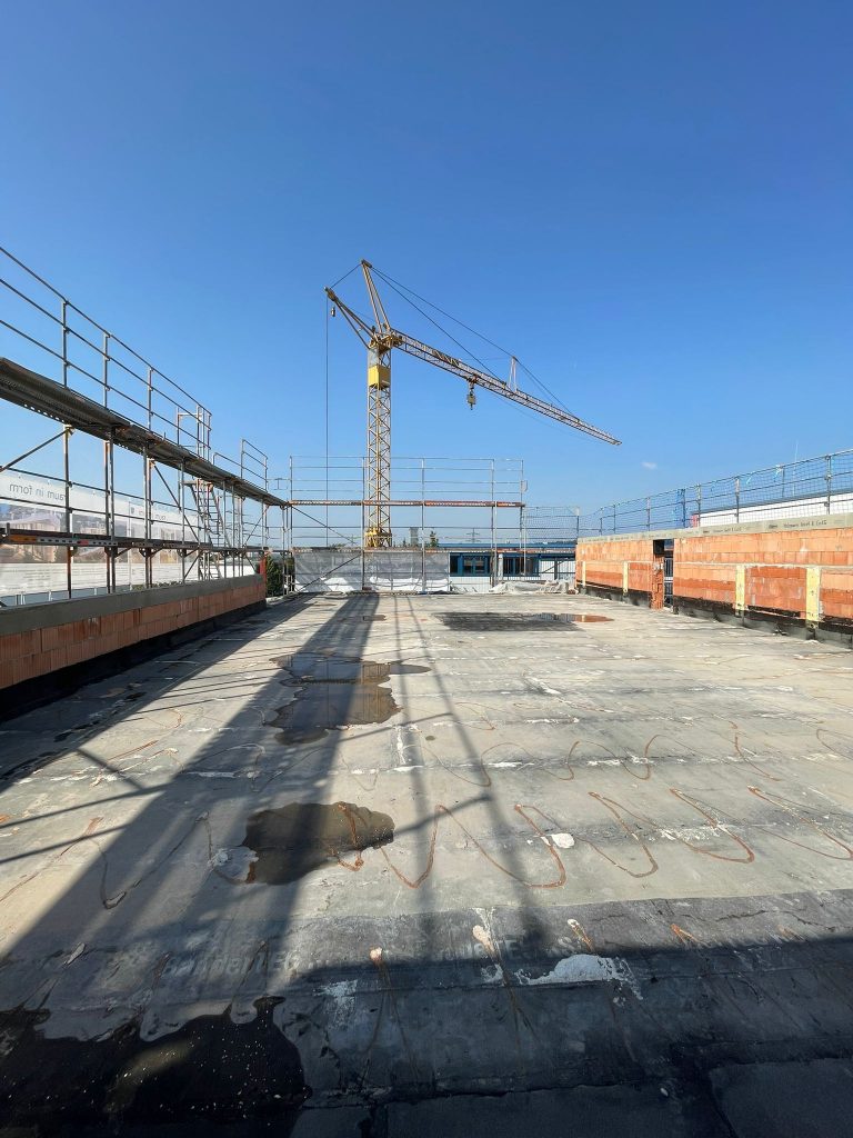 Baustelleneinrichtung abgeschlossen Ausgeführte Demontage des Zwischendachs zwischen den Gebäudekomplexen Gerüststellung über drei Fassadenseiten inkl. dem Aufstockungsbereich Straßensperrung zur Kranstellung Kranstellung für die Gewerke Entfernen der Betonplatten bzw. der Bodenfliesen im Kiesbett Entfernen der Kiesschüttungen und Pflanzen Abtragen der bestehenden Gefälledämmung Abbruch der Bestandsbrüstung an zwei Fassadenseiten Abbruch der Metallblechverkleidung, des Mauerwerks und der Betonbewährung Notabdichtung […]