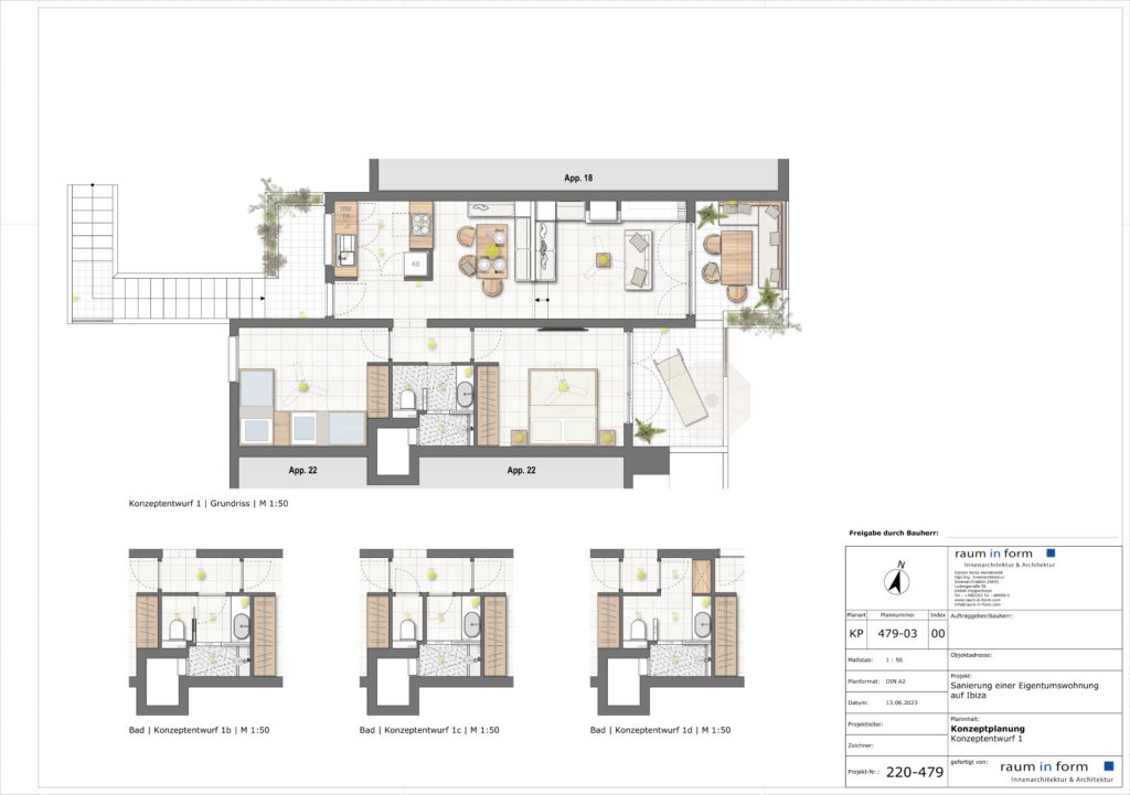 Infolge der Beauftragung von „raum in form– Innenarchitektur & Architektur“ Ende April 2023 mit der Grundlagenerarbeitung, den Konzeptplanungen und der Kostenschätzung für die Baukosten für die Sanierung der Eigentumswohnung, wurde direkt nach der Auftragserteilung erste Konzeptskizzen erarbeitet. Das dafür notwendige Aufmaß konnte aufgrund der ständigen Präsenz vor Ort auf Ibiza bereits kurz nach der Auftragserteilung […]