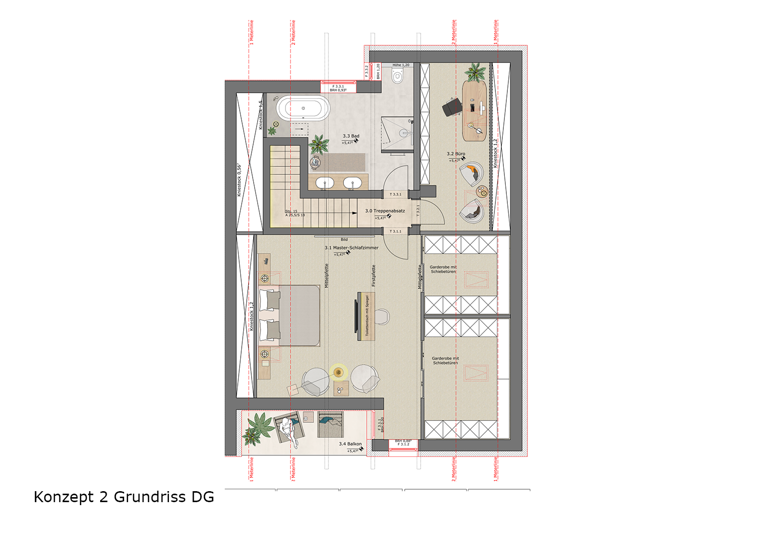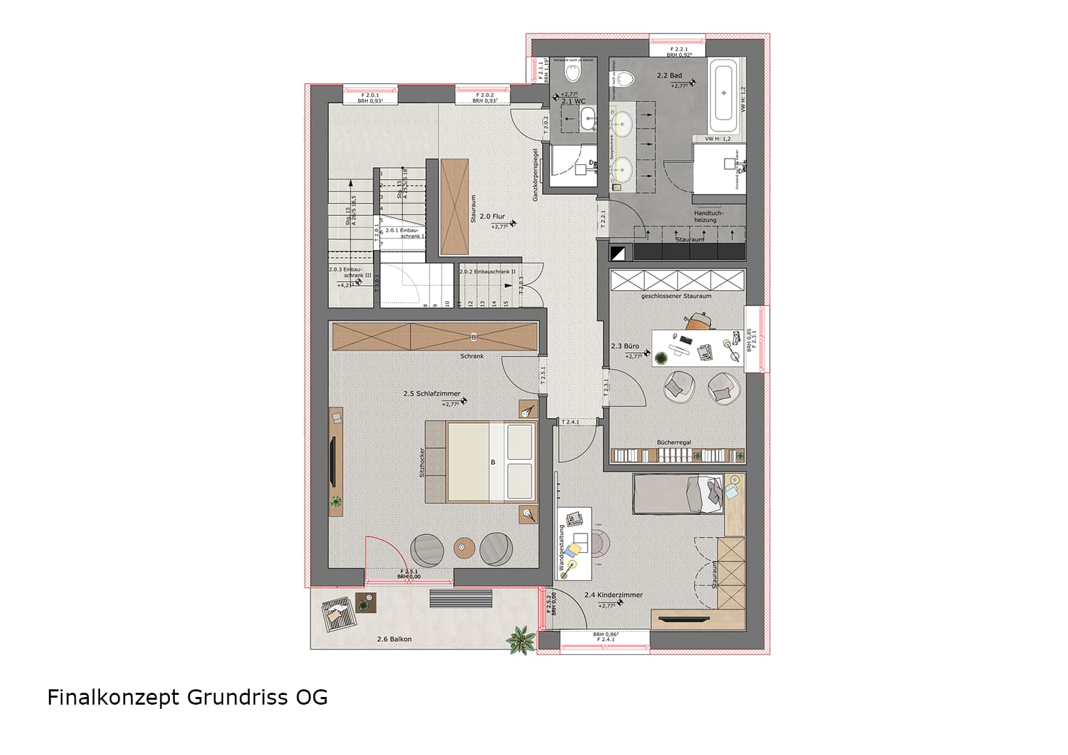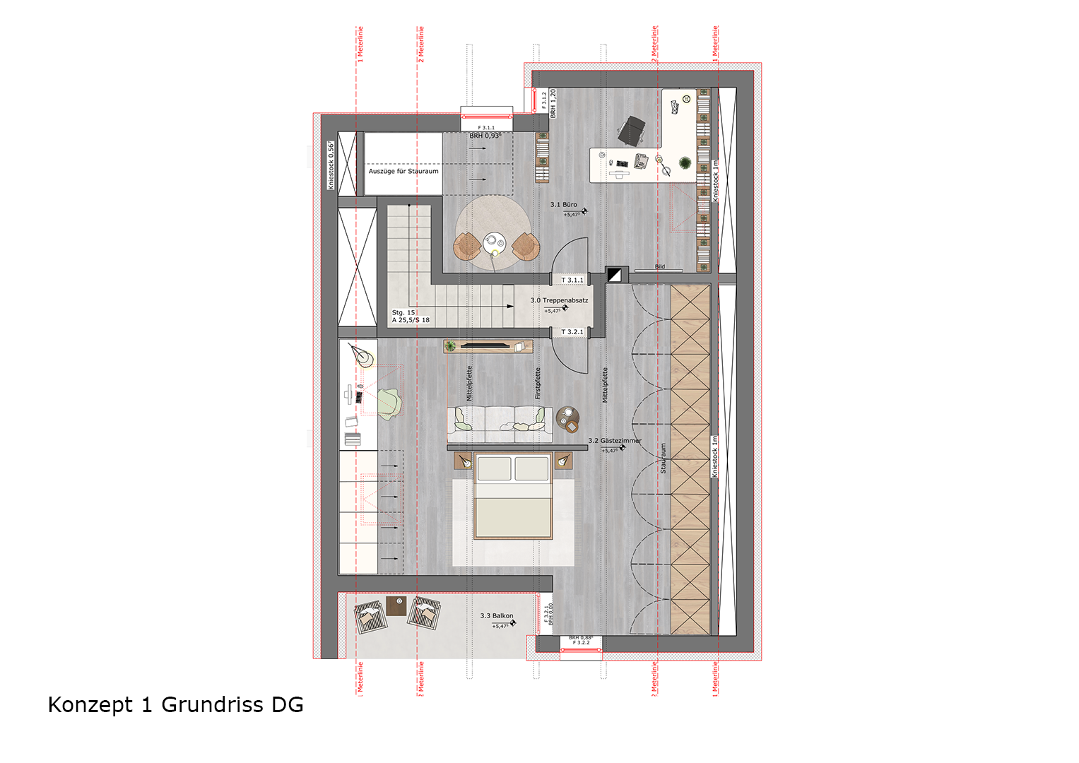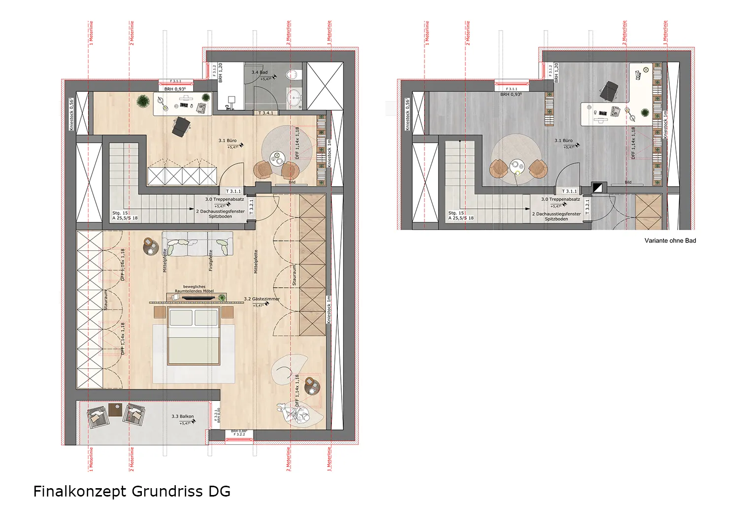 Das Dachgeschoss kombiniert das großzügige Gästezimmer der ersten Variante mit der Badezimmer-Integration des zweiten Entwurfs. Durch eine intelligente Grundrissanpassung fungiert das neu geplante Büro nun als Durchgangsbereich zum Bad, wodurch die nutzbare Arbeitsfläche vergrößert wurde. Bei der Anordnung der Sanitärobjekte (Dusche, Waschtisch, WC) im neuen Bad im Dachgeschoss wurde die verfügbare Kopfhöhe unter der Dachschräge genauestens in die Planung einbezogen. Maßgefertigte Einbaumöbel nutzen das Raumvolumen der Schrägen als unsichtbaren Stauraum optimal aus.