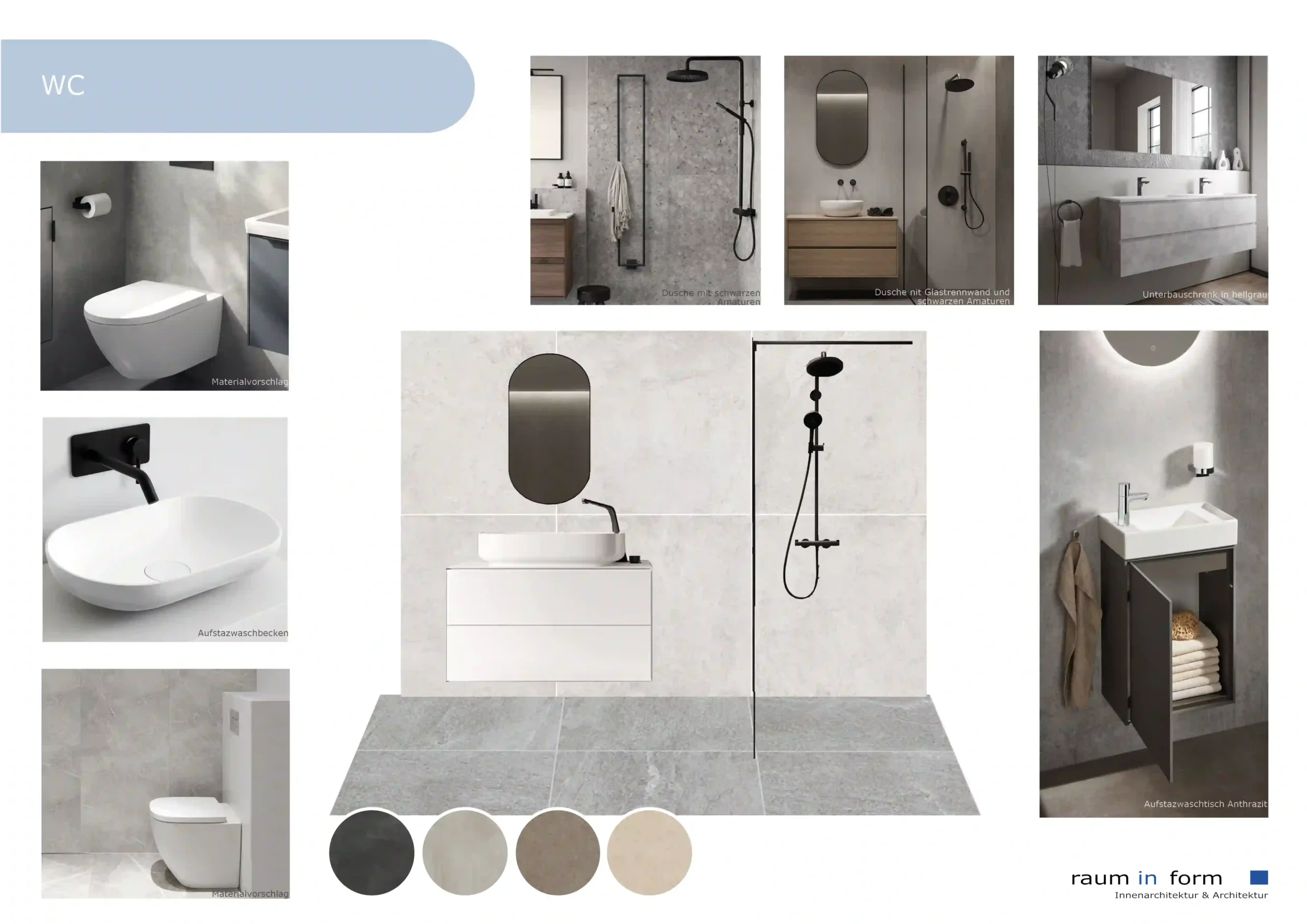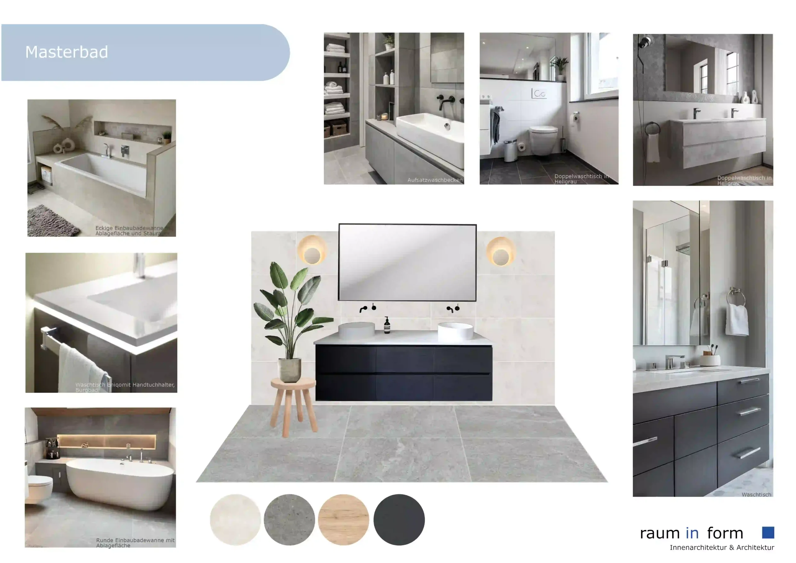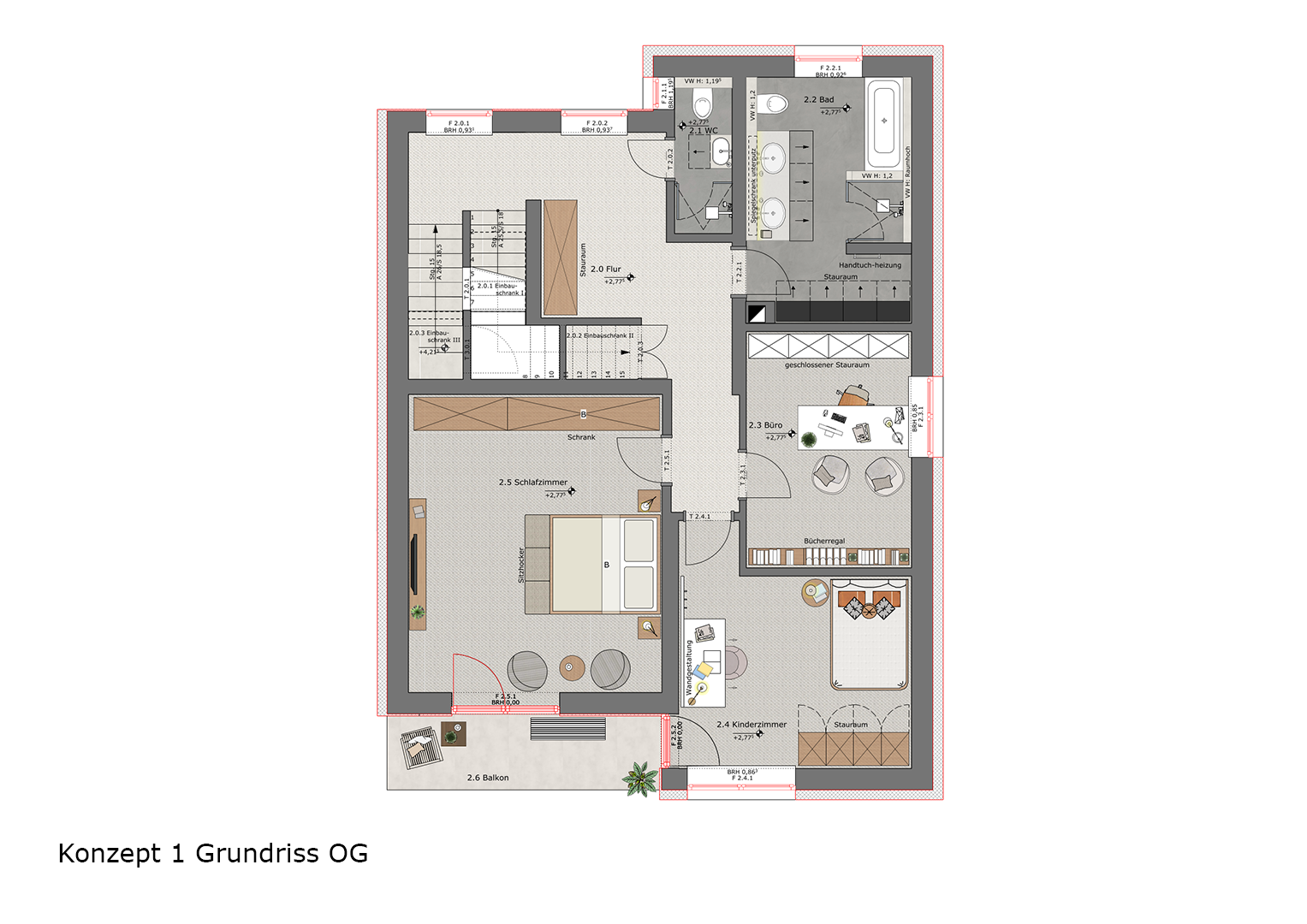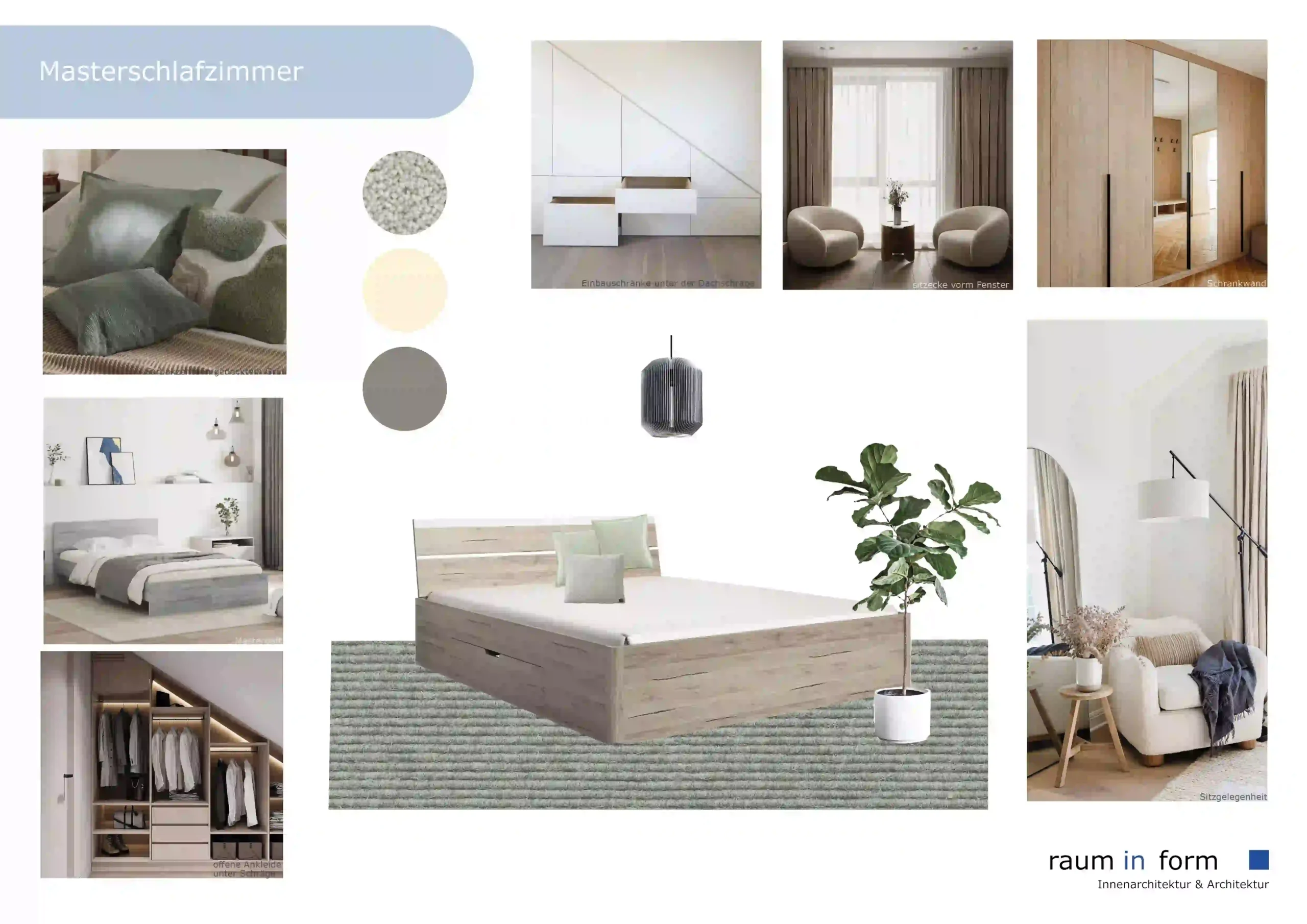 Das Dachgeschoss kombiniert das großzügige Gästezimmer der ersten Variante mit der Badezimmer-Integration des zweiten Entwurfs. Durch eine intelligente Grundrissanpassung fungiert das neu geplante Büro nun als Durchgangsbereich zum Bad, wodurch die nutzbare Arbeitsfläche vergrößert wurde. Bei der Anordnung der Sanitärobjekte (Dusche, Waschtisch, WC) im neuen Bad im Dachgeschoss wurde die verfügbare Kopfhöhe unter der Dachschräge genauestens in die Planung einbezogen. Maßgefertigte Einbaumöbel nutzen das Raumvolumen der Schrägen als unsichtbaren Stauraum optimal aus.