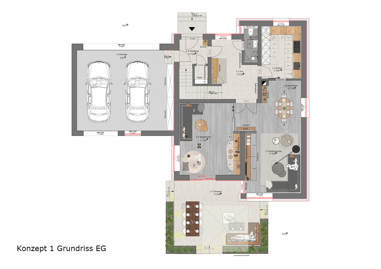Im Erdgeschoss wird die Struktur des ersten Konzepts umgesetzt: Die Reduzierung der Wände führt zu einem lichten Wohn- und Essbereich sowie einem abgetrennten Spielzimmer– beide Zonen profitieren nun von einem direkten Terrassenzugang.