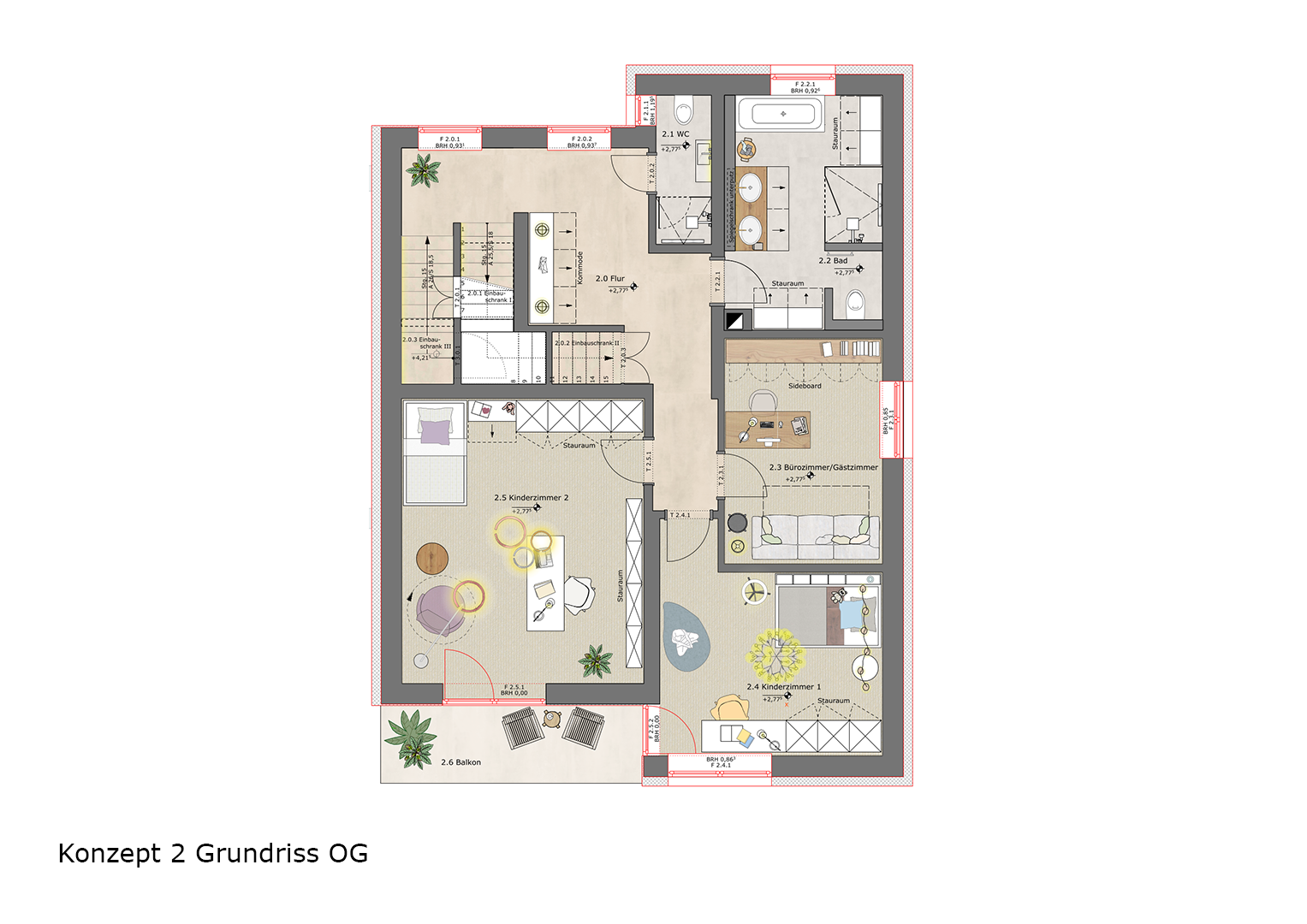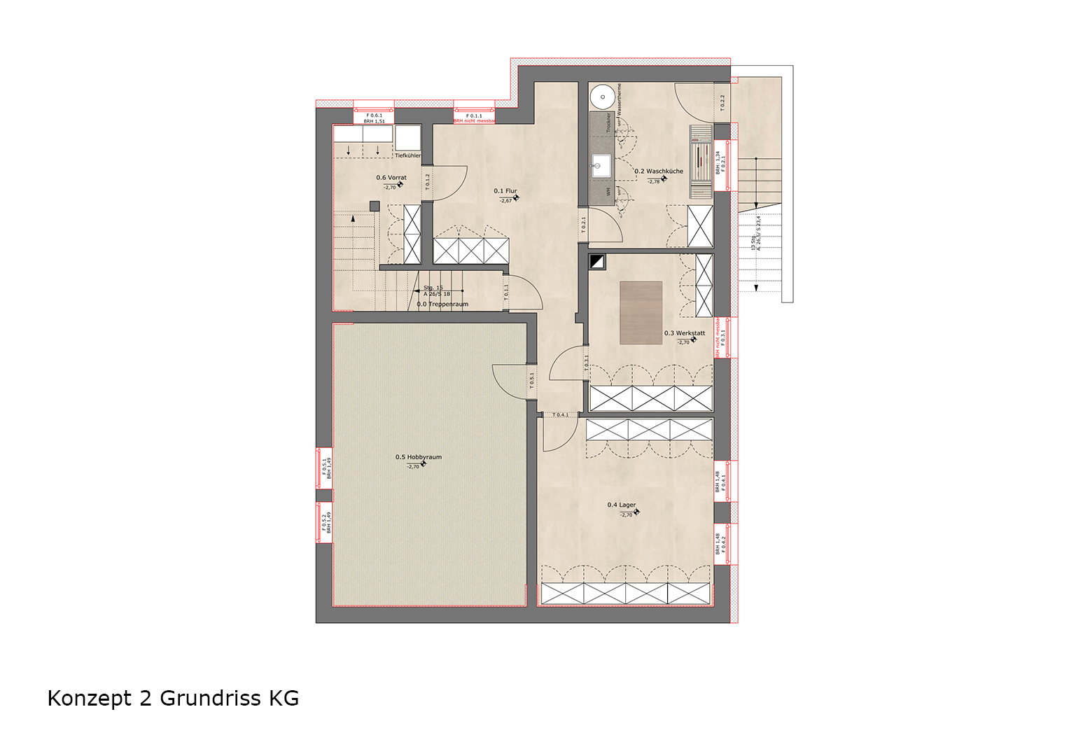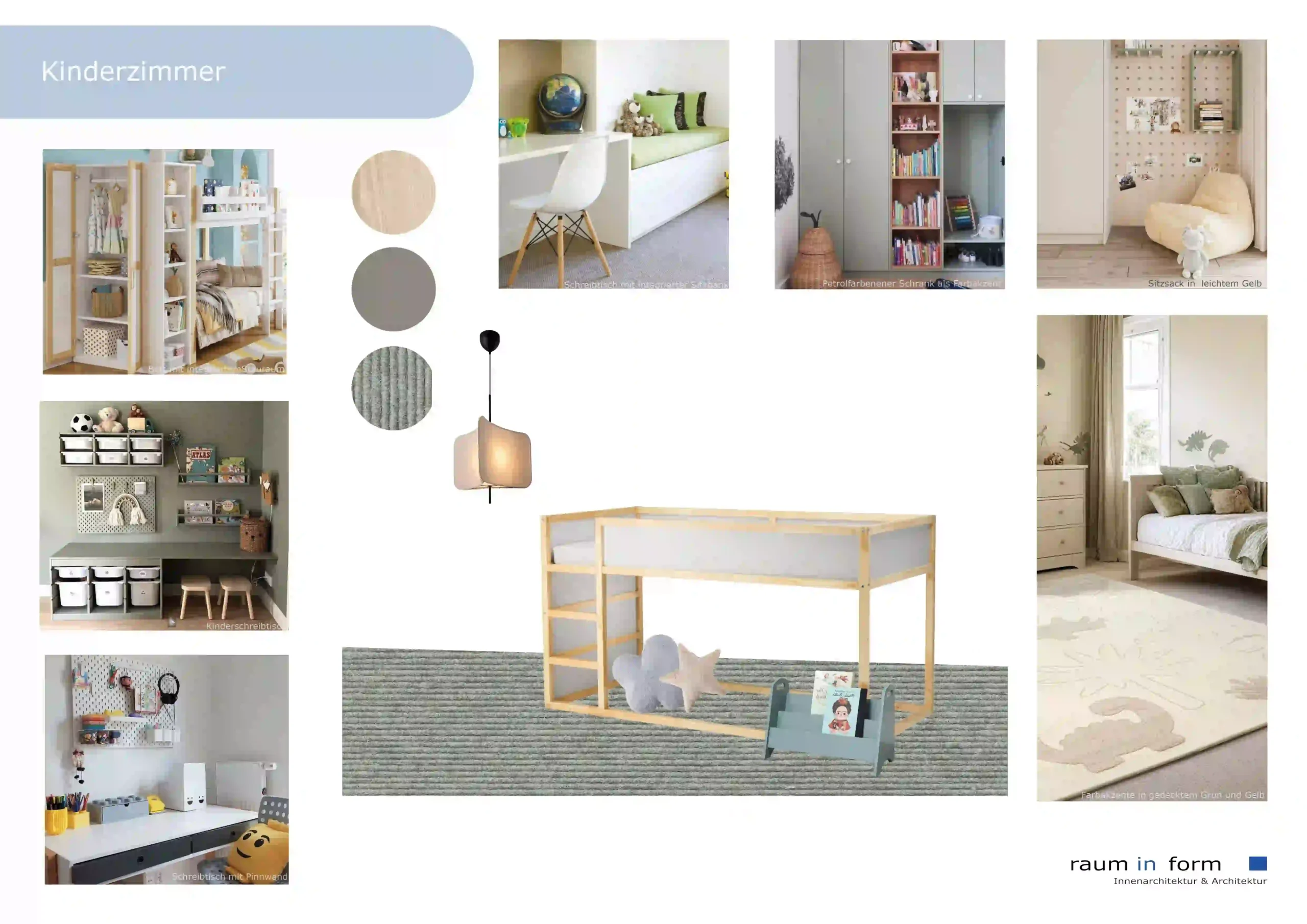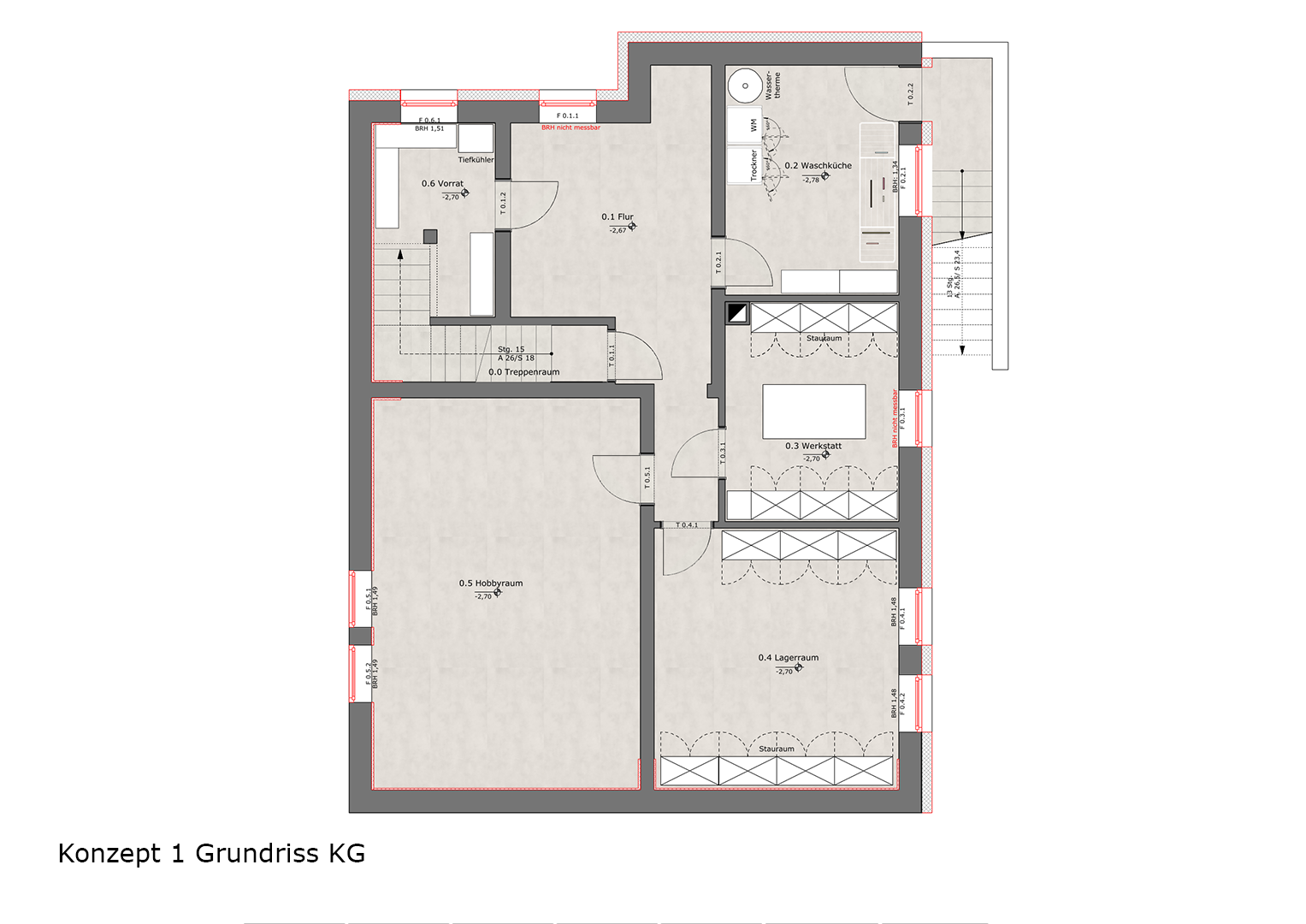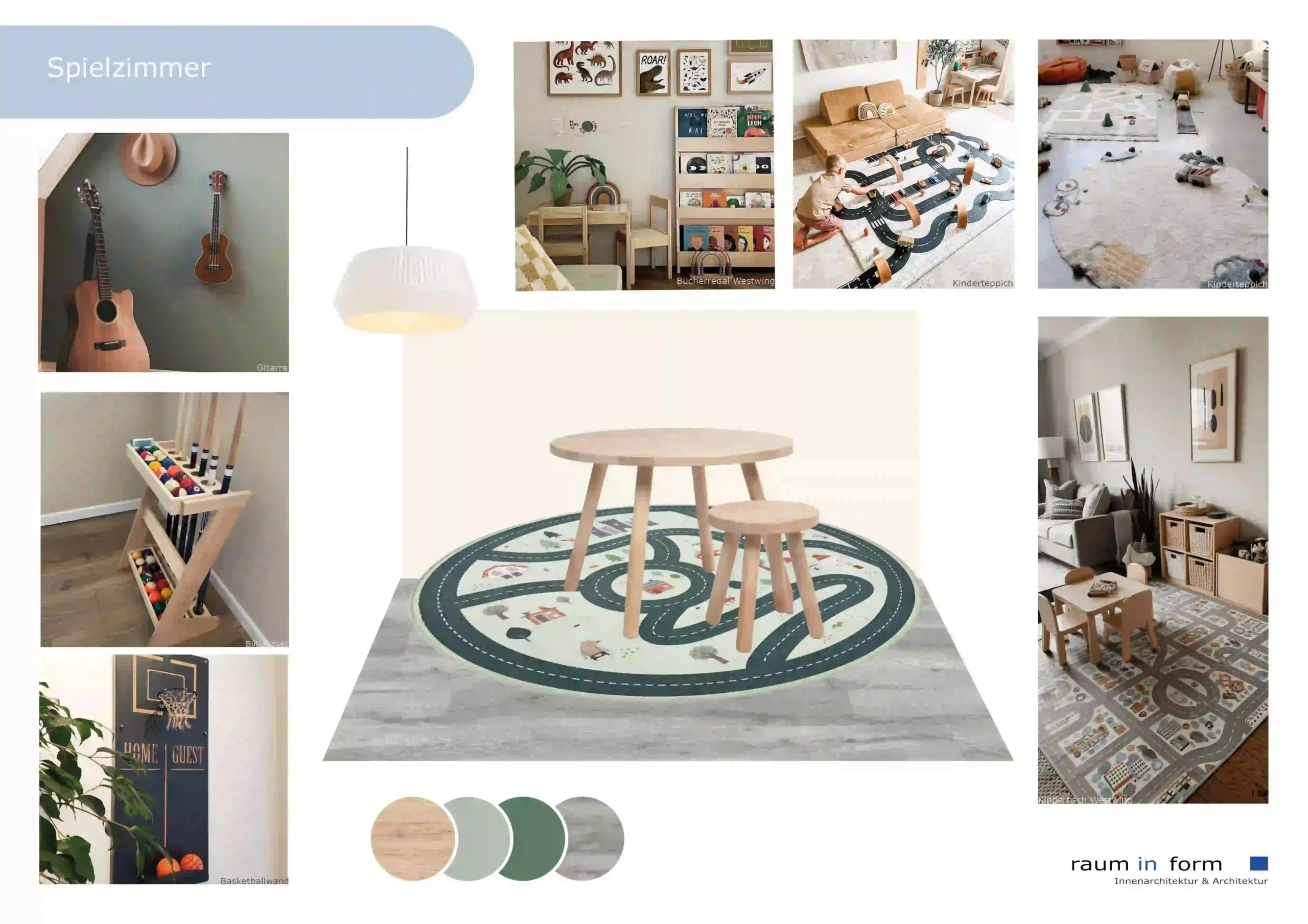 In der ersten Variante lag der Fokus auf einer stark bedarfsorientierten, minimalinvasiven Anpassung. Im Erdgeschoss wurde durch den gezielten Rückbau einer einzelnen Wand ein offener Wohn- und Essbereich geschaffen; das ehemalige Wohnzimmer wurde in ein separates Spielzimmer umgewandelt. Im Dachgeschoss sah dieser Entwurf die Schaffung zweier klar definierter Räume vor: ein straßenseitiges Büro und ein gartenseitiges Gäste- bzw. Jugendzimmer, ergänzt durch passgenaue Schrankeinbauten in den Dachschrägen.