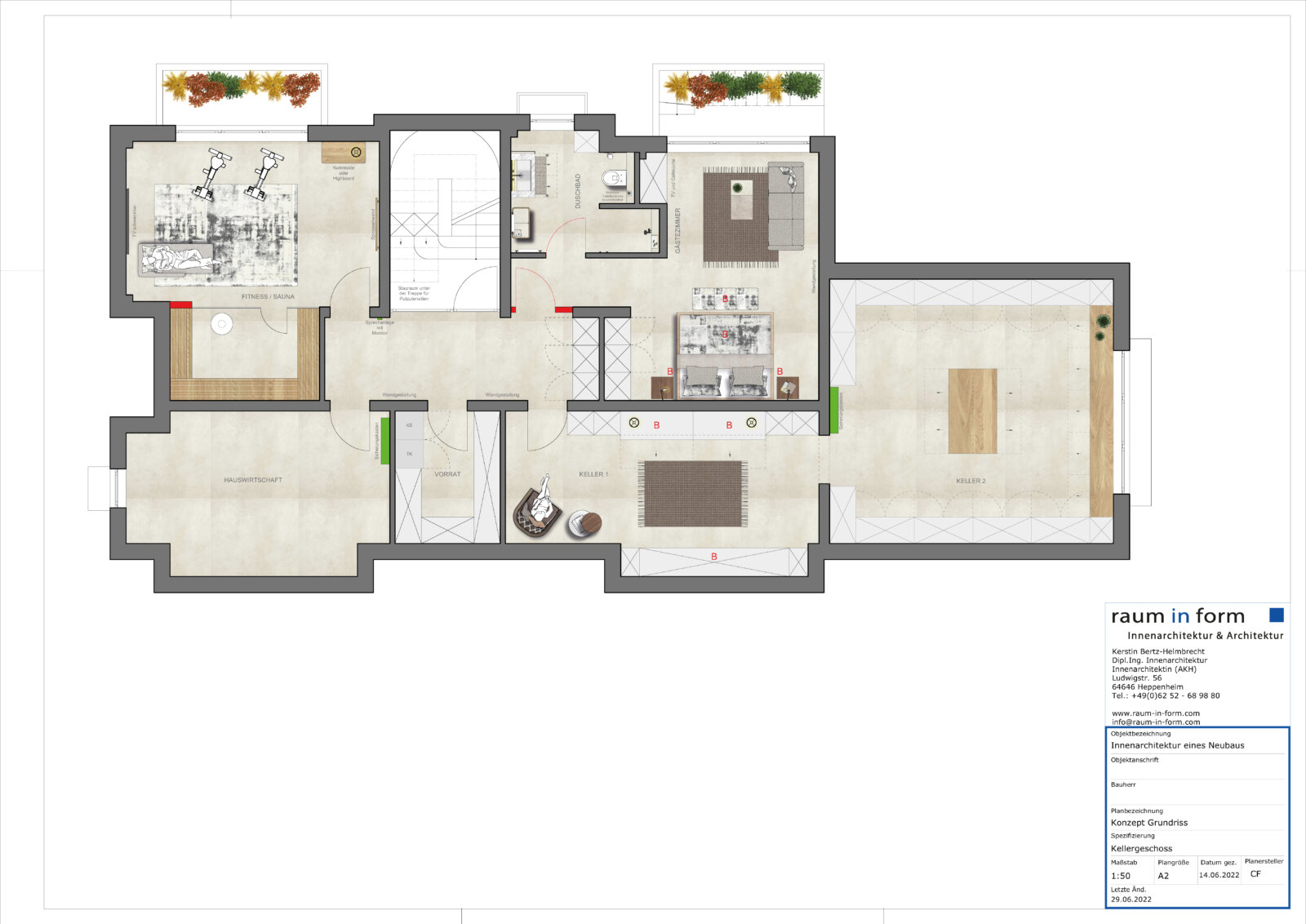 Das Kellergeschoss beinhaltet einen großen Wellnessbereich mit integrierter Sauna, einen Ruhebereich und einen Fitnessbereich. Zudem wurde ein Gästebereich angelegt, welcher nicht nur eine Schlafmöglichkeit impliziert, sondern auch eine Küche und einen kleinen Wohnbereich enthält. Dementsprechend wurde ausreichend maßangefertigter Stauraum eingeplant, welcher sich im Flur und einem Durchgangszimmer fortsetzt und auch die bereits existierenden exklusiven Bestandsmöbel der Bauherren integriert.