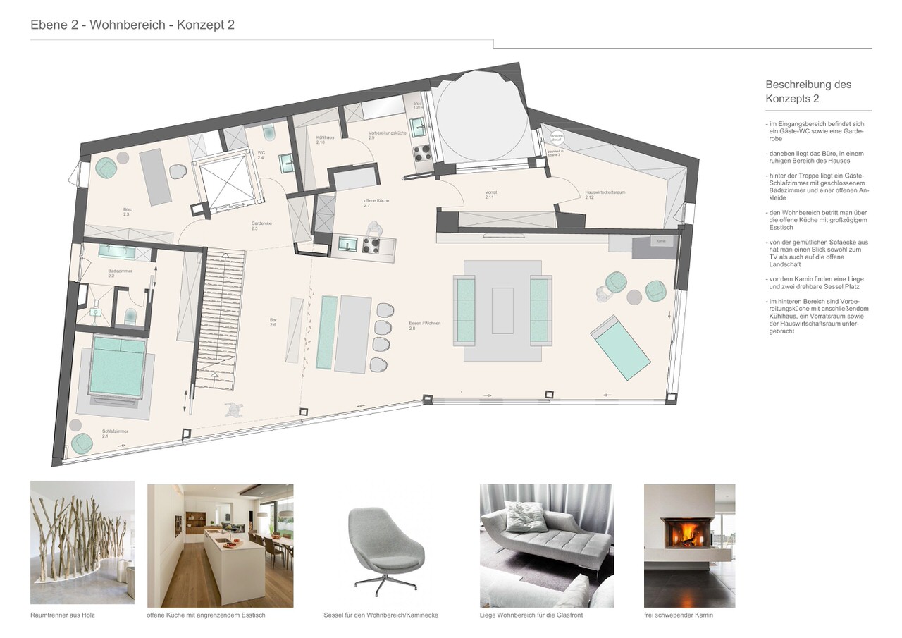Basierend auf Ihrem anschließendem Feedback und der meist sehr intensiven Kommunikation zwischen Ihnen und dem Projektteam im Anschluss dieses Termins, erstellen wir für Sie dann als Entscheidungsgrundlage für die einzelnen Bereiche und Geschosse des zu modernisierenden oder neu zu erstellenden Objekts, die jeweils finalen Konzeptionen.