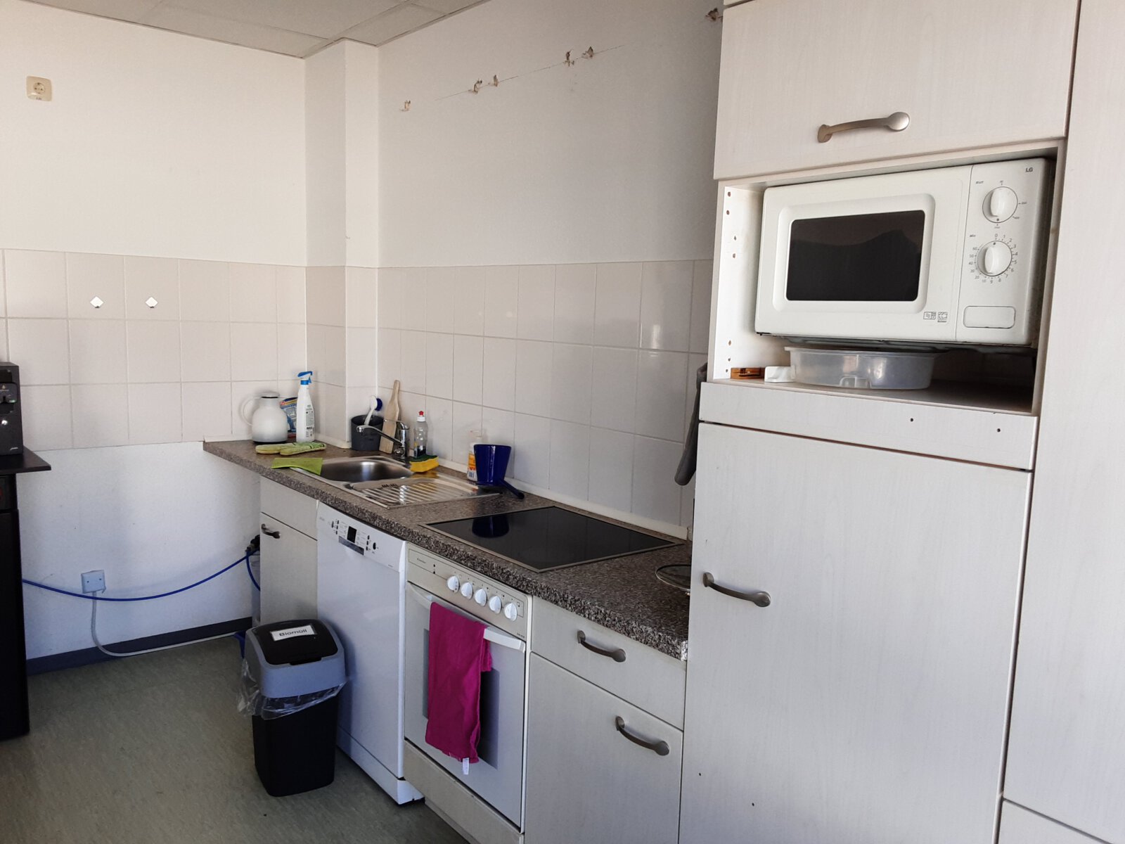 Durch innenarchitektonische Gestaltungsexpertise wurde dieser Riegel in weitere Nutzungsbereiche unterteilt, um die Möglichkeit einer alternativen Nutzung zu gewährleisten. So beinhaltet der Küchenbereich nicht nur eine Getränkestation, einen erhöhten Tresen, der als Kommunikationszone dient, sondern ebenso einen Bereich mit Möglichkeit zum Essen, Austausch und Arbeiten.