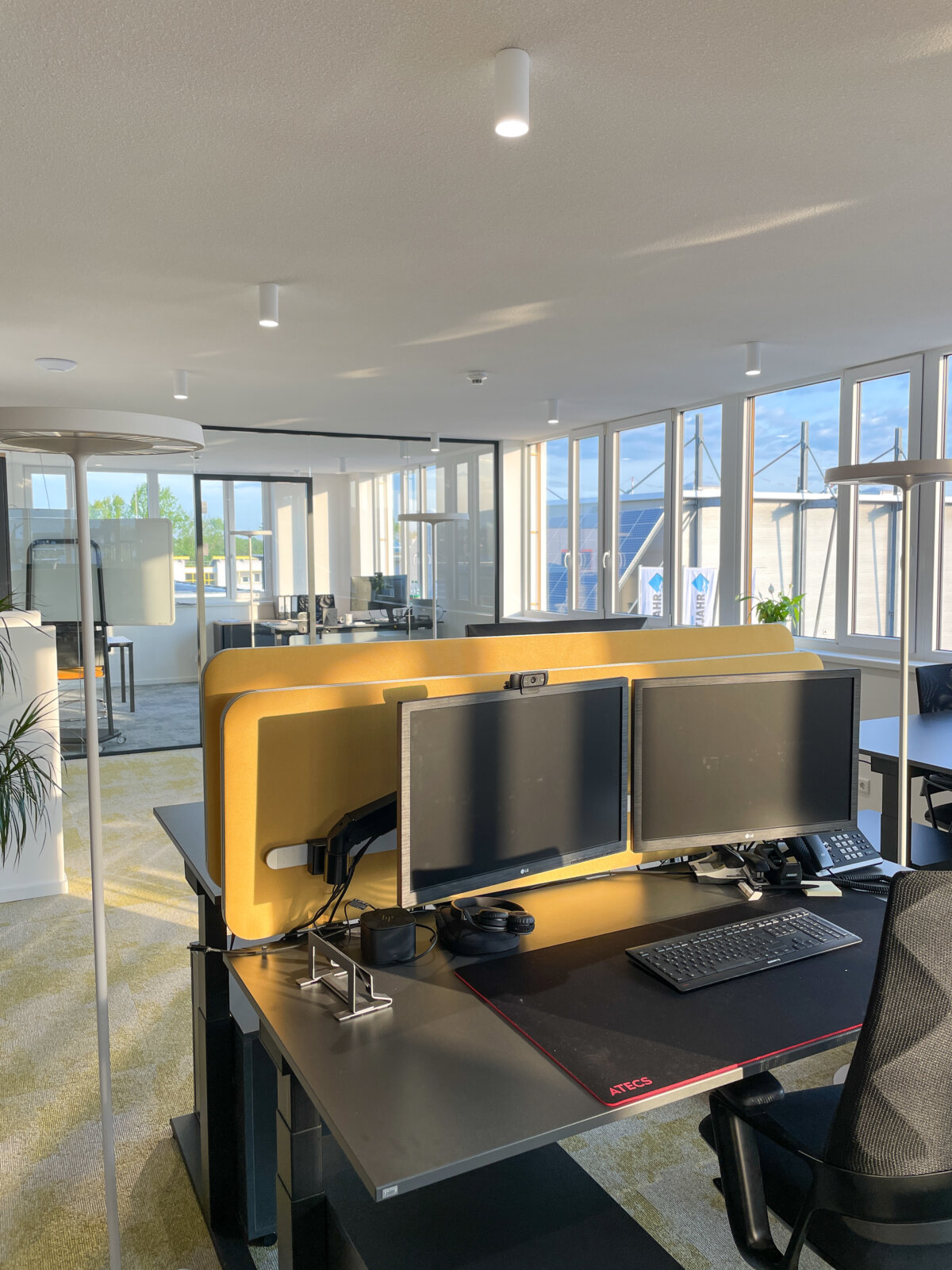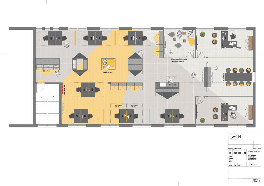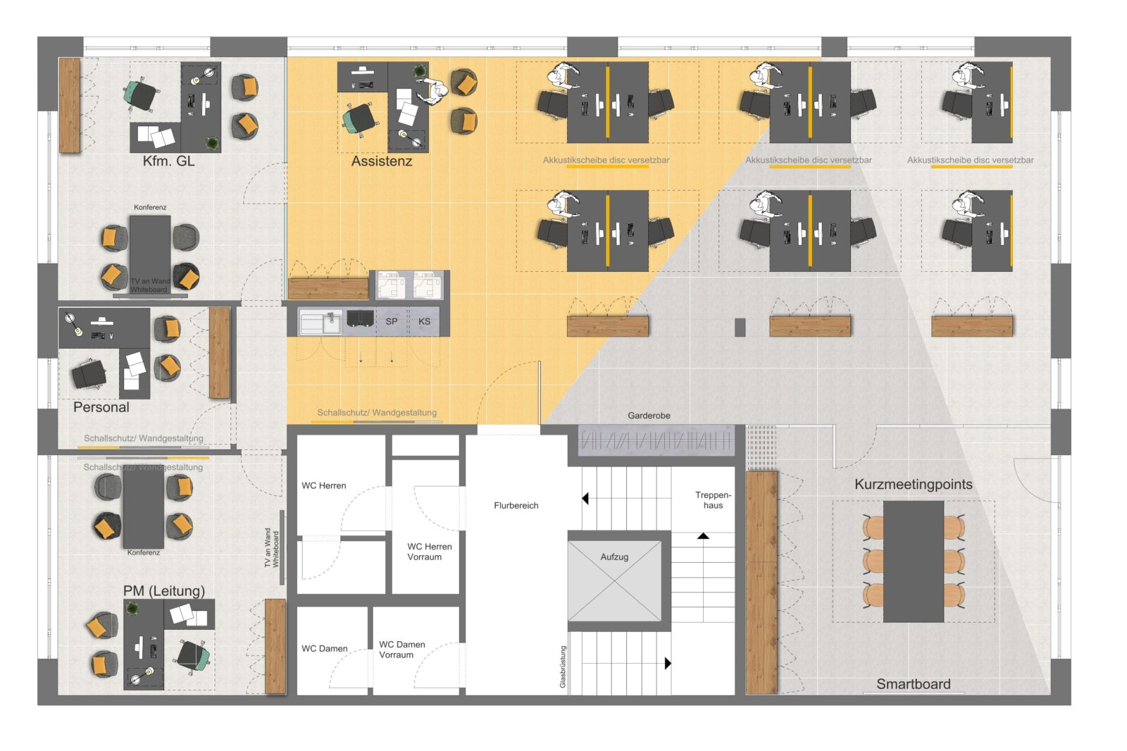 Bei der Konzepterstellung der beiden Gebäude, die aus unterschiedlichen Baujahren stammen, sollte die Fläche des 1. Bauabschnitts in eine Open Space- Fläche mit einem flexibel abtrennbaren Besprechungsraum und drei Einzelbüros für die Geschäftsleitung und das Personalmanagement umgewandelt werden. Ergänzend wurden die Flächen im Gebäudeteil der weiteren Bauabschnitte mit weiteren Arbeitsplätzen im Open Space- Konzept entwickelt und mit einer großzügigen Kantine, die Platz für 64 Mitarbeiter bietet und flexibel für Veranstaltungen genutzt werden kann, ausgestattet.