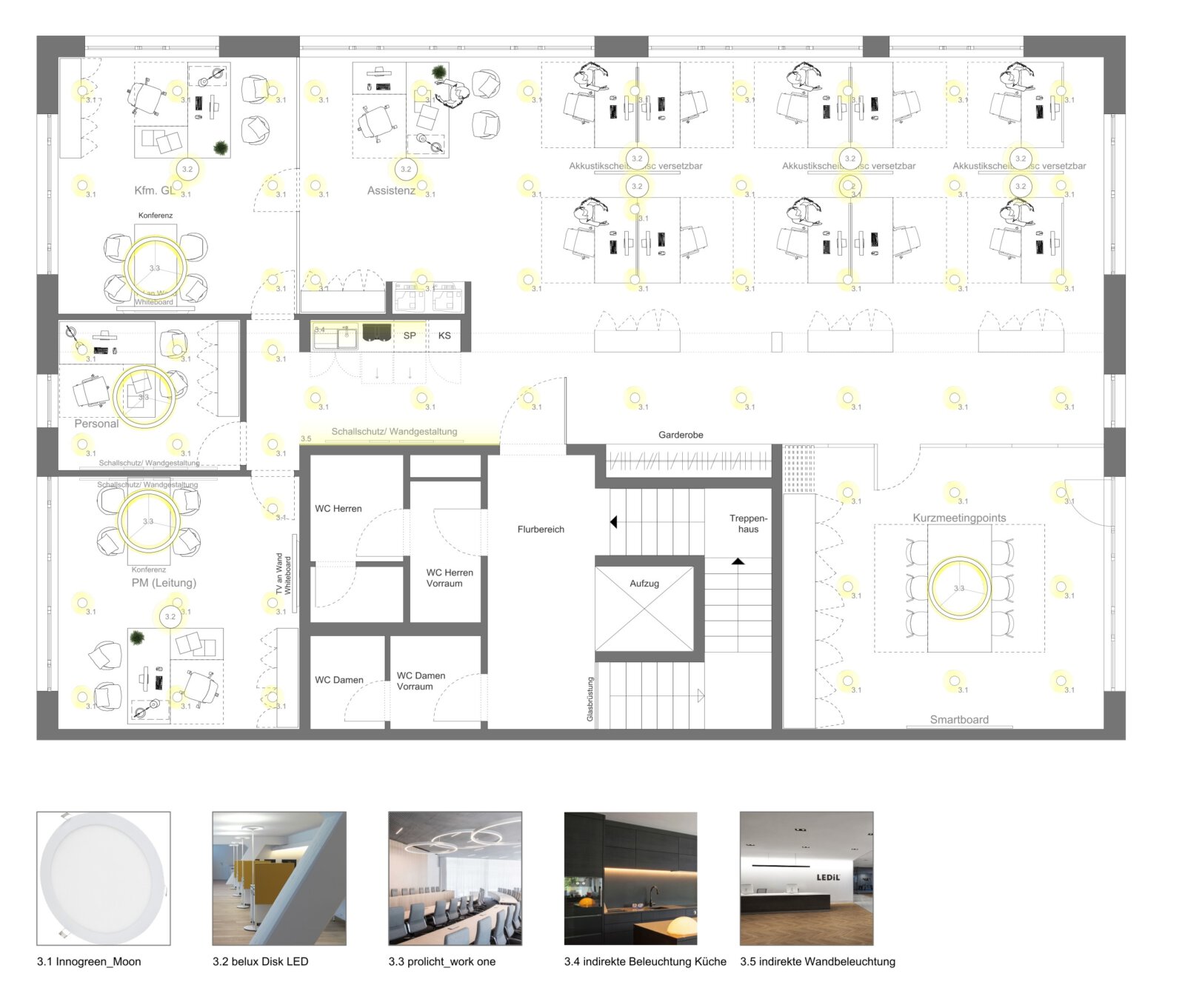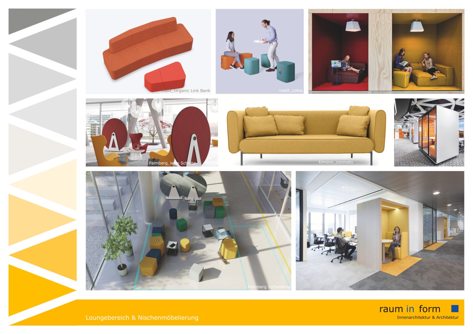 Auch für die Büroräumlichkeiten des Unternehmens wurden mehrere Konzepte erarbeitet, die sich unter Berücksichtigung der Arbeitsstättenrichtlinien und von raum in form- Innenarchitektur & Architektur entwickelter innenarchitektonischer Gestaltungsmerkmale in einem Finalkonzept zusammengeführt wurden.