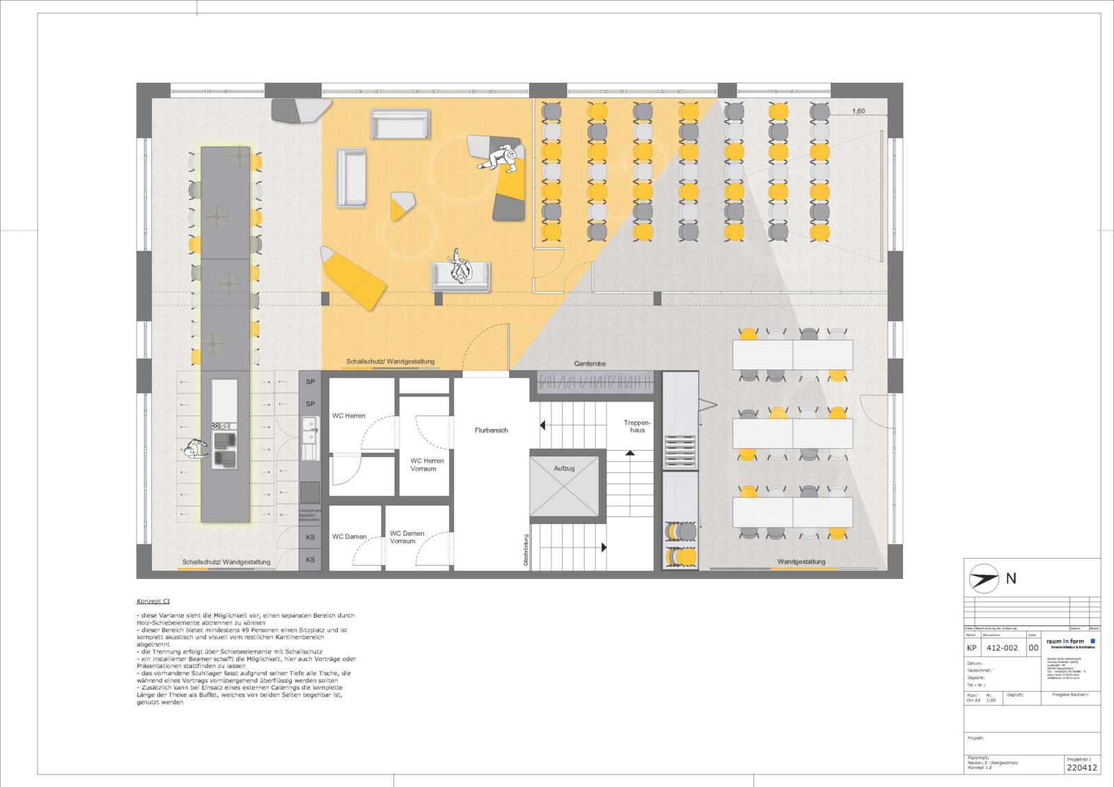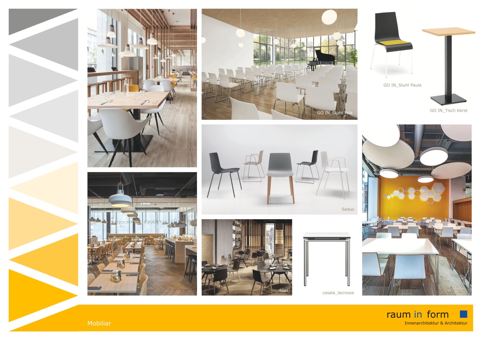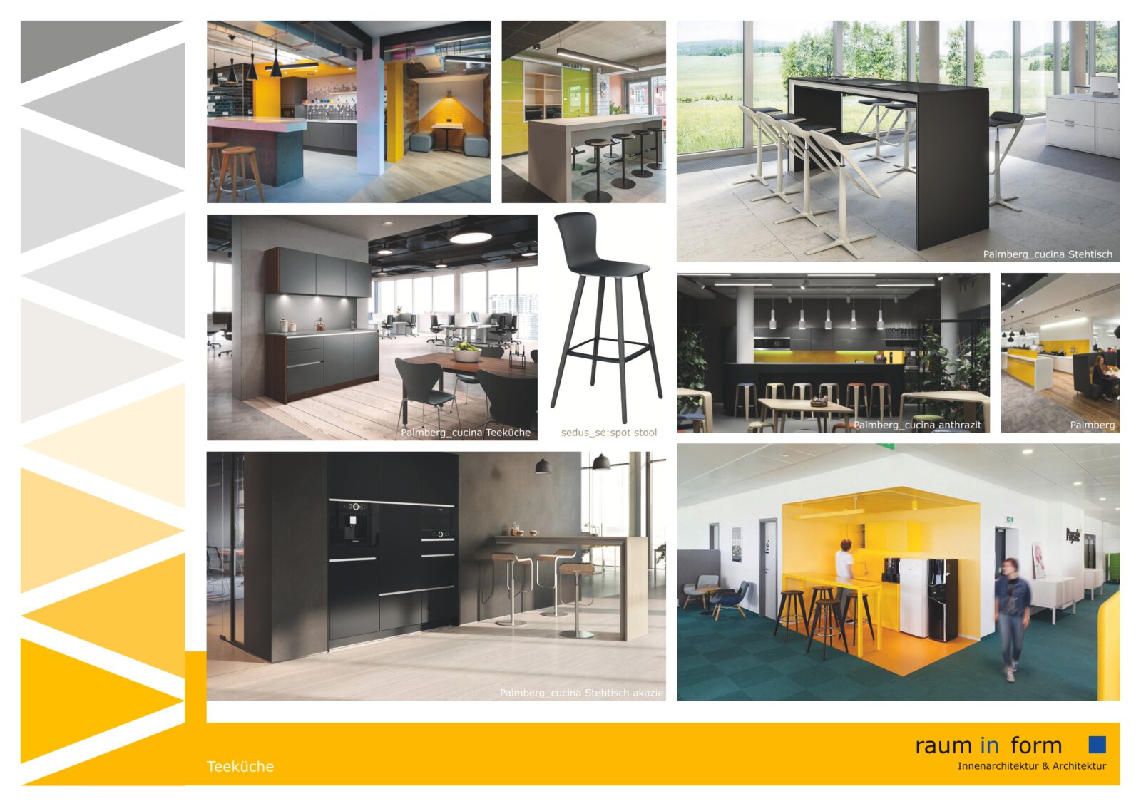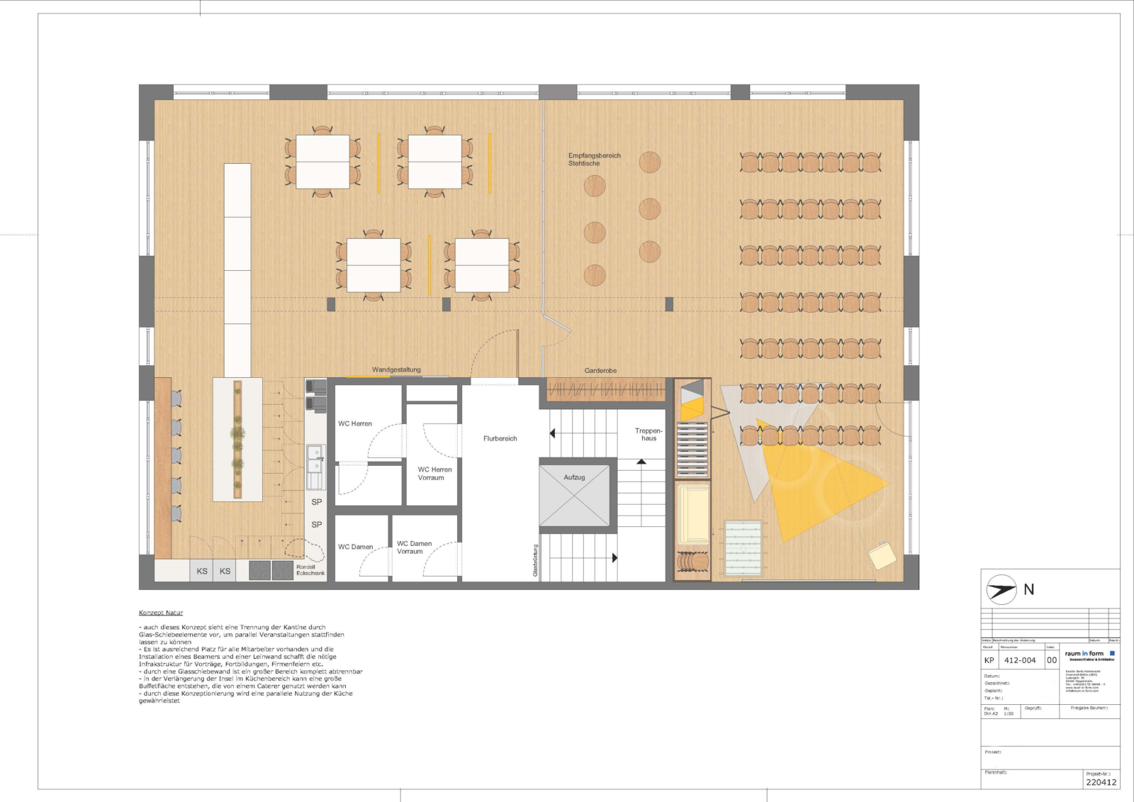 In der Konzepterstellungsphase wurden mehrere Entwürfe entwickelt, um alle Mitarbeiter entsprechend der verschiedenen Abteilungen und der jeweiligen Anforderungen im Hinblick auf die interne Infrastruktur und der Einbindung bestehender Abläufe unterzubringen. In diesem Zuge entwickelte das raum in form- Projektteam, das aus zwei Innenarchitektinnen unter Leitung der Innenarchitektin und Unternehmensinhaberin Kerstin Bertz-Helmbrecht unter Berücksichtigung der Wünsche und Anforderungen der Bauherren eine zentrale Anlaufstelle für alle Mitarbeiter. Hierbei wurde der Kantinenbereich in unterschiedliche Bereiche zoniert, wobei zwei vertikale und zwei horizontale Riegel zum einen die Verkehrszone und den Loungebereich und zum anderen die Küche mit Theke sowie den großzügigen Speisebereich beinhalten.