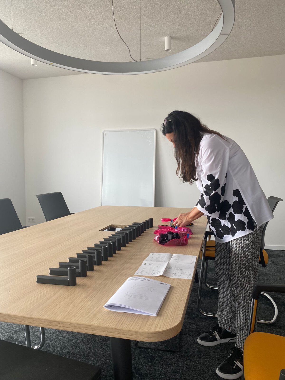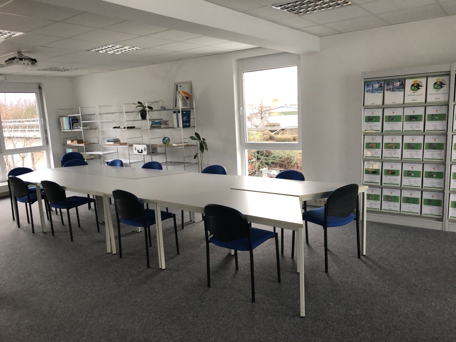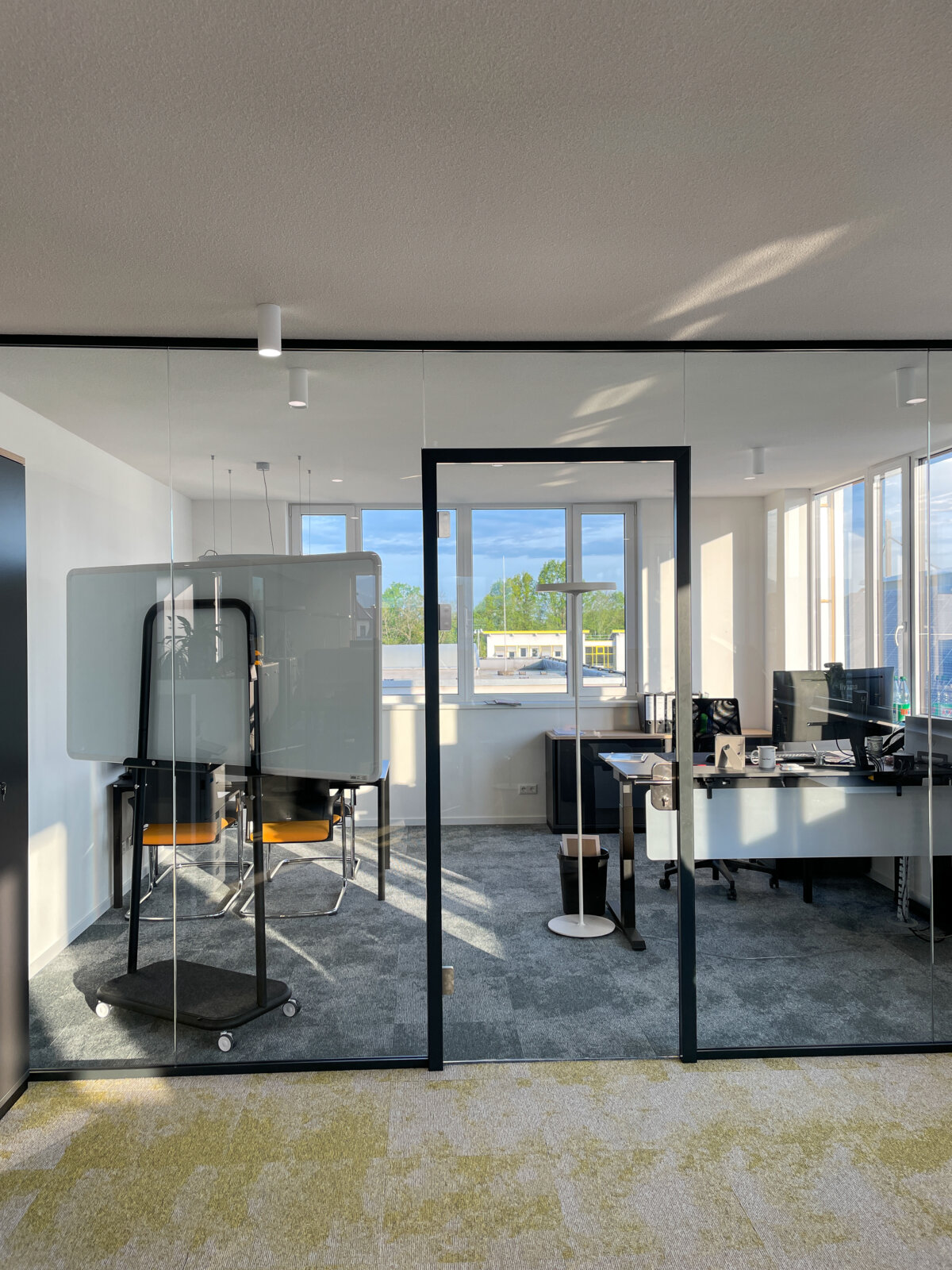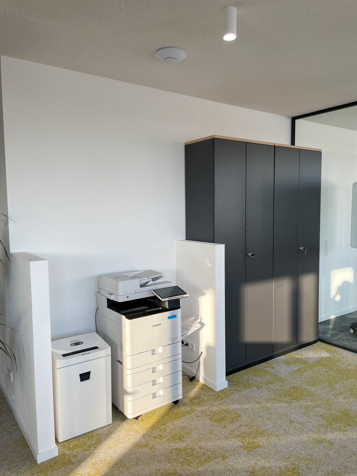 Sämtliche Bauleistungen wurden innerhalb des vor Baubeginn erarbeiteten engmaschigen Bauzeitenplans erbracht- das Objekt wurde nach Fertigstellung der Bauleistungen in den letzten zwei Wochen von raum in form- Objekteinrichtungen unter der Leitung der Unternehmensinhaberin, der Innenarchitektin Kerstin Bertz- Helmbrecht, komplett neu eingerichtet. Sämtliches neues Mobiliar wurde frühzeitig ausgewählt, bestellt und in das raum in form- Zentrallager in Heppenheim geliefert, so dass die Lieferung und Einrichtung des 1. Bauabschnitts des Bürogebäudes ohne jegliche Verzögerungen direkt nach Fertigstellung der Baumaßnahmen erfolgen konnte und die Büros zwei Wochen vor dem geplanten Einzugstermin im September 2022 bezogen werden konnten.