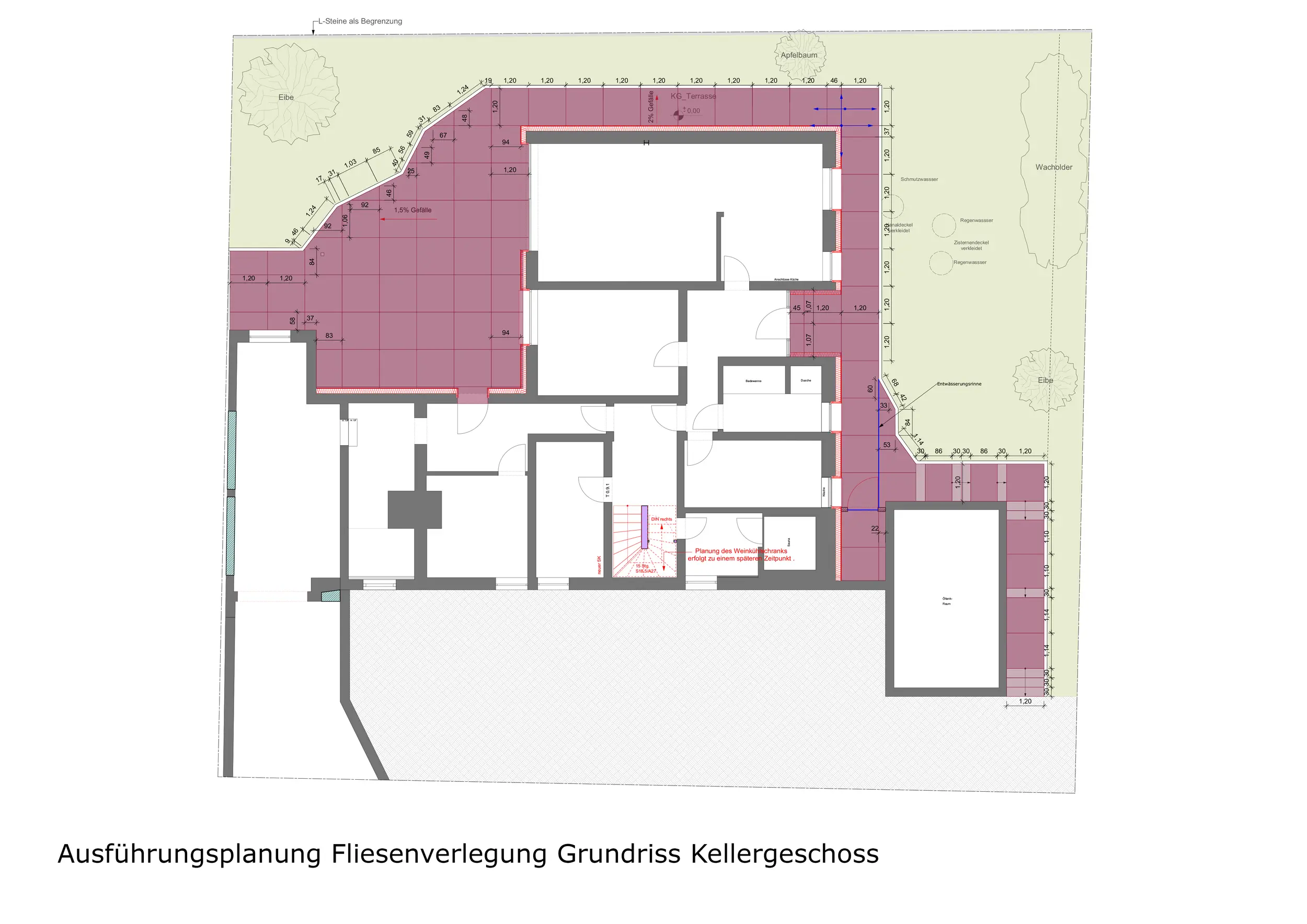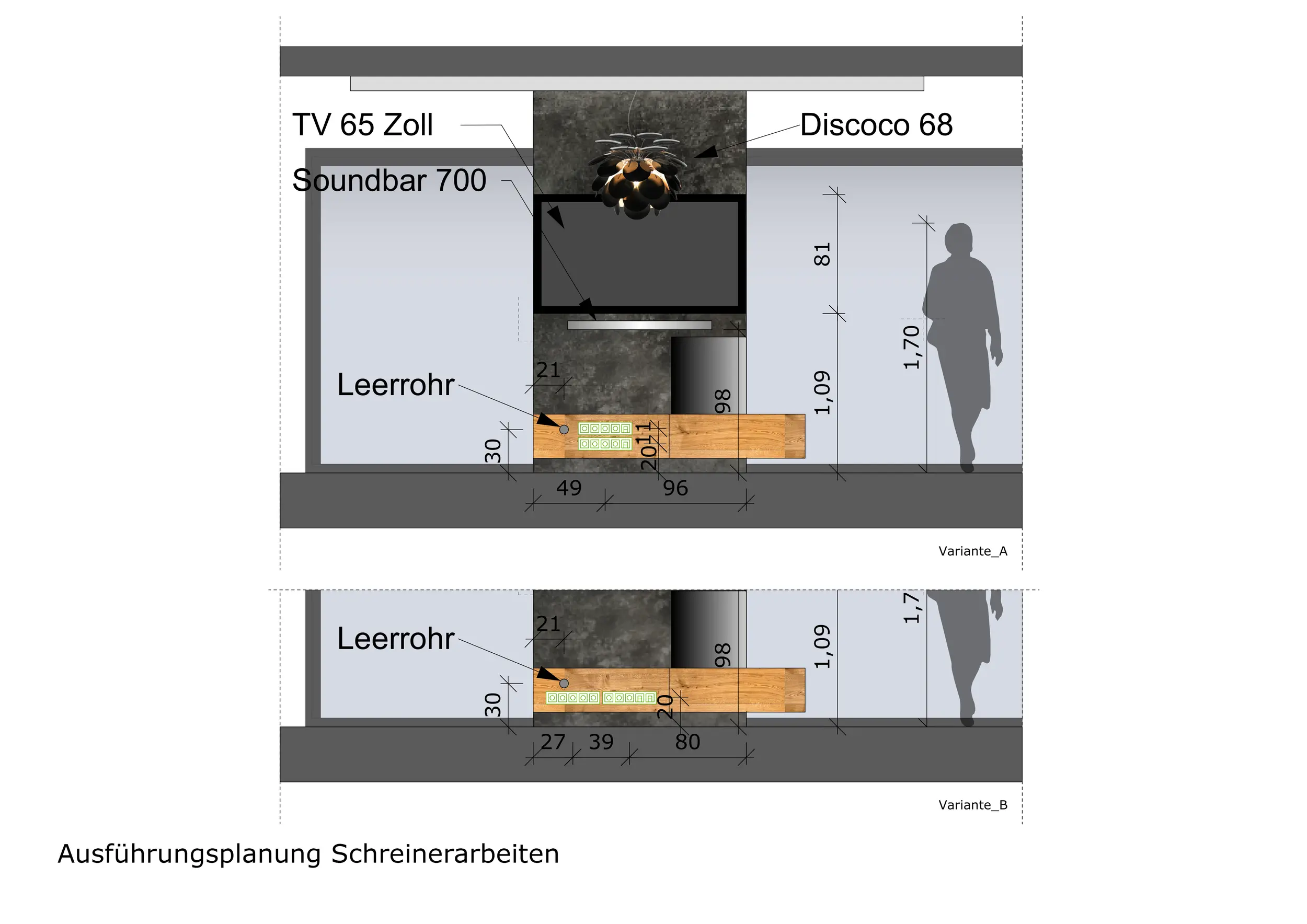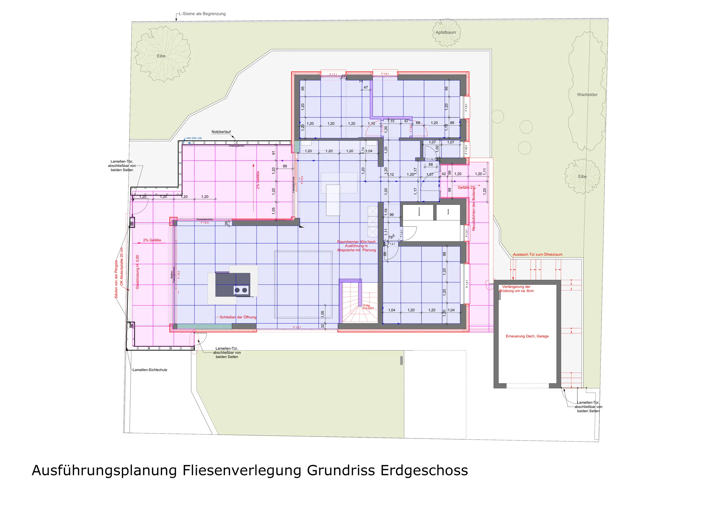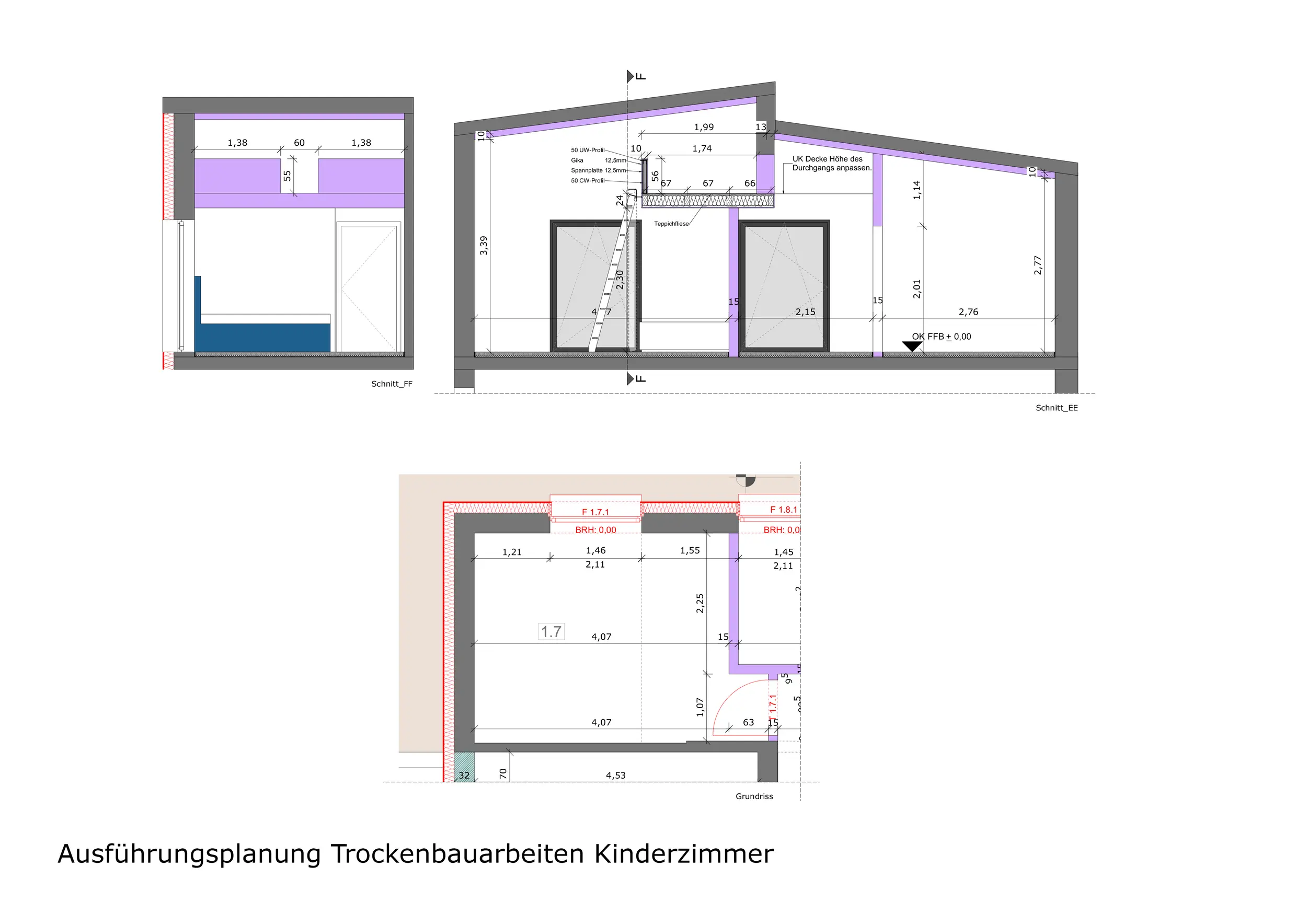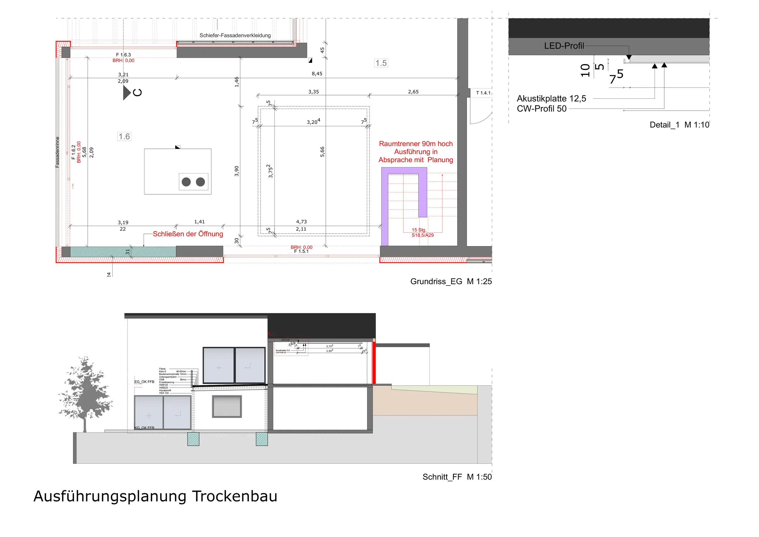 Im Anschluss an die Konzeptphase wurde „raum in form – Innenarchitektur & Architektur“ mit den Ausführungsplanungen beauftragt. Sämtliche Bereiche des Umbaus wurden detailliert geplant – von Küche, Fenstern und Türen über die Kaminanlage im Wohn- und Essbereich bis hin zur Empore im Kinderzimmer sowie den Fliesen- und Verlegeplänen.