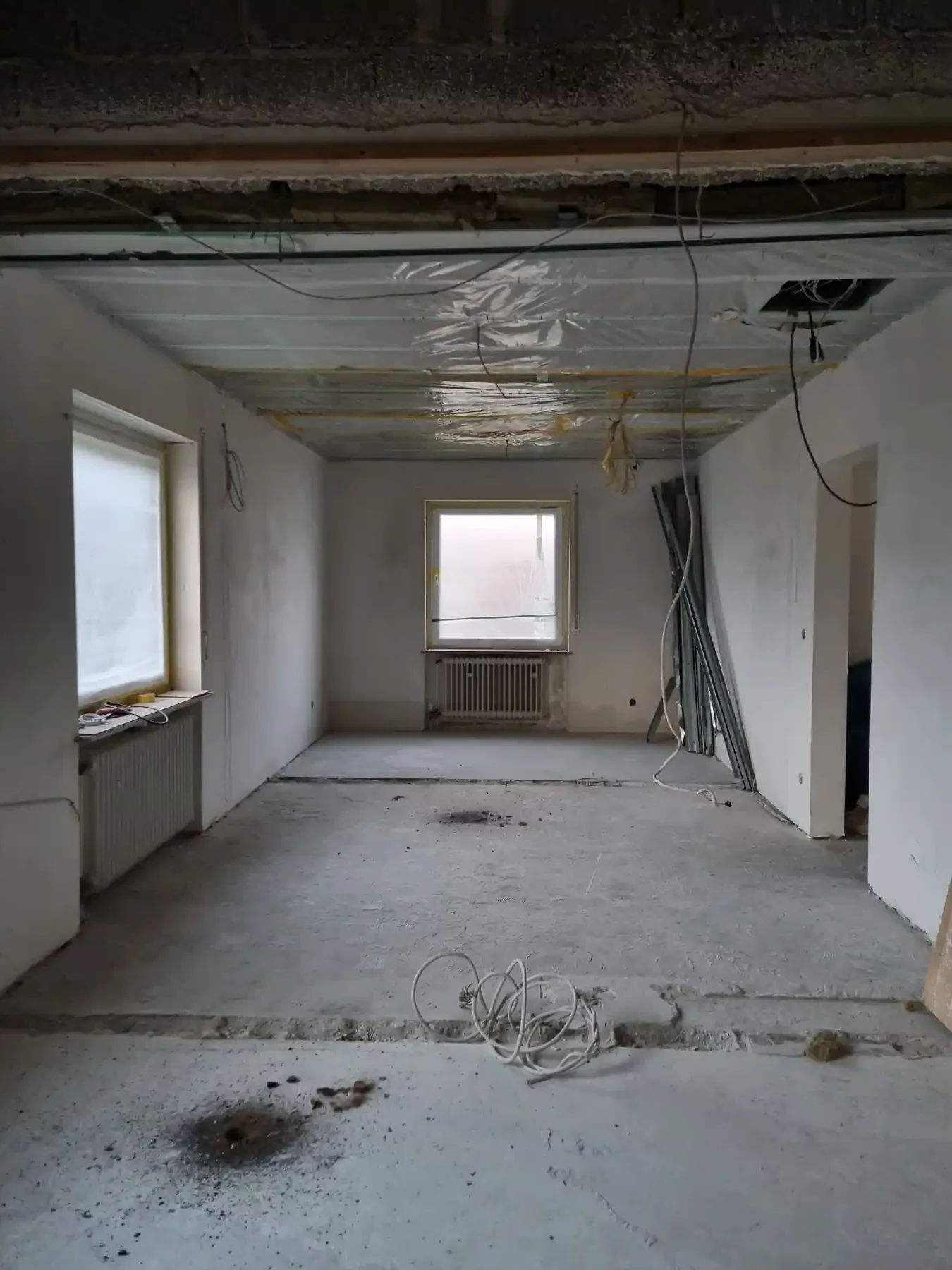 Zu Beginn der Bauarbeiten wurden die mehrschichtigen Bodenbeläge und Wandaufbauten zurückgebaut. Aufgrund des asphalthaltigen Estrichs musste dieser vollständig entfernt werden. In den neu eingebrachten Estrich wurde die Fußbodenheizung eingefräst und anschließend verfliest.