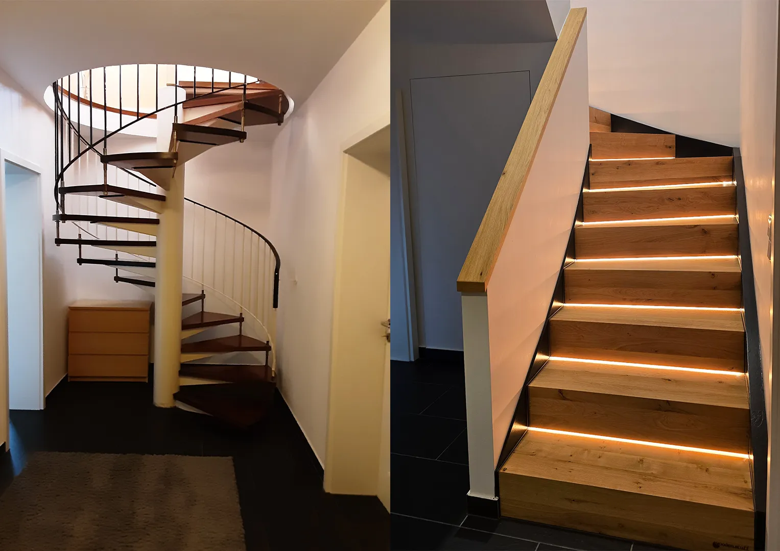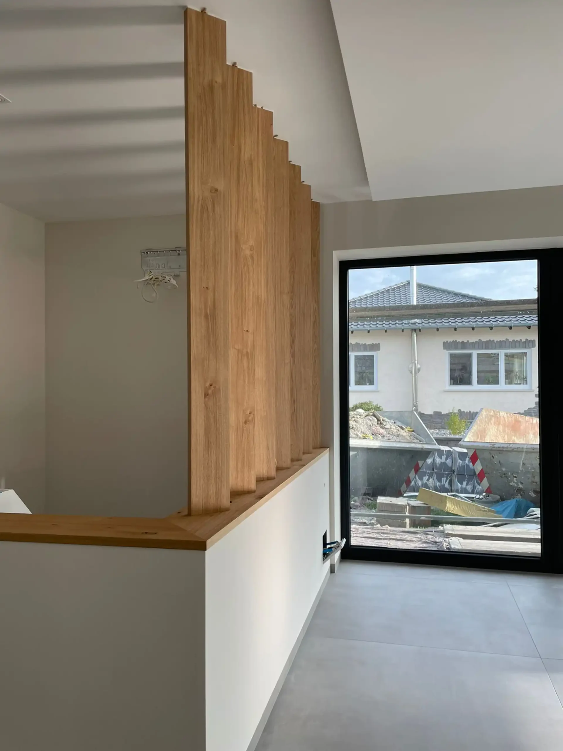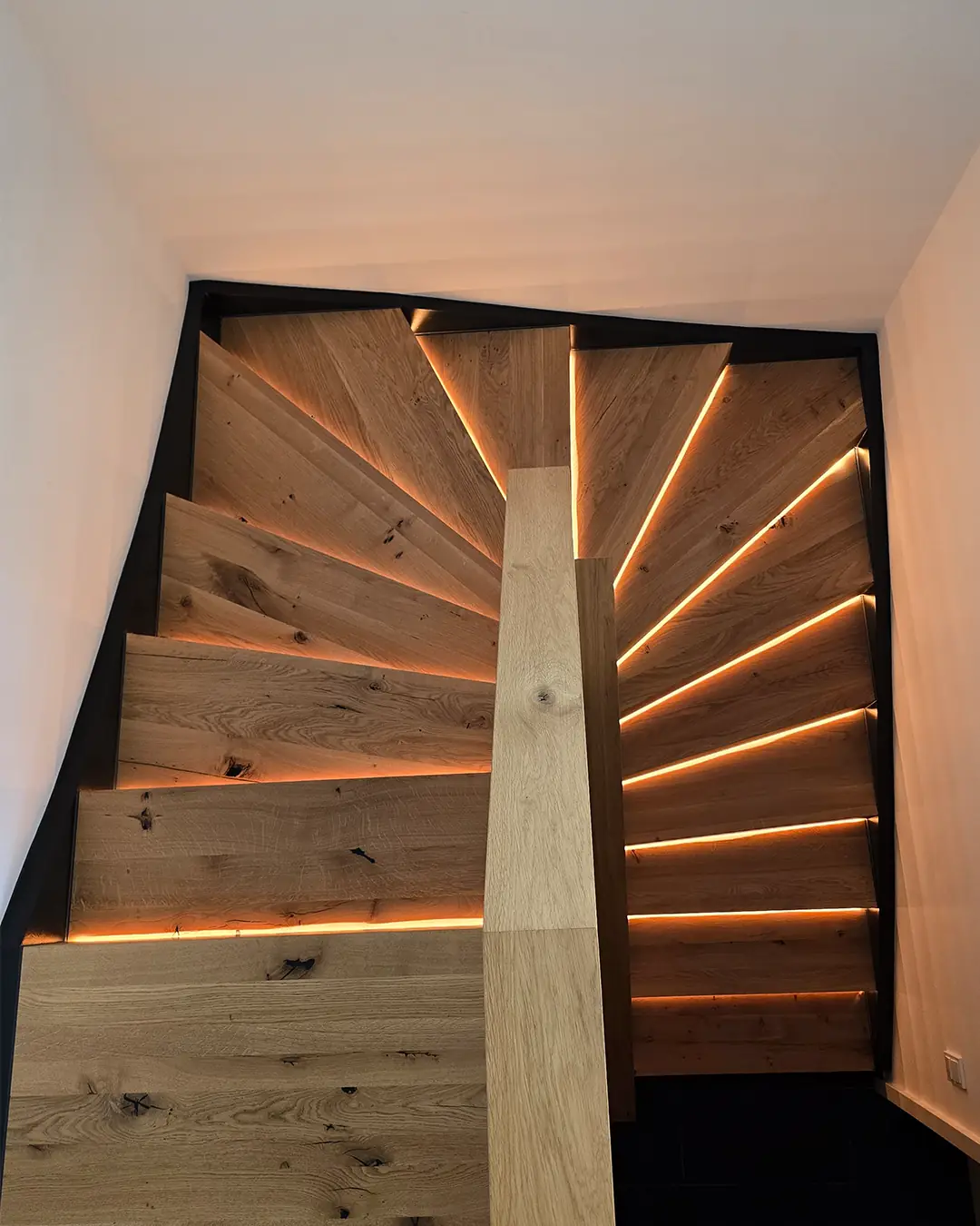 Die bestehende Wendeltreppe in das Kellergeschoss wurde durch eine neue halbgewendelte Stahlwangentreppe ersetzt, die mit Trockenbau verkleidet und mit Eichenholzstufen ausgestattet ist. Zur optischen Trennung von Wohn- und Treppenraum wurde ein Geländer mit integrierten vertikalen Eichenbohlen geplant und umgesetzt. Für die Sommermonate wurde im gesamten Wohnbereich eine Klimaanlage installiert.