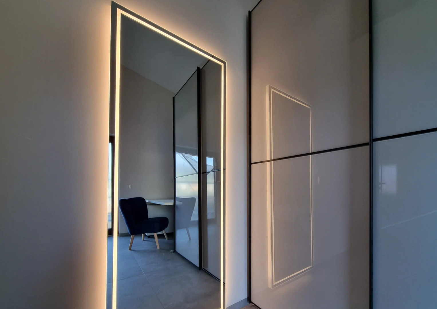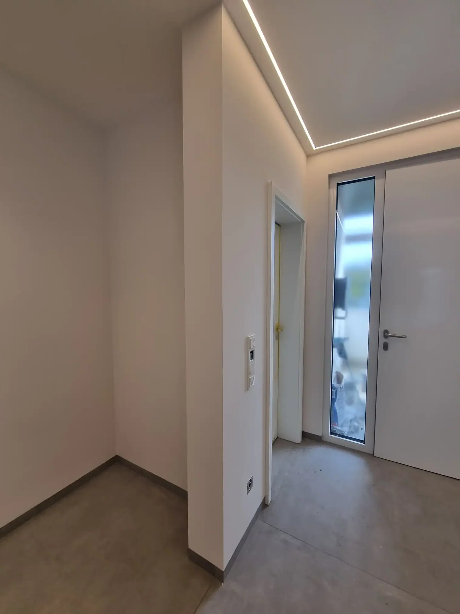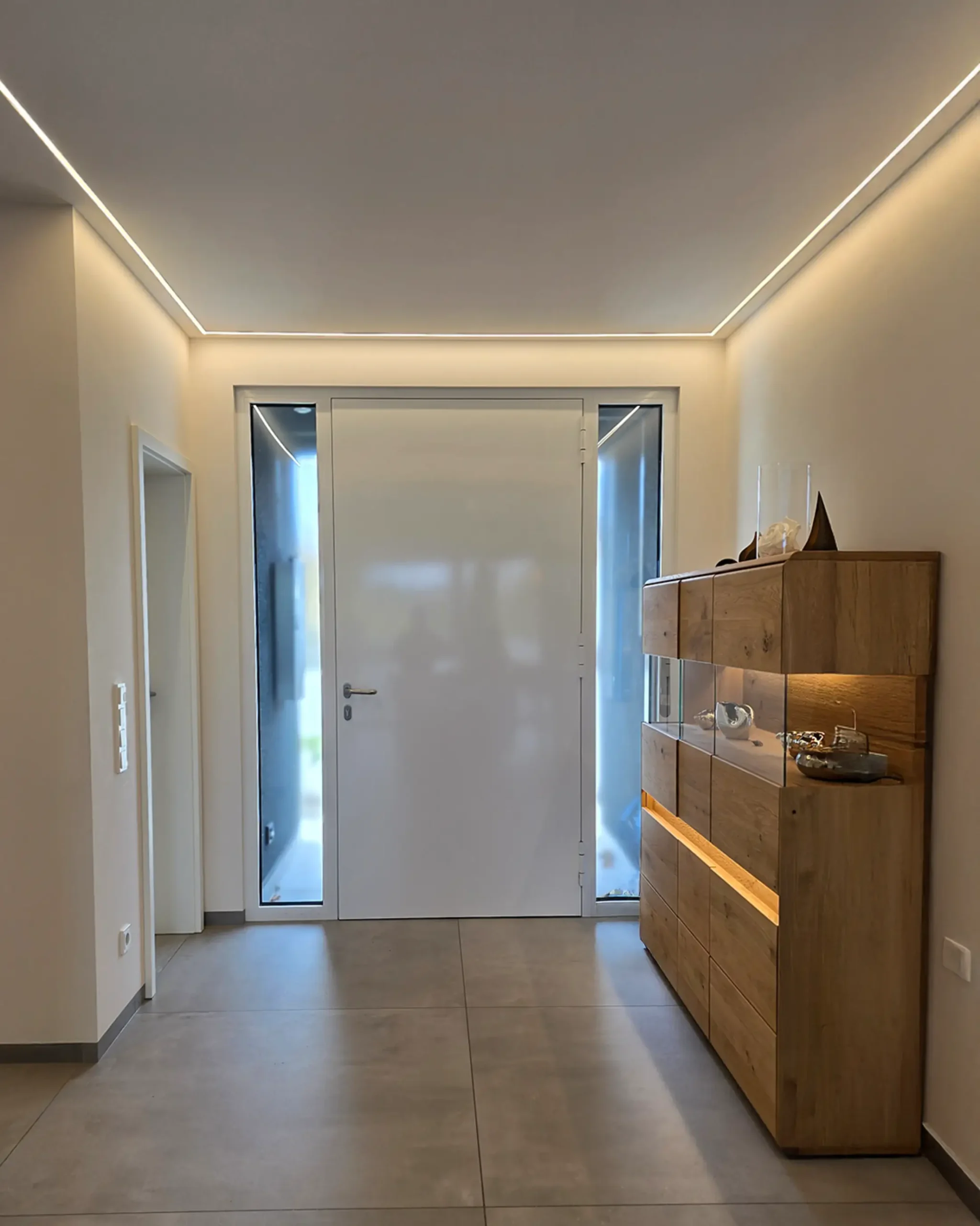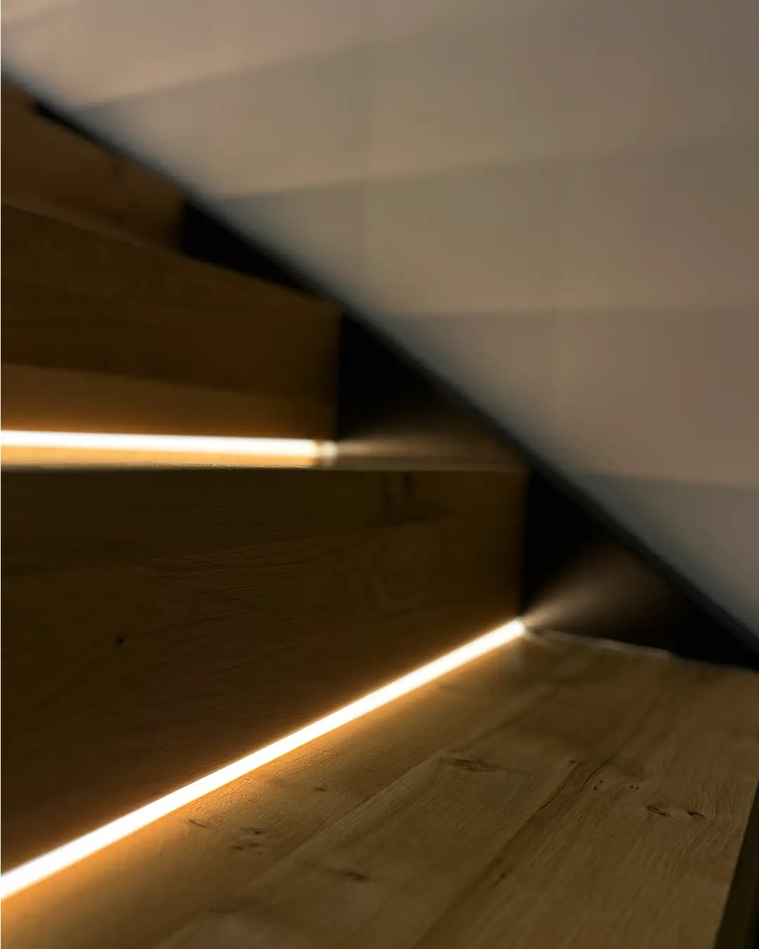 Im Obergeschoss wird das Beleuchtungskonzept des Erdgeschosses konsequent fortgeführt. Die Grundbeleuchtung erfolgt weiterhin durch in die Decke integrierte Spots, während Lichtvouten gezielt eingesetzt werden, um bestimmte Bereiche des Raumes hervorzuheben und eine angenehme Atmosphäre zu schaffen. In den Bädern sorgt indirekte Beleuchtung in Nischen und hinter den Spiegeln für eine gleichmäßige Ausleuchtung. Ergänzt wird das Konzept im Obergeschoss durch Wandleuchten im Schlafbereich sowie Stehleuchten, die als flexible Lichtquellen dienen und je nach Bedarf eine behagliche Beleuchtung ermöglichen, wodurch das Raumkonzept stimmig abgerundet wird.