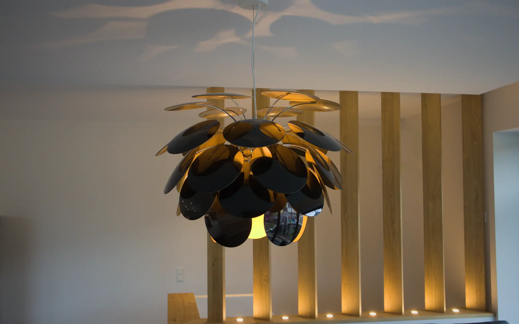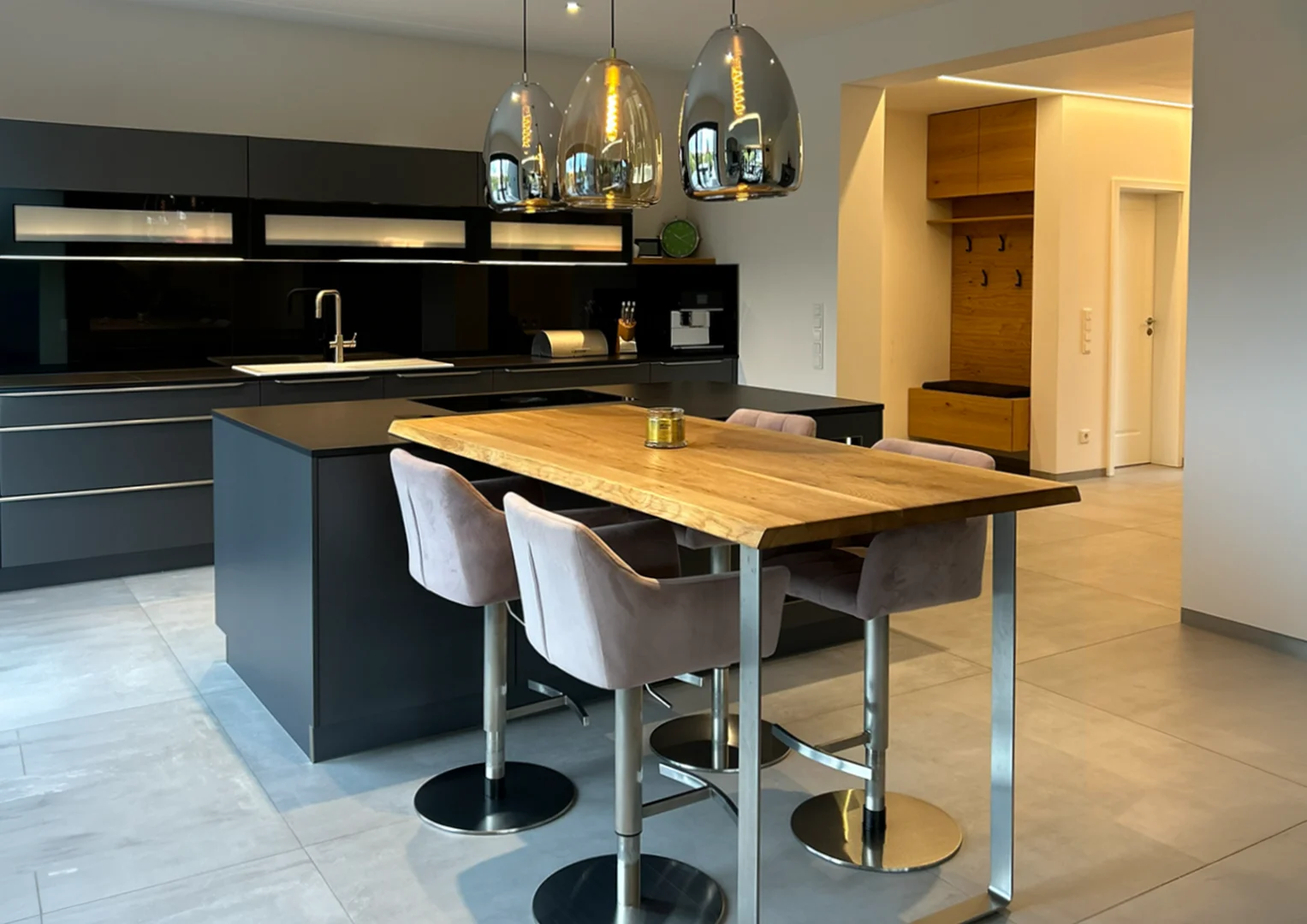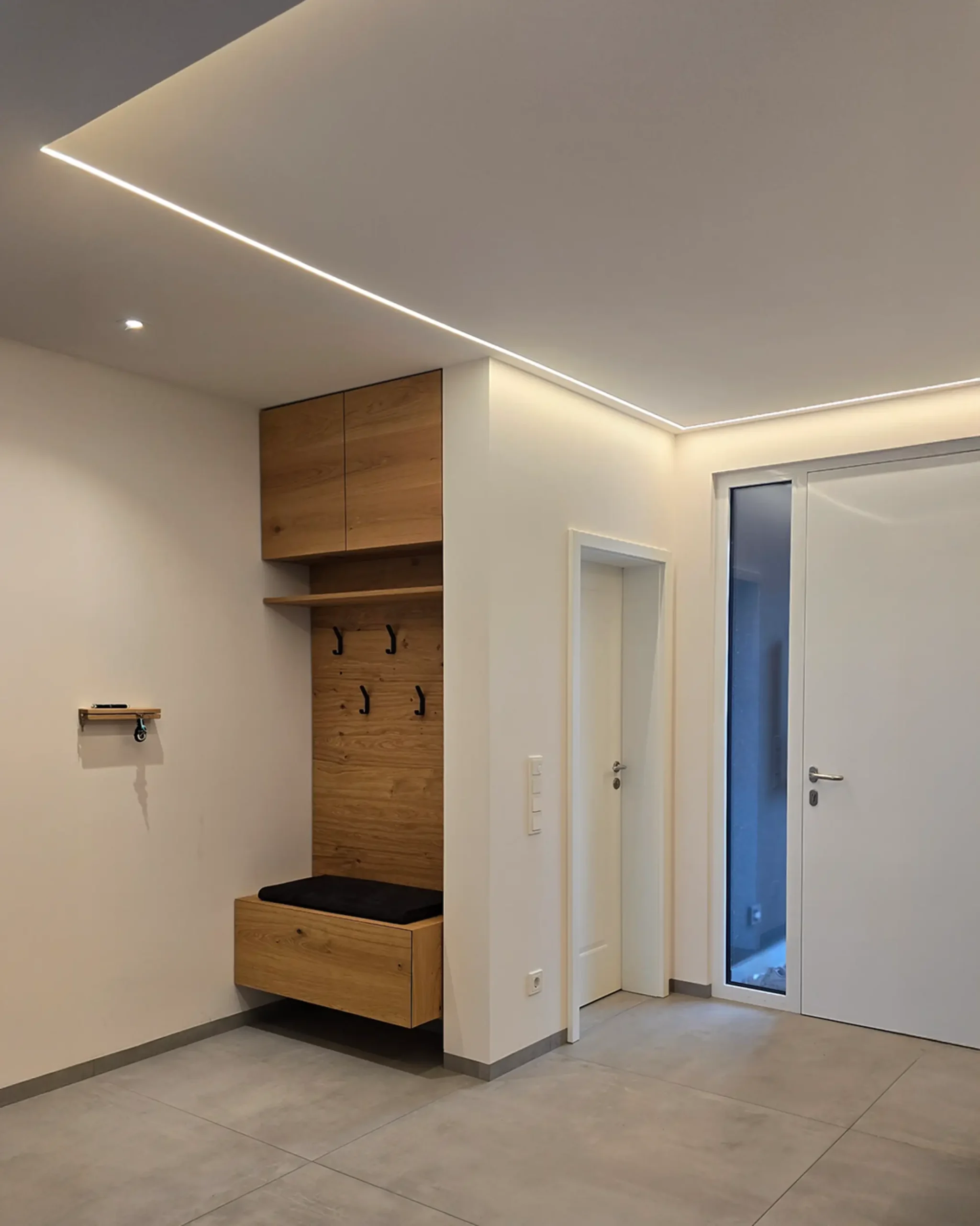 Hierbei wurde eine Grundbeleuchtung durch Einbauspots geplant. Diese wird ergänzt durch Lichtvouten im Wohnzimmer, welche eine indirekte, gemütliche Ausleuchtung gewährleisten. Zusätzlich wurde im Essbereich die Möglichkeit für viele kleine Pendelleuchten vorgesehen, die den Raum mit einer Akzentbeleuchtung bereichert. Die geplante indirekte Beleuchtung in Nischen und Schränken trägt zur Steigerung der Raumatmosphäre bei und setzt gezielte Lichtakzente, die eine stimmungsvolle Wirkung erzeugen.