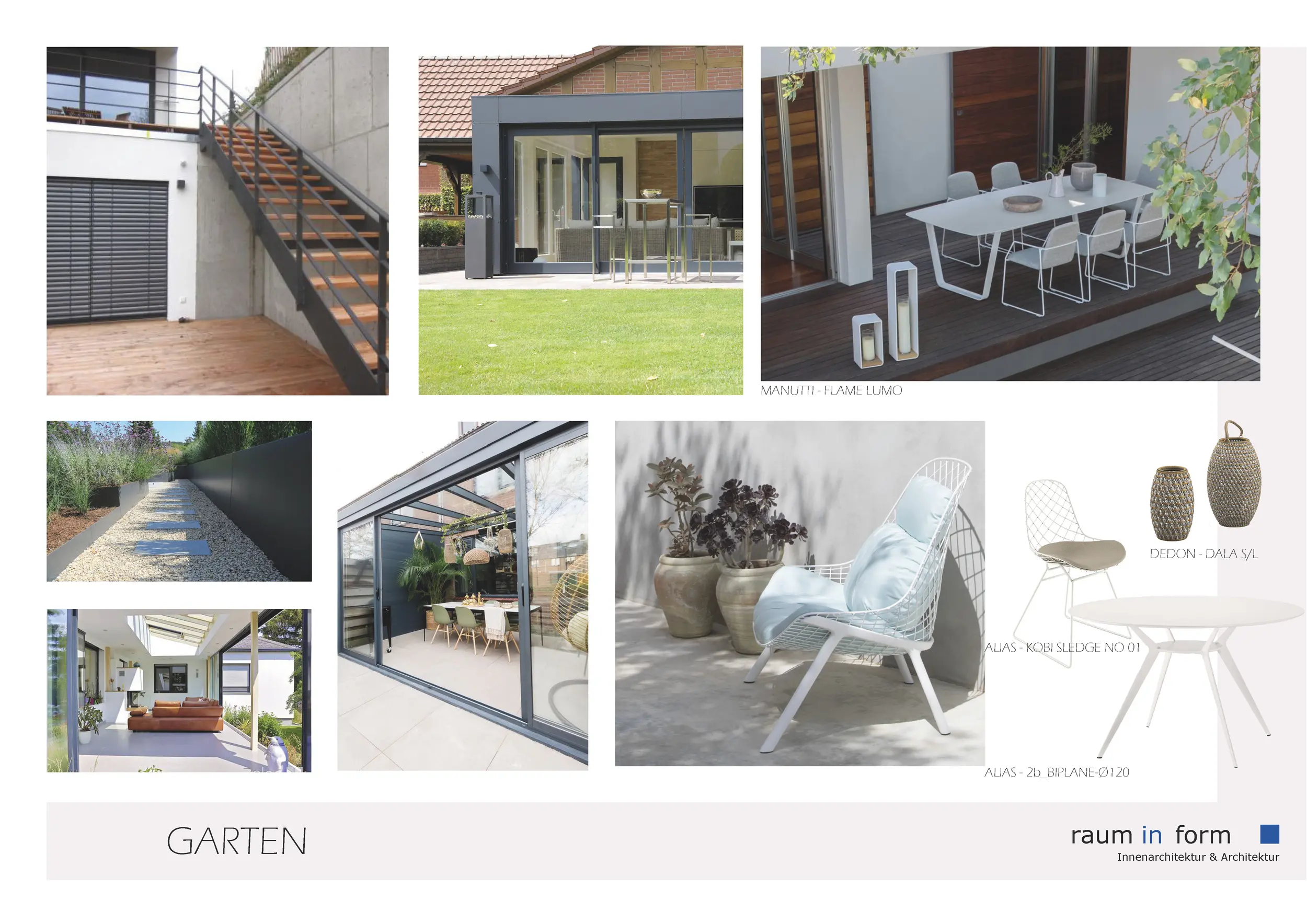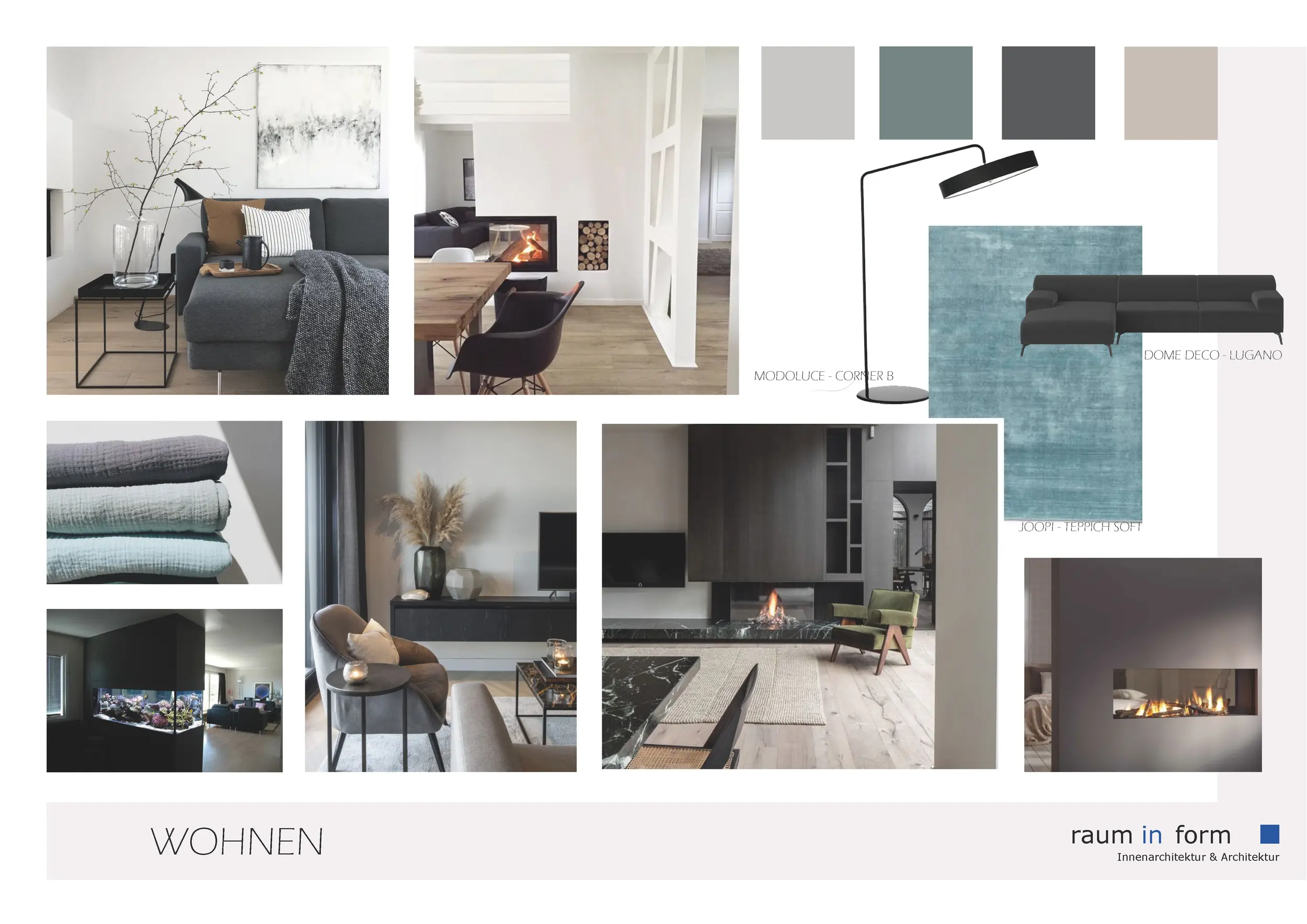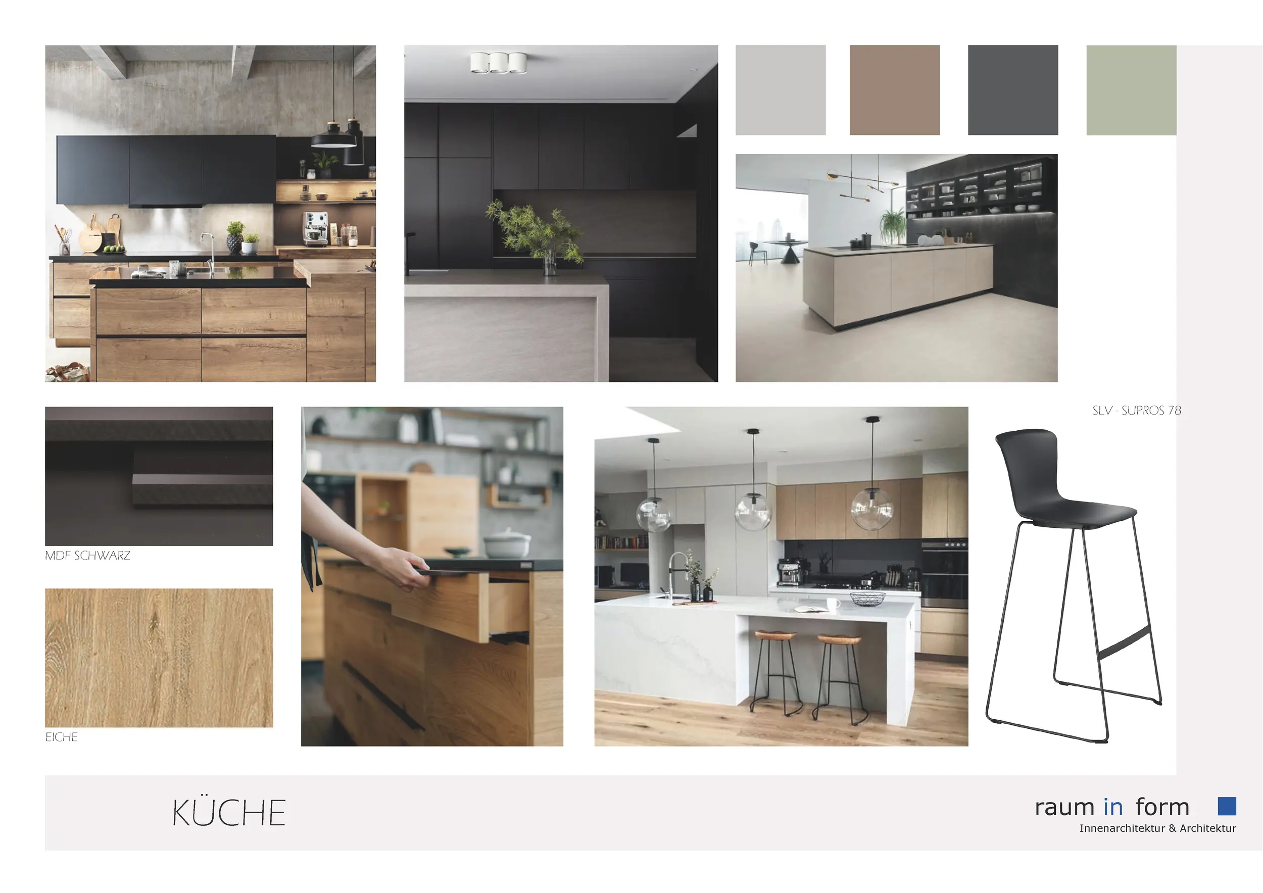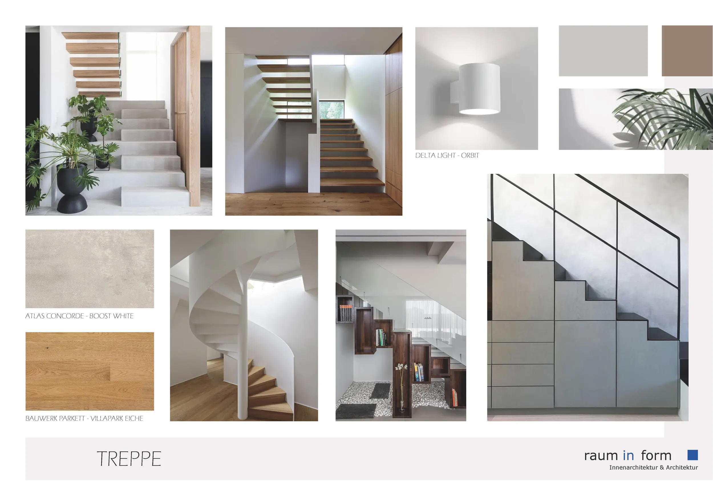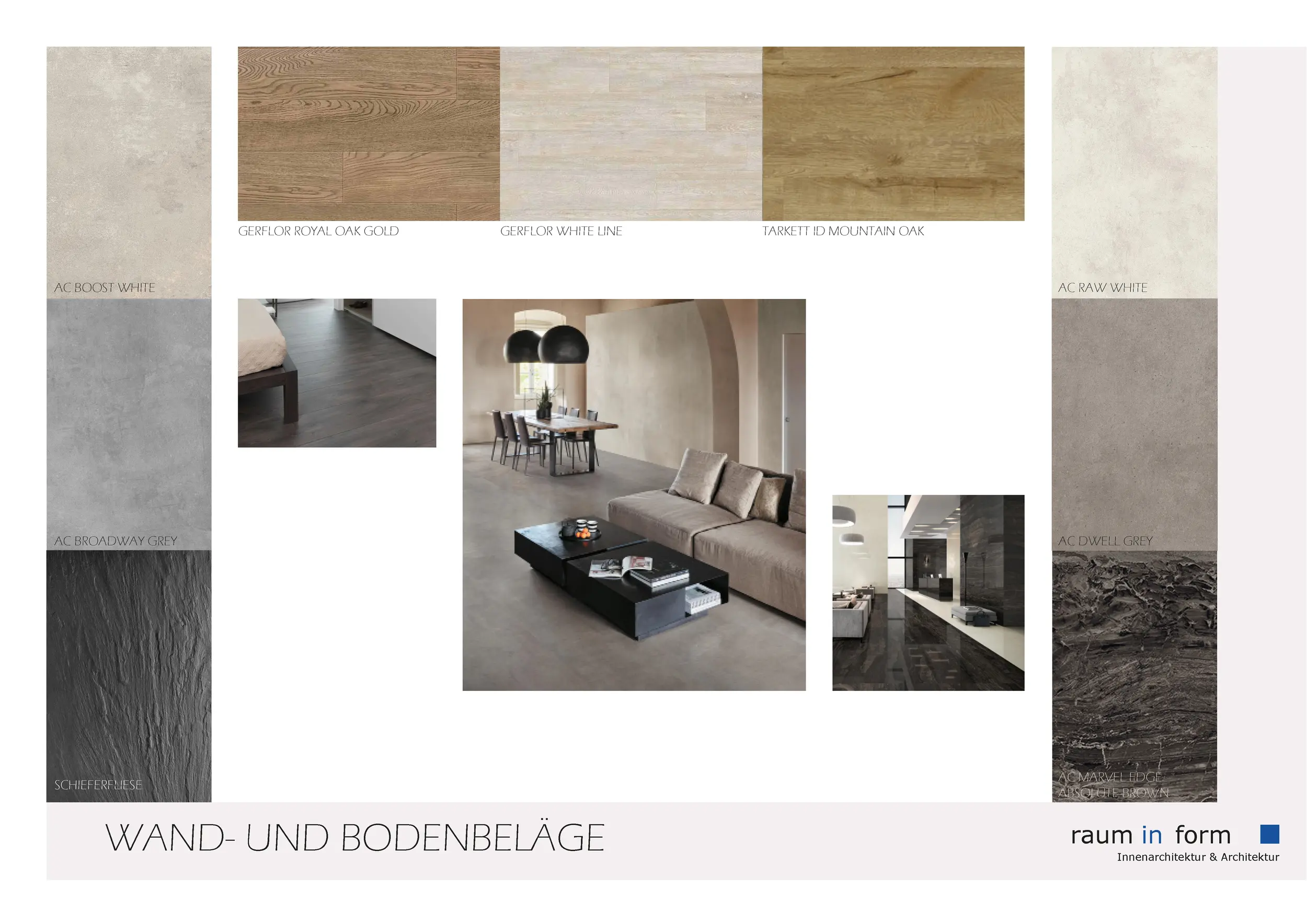 Ergänzend zu den Konzeptplanungen entwickelte „raum in form – Innenarchitektur & Architektur“ auf Wunsch der Bauherren mehrere Moodboards. In zuvor definierten Kategorien wurden jeweils A3-Layouts mit material- und gestaltungsbezogenen Vorschlägen erstellt, die auf das Projekt und die Vorlieben der Bauherren abgestimmt waren.