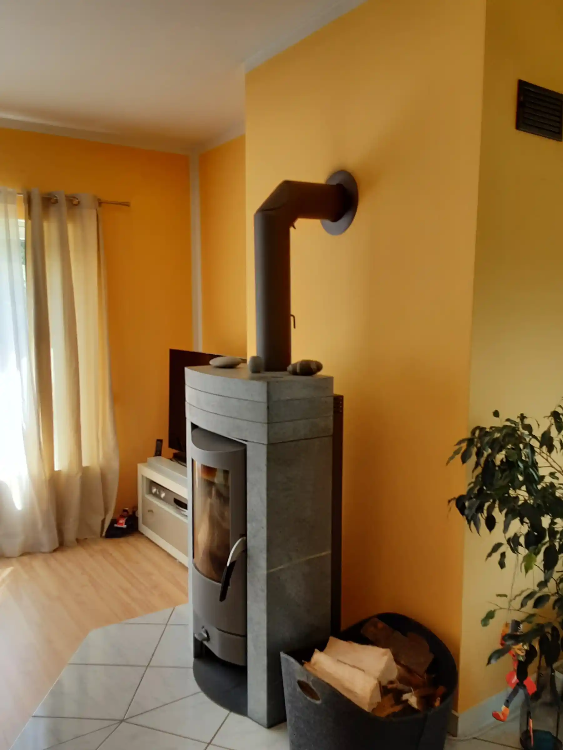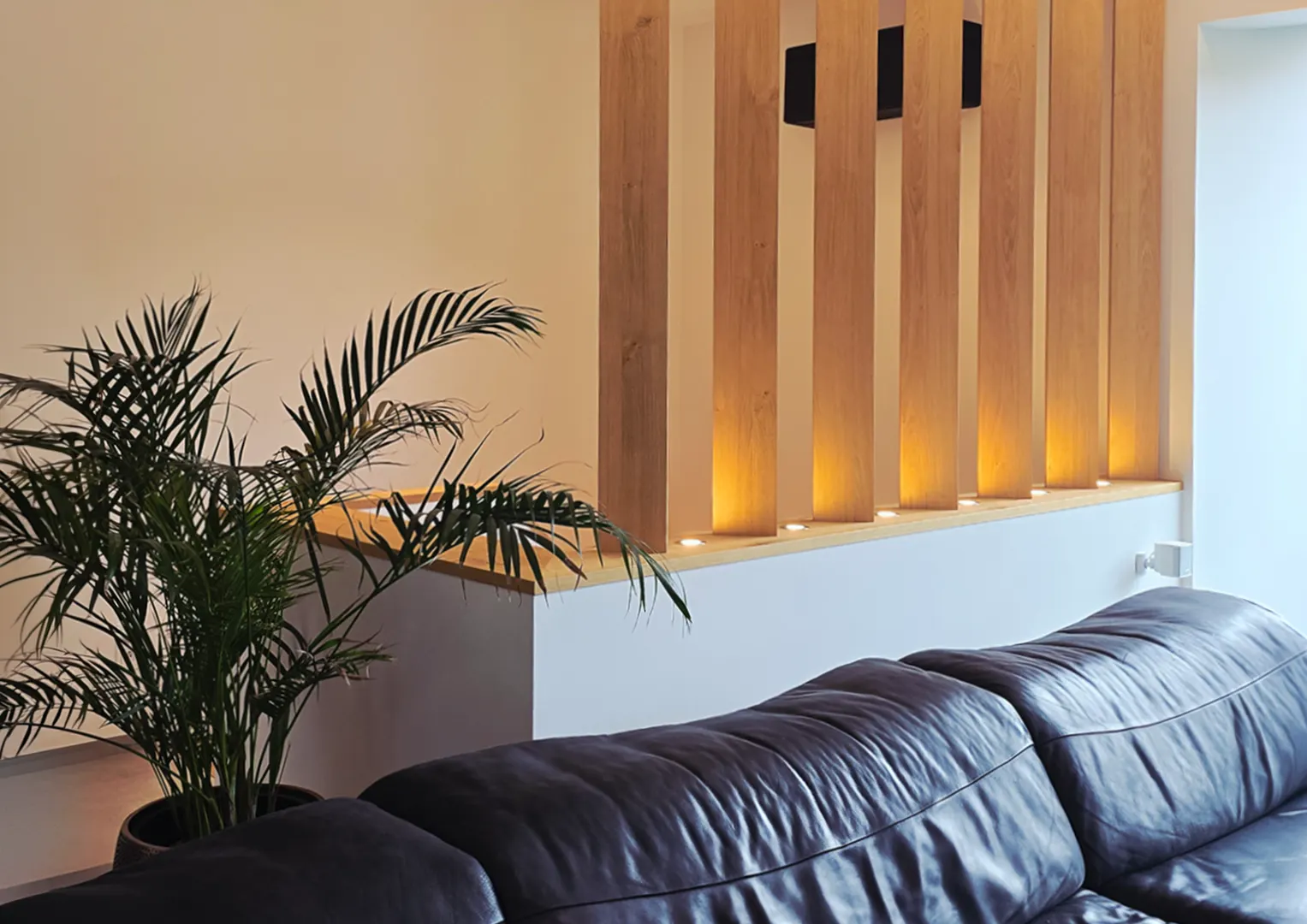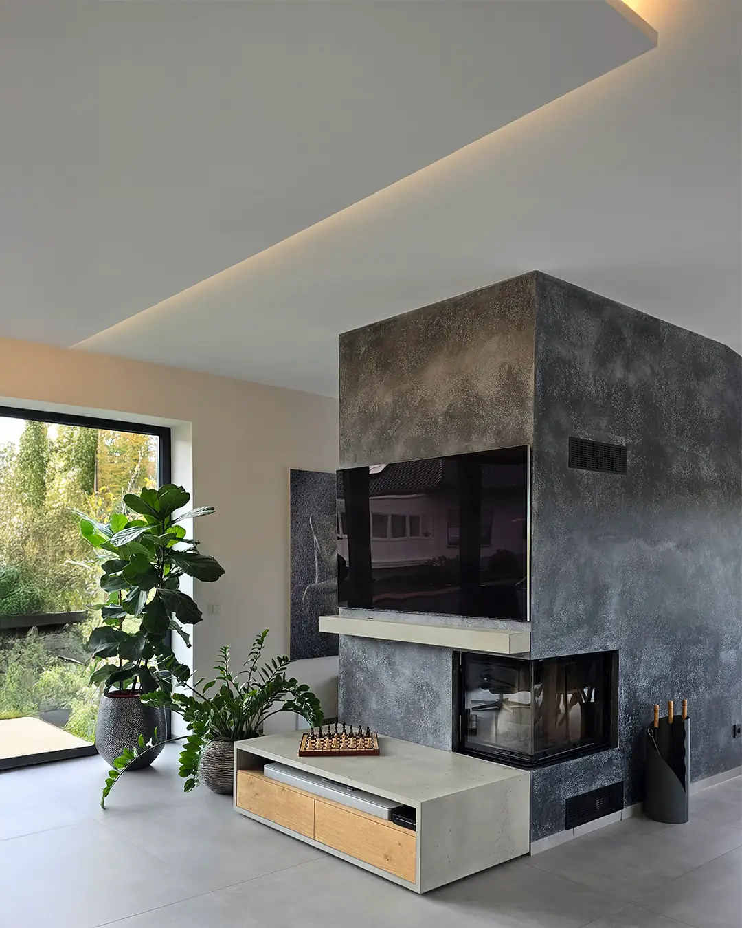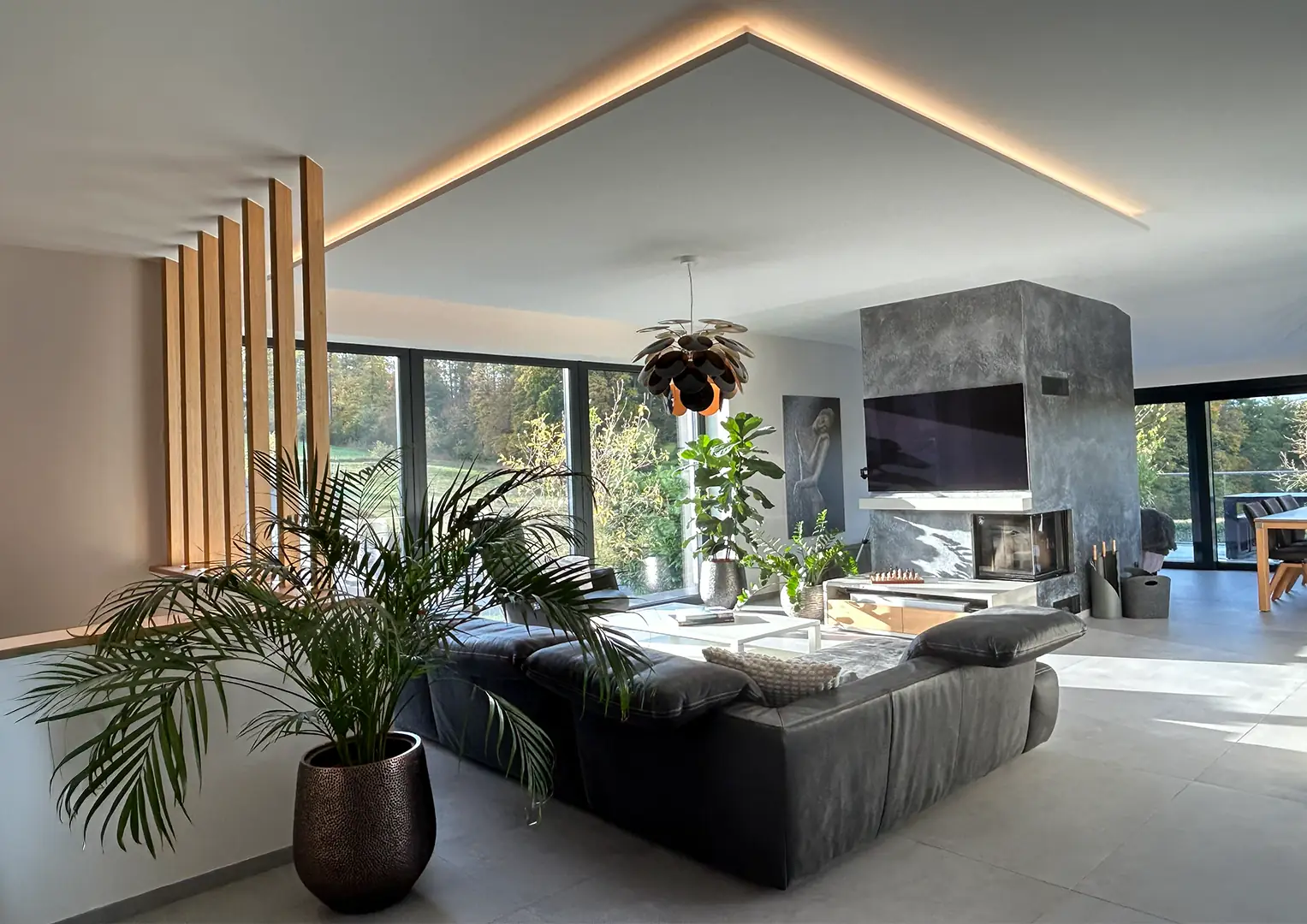 Nach der Fertigstellung präsentiert sich das Einfamilienhaus als modernes, harmonisch gestaltetes Wohngebäude. Die indirekte Beleuchtung verleiht den im Zuge der Modernisierung auch neu gestalteten Innenräumen in Kombination mit den Bestandsmöbeln eine stimmige Atmosphäre. Großzügige Fensterflächen eröffnen den Blick ins Grüne und in den neu inszenierten Wohnbereich, dessen zentrales Highlight der neue Kamin mit exklusiver Wandgestaltung bildet.
