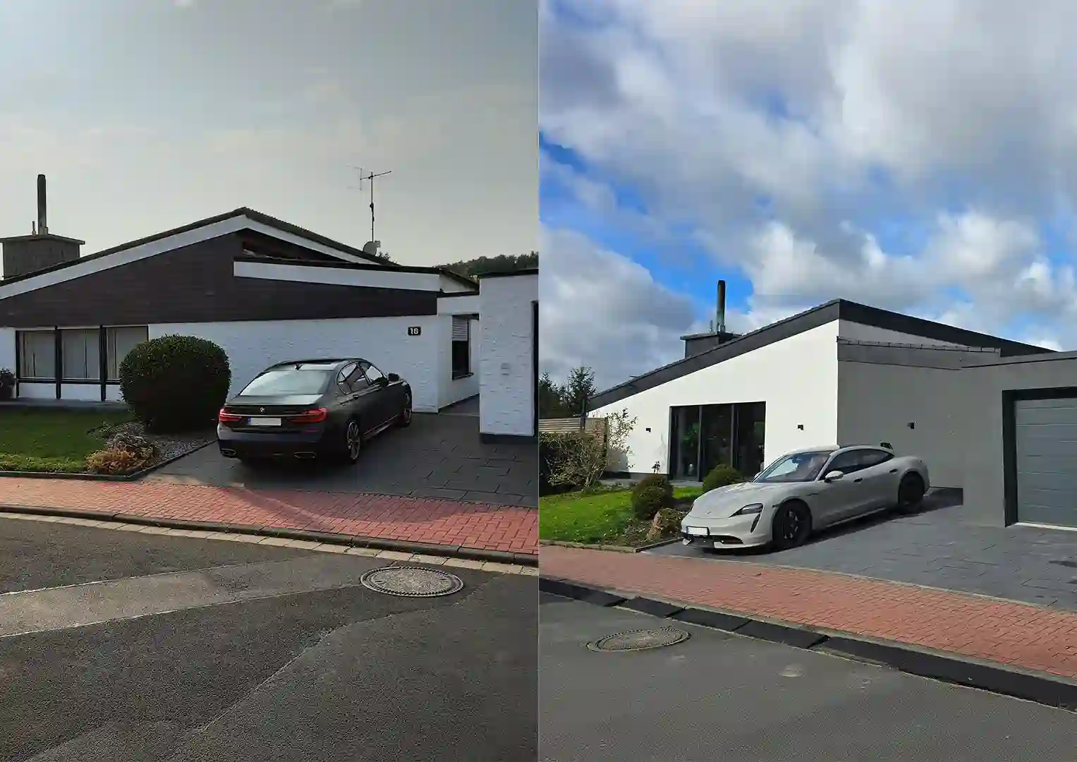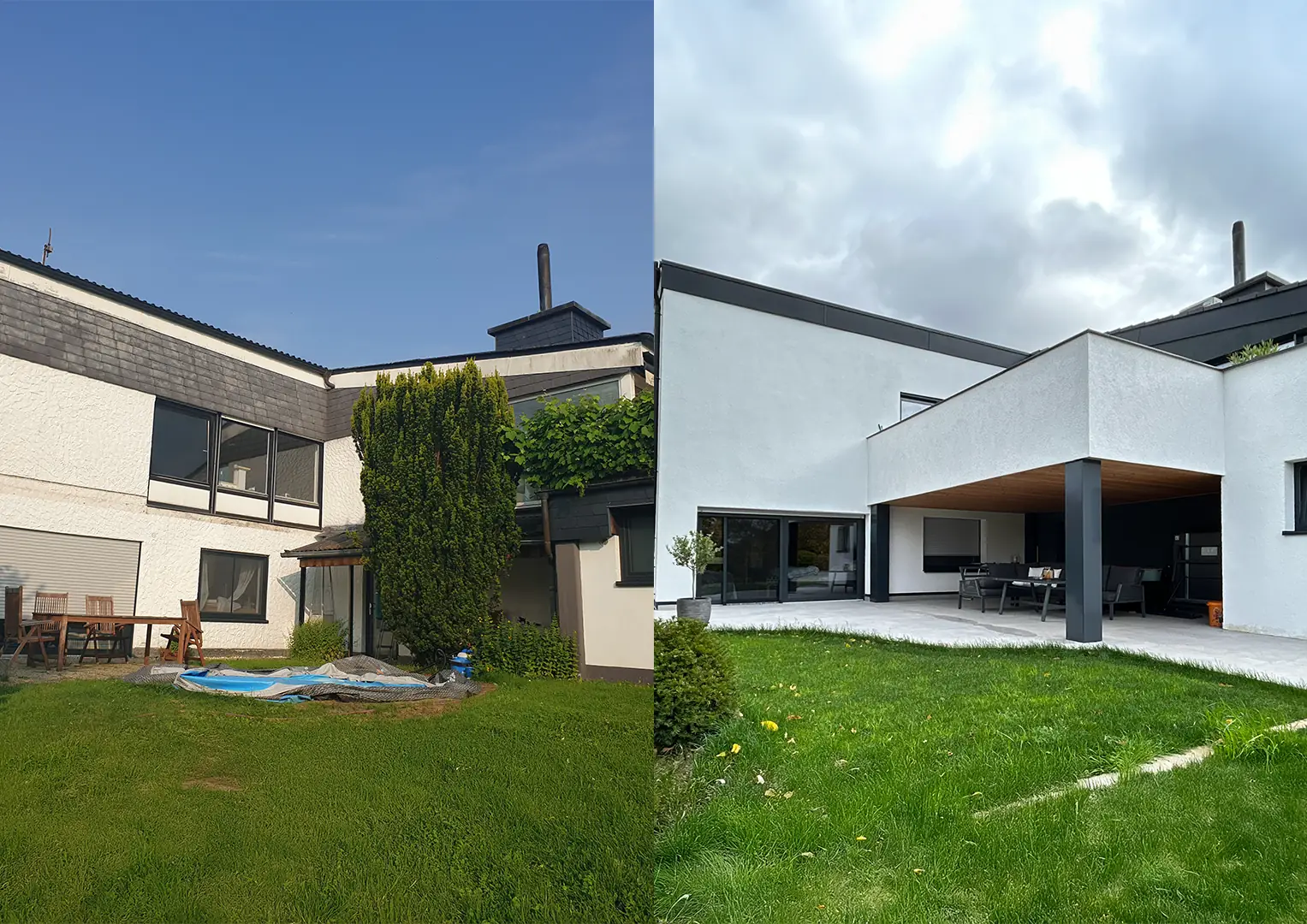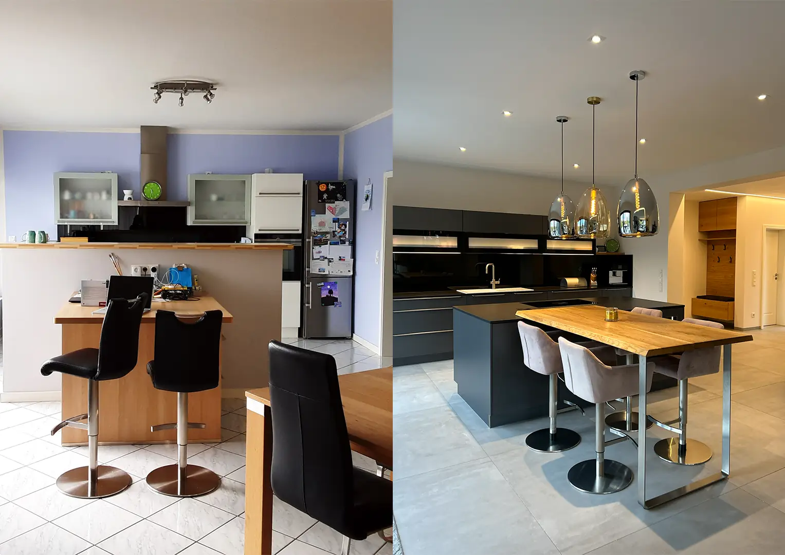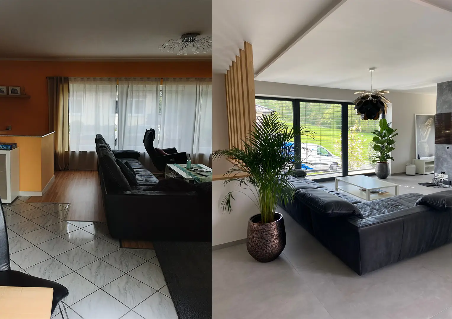 Die Gegenüberstellung von Vorher und Nachher macht die konzeptionelle Entwicklung des Projekts nachvollziehbar. Bestehende Strukturen wurden bewusst weitergedacht, neu organisiert und gestalterisch präzisiert – mit dem Ziel, ein modernes, lichtdurchflutetes Zuhause zu schaffen.