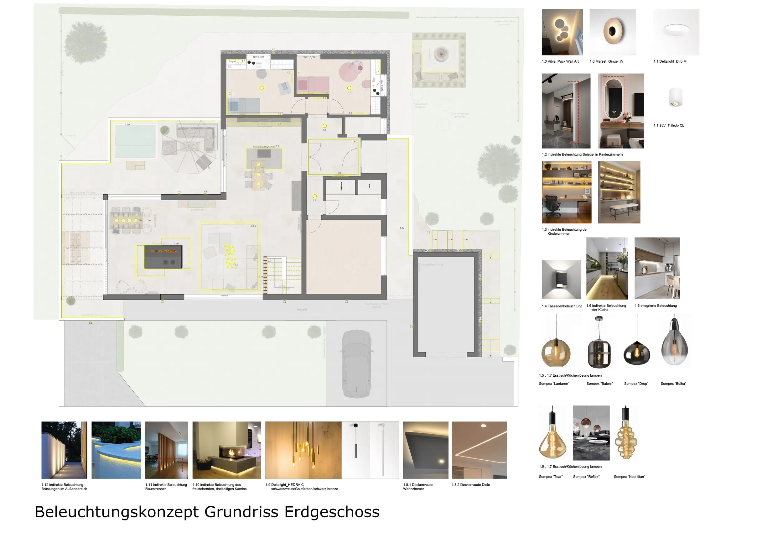 Das vorliegende Beleuchtungskonzept basiert auf dem finalen Gestaltungskonzept und verfolgt das Ziel, eine harmonische und funktionale Lichtgestaltung zu schaffen, die sowohl ästhetischen Anforderungen als auch den praktischen Bedürfnissen der Räume gerecht wird.