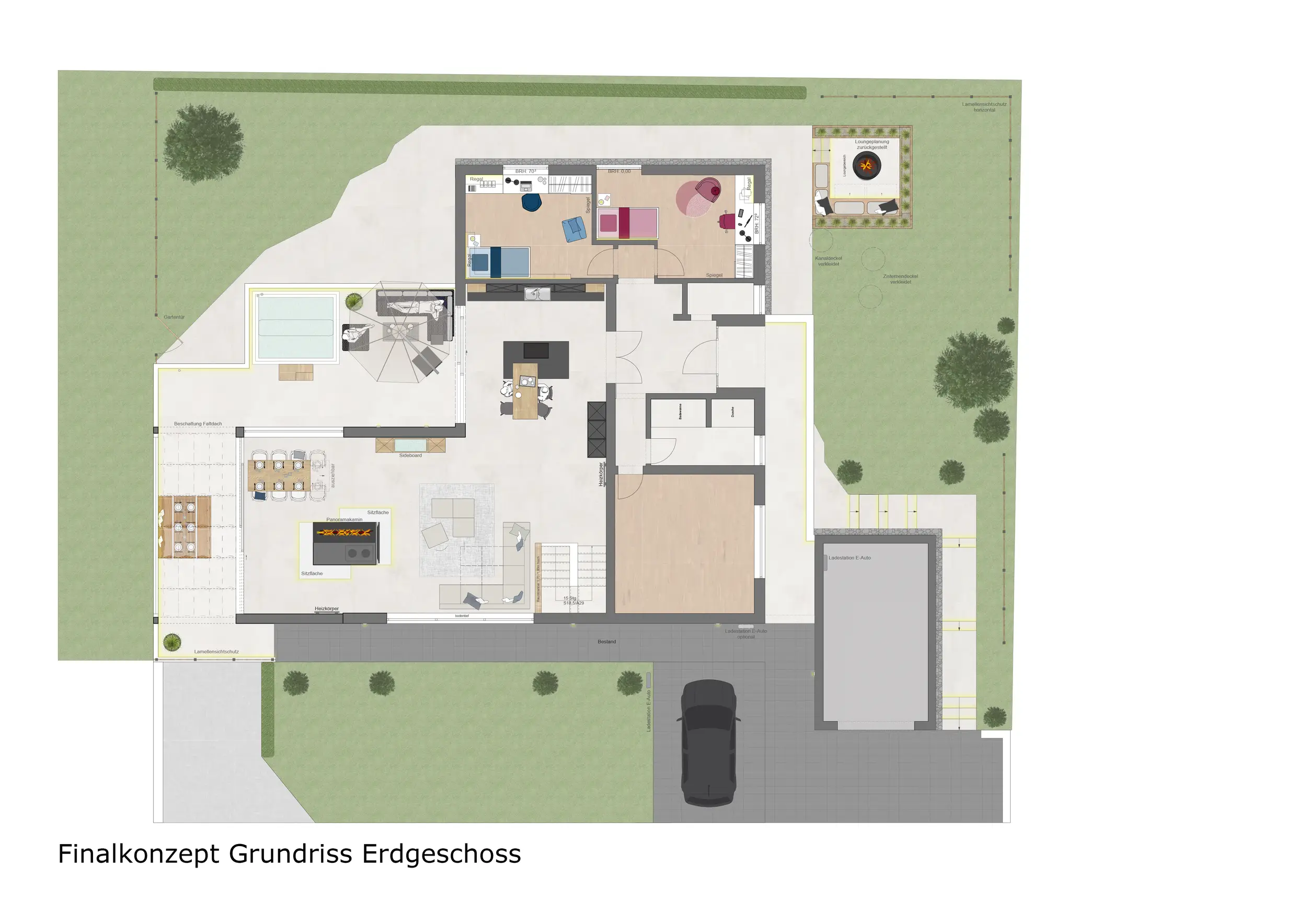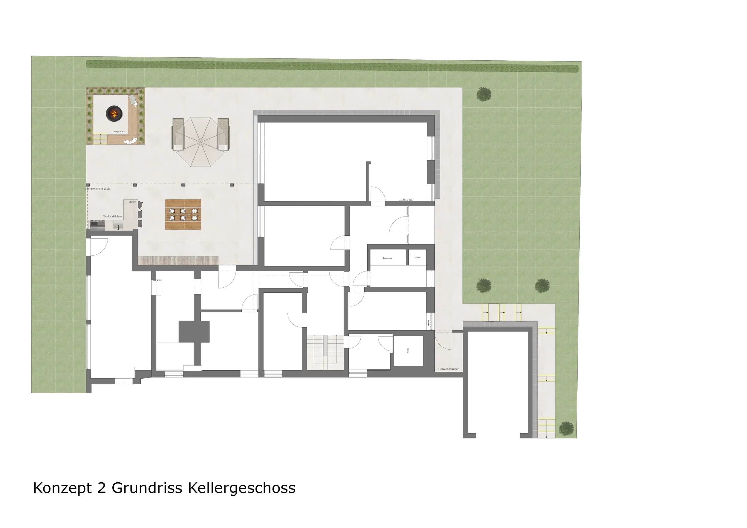 Der Außenbereich wurde im Vergleich zu Konzept 1 weiter in den Garten gezogen. Zusätzlich zur Terrasse wurde eine Outdoorküche mit Essbereich direkt am Gebäude integriert. Eine Liegefläche sowie eine Feuerstelle ergänzen das Nutzungskonzept. Der darüberliegende Balkon überdacht die darunterliegenden Außenflächen.