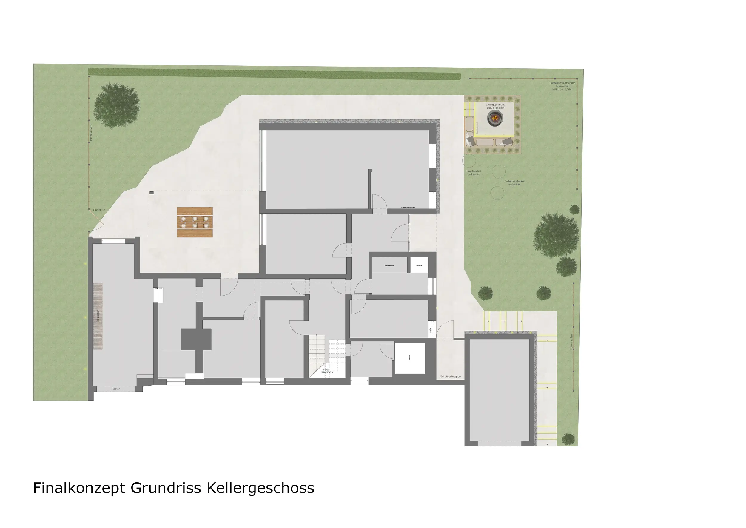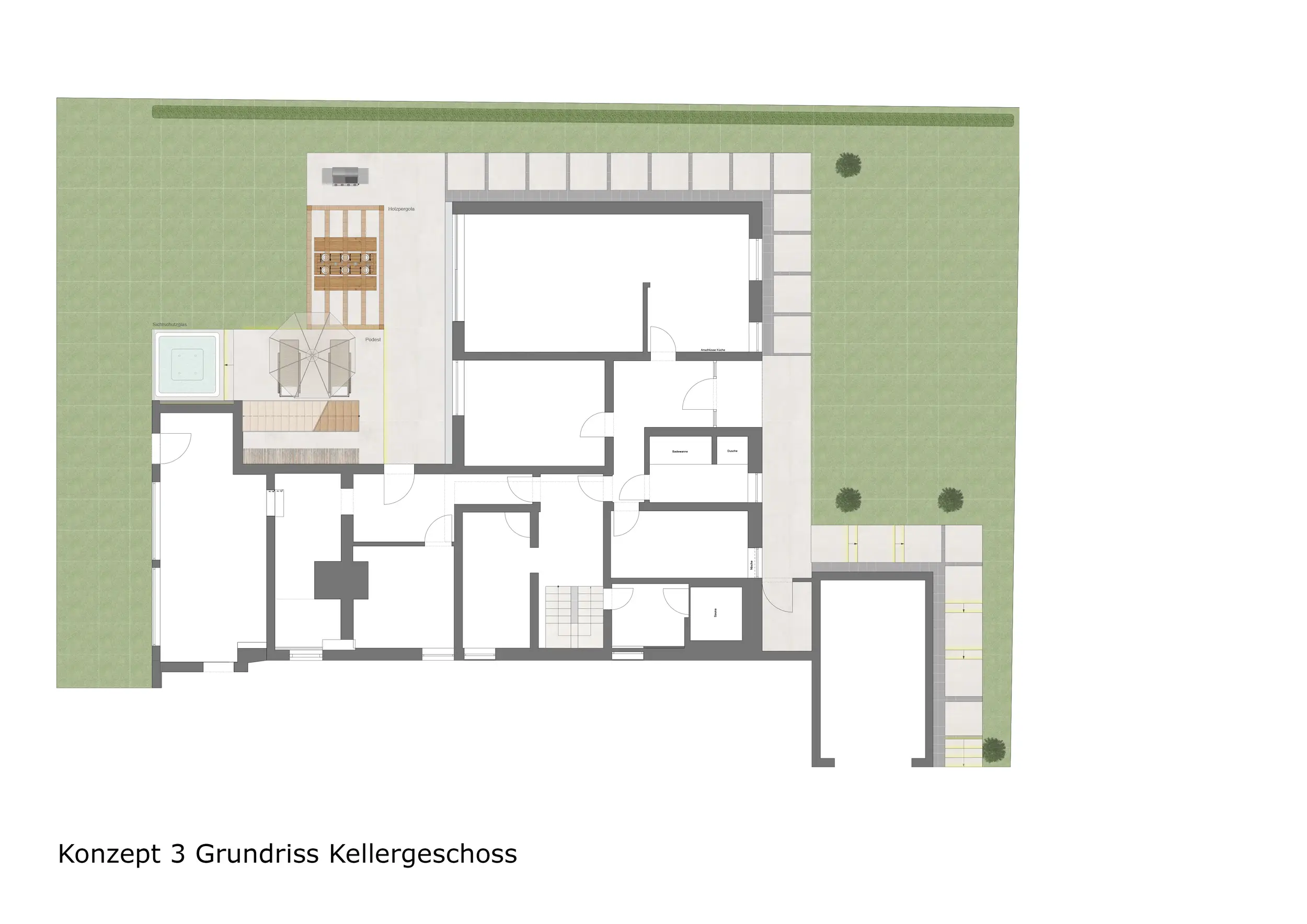 Im Kellergeschoss wurde der Innenraum – abgesehen von der Treppe – nicht verändert. Der Außenbereich wurde jedoch neu gedacht: Umlaufend um das Gebäude wurde ein Weg geplant, westlich des Hauses entstand eine großzügige Terrasse mit Sitz- und Liegeflächen. Der darüberliegende Balkon bildet einen geschützten Bereich für den darunterliegenden Außenraum.