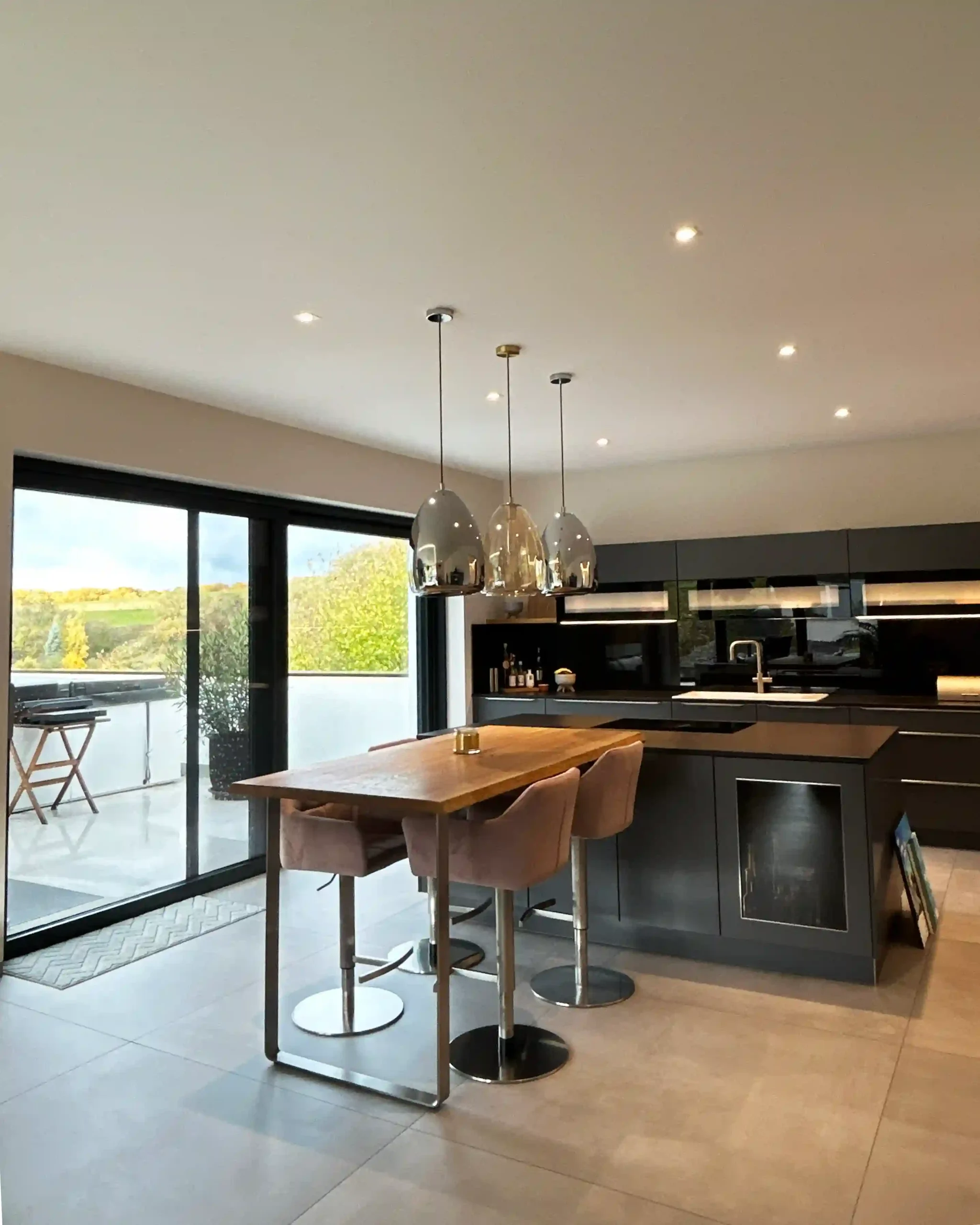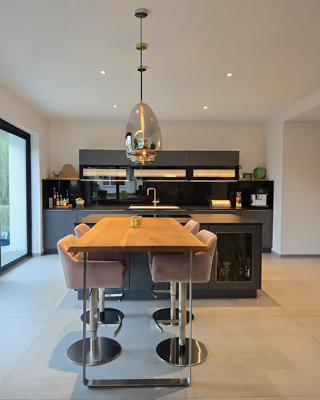 Der Zugang zum Kellergeschoss erfolgt hier über eine zweiläufige Treppe, wodurch eine Erweiterung der Geschossdecke erforderlich wurde. Die Küche wurde mit einer längsläufigen Kücheninsel geplant, in die ein Esstisch für vier Personen integriert ist.