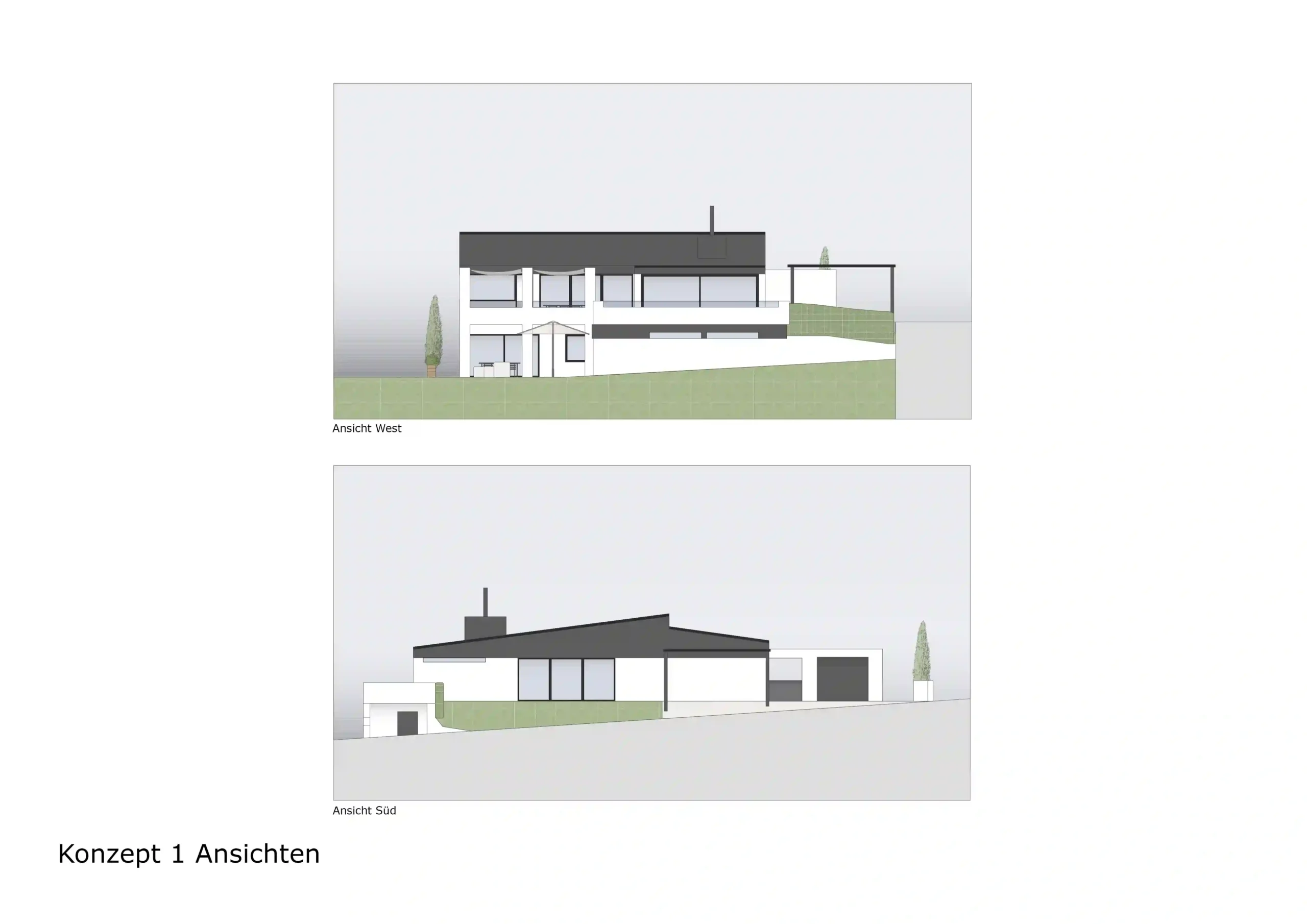 Für den Außenbereich und die Fassade lag der Fokus auf anthrazitfarbenen Fassadenflächen und Fensterrahmen, großzügigen Verglasungen, Schiebetürelementen sowie möglichen Übereckverglasungen. Ergänzend wurden Gestaltungsideen für die Zufahrt, einen überdachten Carport, die Balkongestaltung inklusive Jacuzzi sowie verschiedene Varianten der Eingangssituation dargestellt.