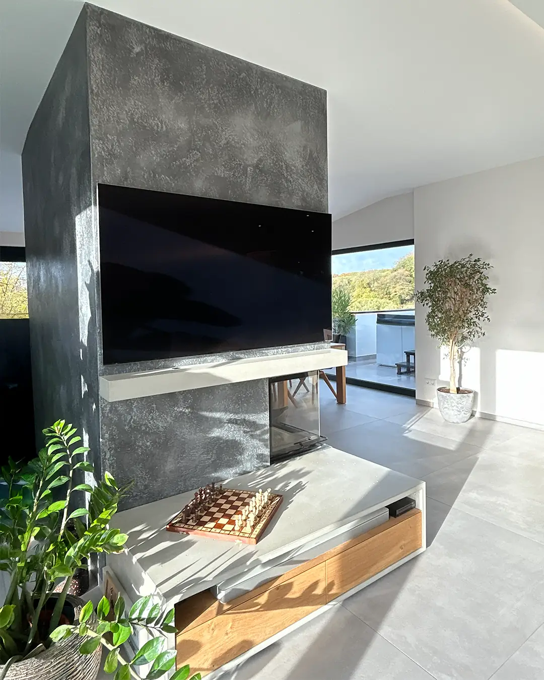 Im Finalkonzept wurde der gesamte Kollektivbereich des Hauses vollständig modernisiert. Die neue Küche mit Kücheninsel und integriertem Esstisch bildet nun das kommunikative Zentrum des Erdgeschosses. Der Wohnbereich wurde neu inszeniert, indem der Bestandskamin zu einem zweiseitigen Kamin umgebaut wurde. Die Kaminwand erhielt eine spezielle Putztechnik, die als markanter Blickfang dient.
