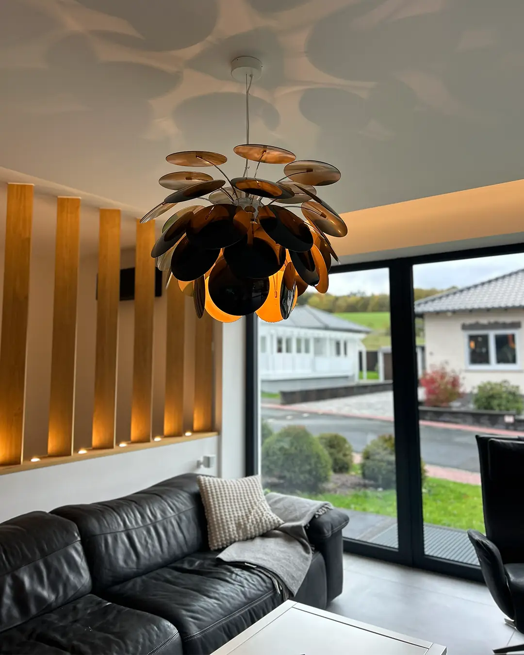 Der Wintergarten wurde dem Wohnraum zugeordnet und beherbergt nun den Esstisch, der von einem Ensemble aus 20 Pendelleuchten atmosphärisch in Szene gesetzt wird.