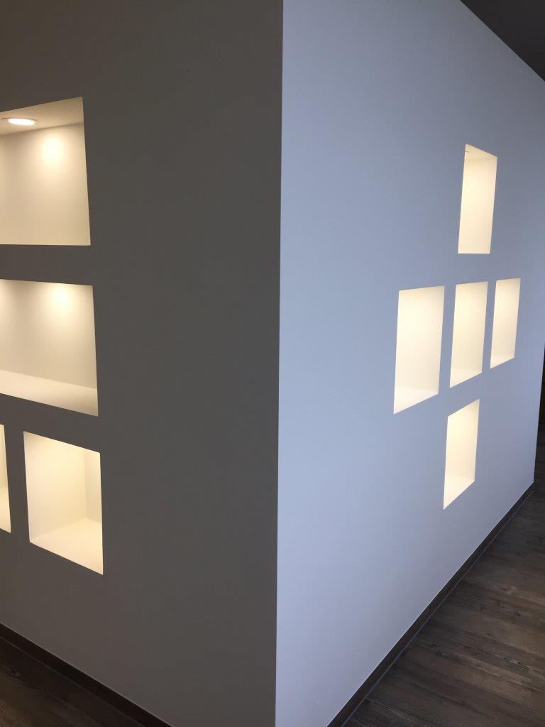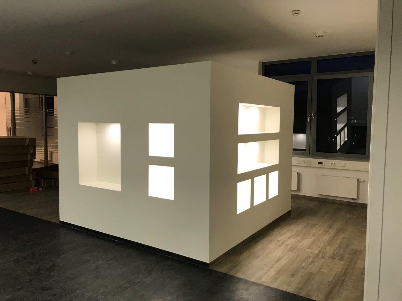 Da die gesamte Fläche zur Verfügung stand und diese offen gestaltet werden sollte, war es eine besondere Herausforderung, ein Schallschutzkonzept zu entwickeln, das den Anforderungen der Mitarbeiter an eine ruhige Arbeitsatmosphäre entspricht und eine damit einhergehende hohe Konzentration während des Arbeitens ermöglicht. Dabei setzte das Team von raum in form – Innenarchitektur & Architektur auf den Einsatz moderner, hinterleuchteter Wand- Elemente, die mit für das Unternehmen repräsentativen Bildmotiven bedruckt wurden und somit nicht nur die verschiedenen Tätigkeitsfelder des Unternehmens aufgezeigt werden, sondern die gleichzeitig auch den entstehenden Lärm aufnehmen und ein angenehmes Licht erzeugen.