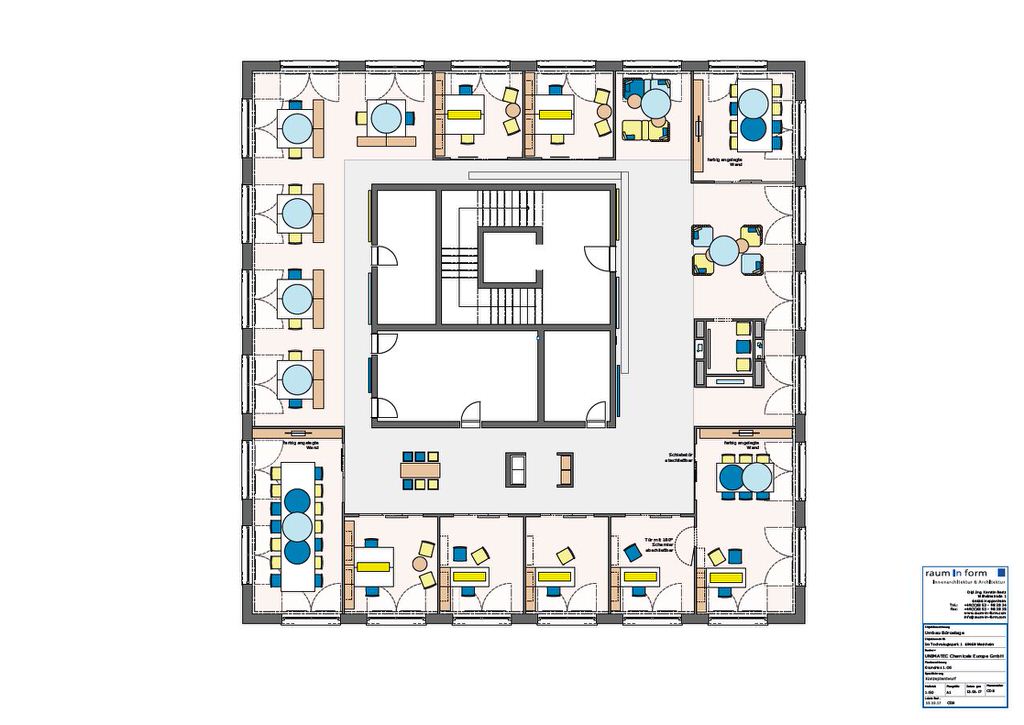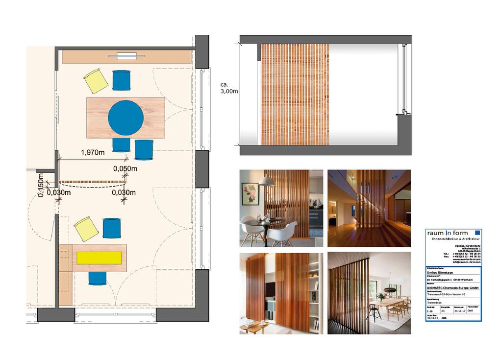 In nur 5 Monaten Planung- und Umbauzeit hat das Team aus Innenarchitekten und Architekten von raum in form – Innenarchitektur & Architektur den neuen europäischen Firmensitz eines Tochterunternehmens der Freudenberg AG, einem der größten deutschen Unternehmen in Familienhand, neu konzeptioniert und innerhalb von nur zwei Monaten Bauzeit realisiert. Durch die enge Zusammenarbeit mit Fachplanern und den Bauherren konnten die Mitarbeiter im Dezember 2017 in ihre individuell an ihre Wünsche angepassten Büroräumlichkeiten einziehen. Als raum in form – Innenarchitektur & Architektur im Juni 2017 mit der Konzeption, dem Umbau und der Einrichtung der Räumlichkeiten der in Weinheim ansässigen, zur Freudenberg AG, einer der größten deutschen Konzerne in Familienhand gehörigen Tochterfirma Unimatec beauftragt wurde, wurde schnell deutlich, dass ein zum modernen Firmenkonzept passendes Aus- und Umbaukonzept gefunden werden musste, welches den flexiblen Anforderungen der Angestellten gerecht wird. In den neuen Büroräumlichkeiten, die im Laufe des Monats Dezember 2017 bezogen werden sollten, entstand in enger Zusammenarbeit zwischen dem Team von raum in form – Innenarchitektur & Architektur und den Mitarbeitern des europäischen Firmensitzes ein ganzheitliches Einrichtungskonzept, welches speziell auf die Bedürfnisse der Teams zugeschnitten wurde . Hierbei wurden eine Empfangs- und Ausstellungsfläche, verschiedene Besprechungsräume, eine offene Bürofläche sowie Einzel- und Doppelbüros in den ca. 500 m² großen neuen Firmensitz geplant. Wichtig war hierbei, dass jeder Mitarbeiter je nach Aufgabe seinen Arbeitsplatz wechseln kann, um das Arbeiten in Teams zu vereinfachen. Daneben sollte ein Aufenthaltsbereich konzipiert und in die Fläche integriert werden. Hier können die Mitarbeiter entspannte Telefonate führen oder sich zur Ideenfindung zurückziehen.