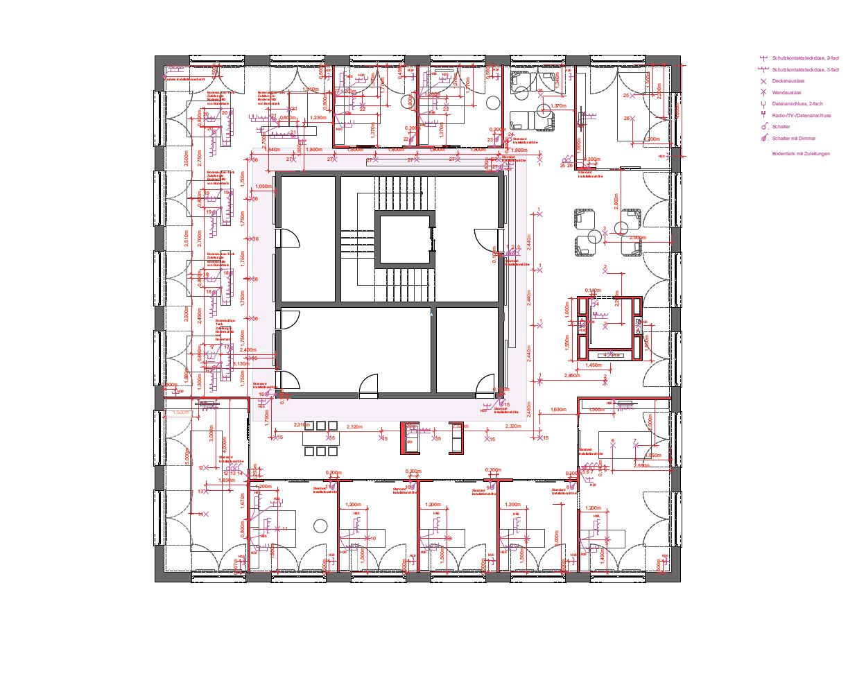 Bei der Elektroplanung für die Tochterfirma der Freudenberg AG wurde darauf geachtet, dass jeder Arbeitsplatz mit ausreichend Steckdosen versorgt ist, damit jeder Mitarbeiter individuelle Elektrogeräte anschließen kann. Diese Anschlüsse sollten sich dezent in die Gestaltung einfügen, weshalb das Team von raum in form – Innenarchitektur & Architektur eine Elektroausführungsplanung erstellte und die Verlegung der Zuleitungen aus dem den Kern umgebenden Bodentank dezent durch Schlitze in Boden oder Decke sowie aus den Außenwänden in die Trennwände plante.
