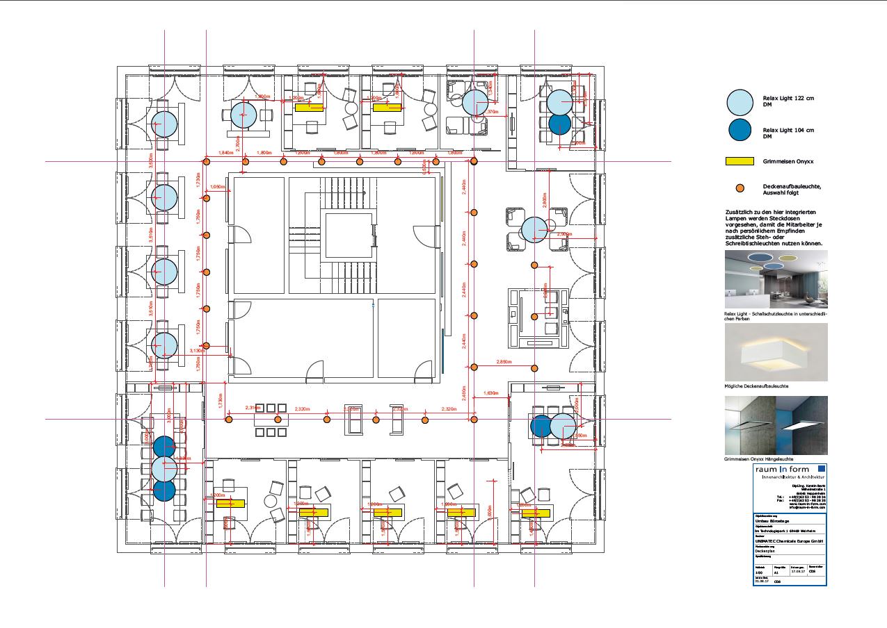 Um eine angepasste, angenehme Arbeitsatmosphäre in dem Gebäude zu erzeugen, entwickelte das Team von Innenarchitekten und Architekten von raum in form – Innenarchitektur & Architektur ein individuelles Beleuchtungskonzept. Hierbei wurde vor allem darauf geachtet, dass die Arbeitsplätze gut ausgeleuchtet sind, ohne jedoch den Mitarbeiter zu blenden. Aus diesem Grund wurden alle Leuchten direkt über dem Arbeitsplatz dimmbar gewählt, während die Grundbeleuchtung in Form von Spots eine angenehme Lichtatmosphäre schafft. Für die Beleuchtung in den Konferenzräumen und über den Gruppenarbeitstischen würde eine Ringleuchte mit rundem Schallschutzelement gewählt, welche farbliche Akzente in der Firmenfarbe setzt und gleichzeitig ein Highlight in der modernen Ausstattung.