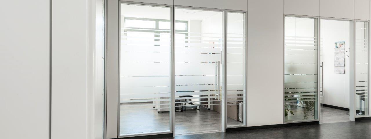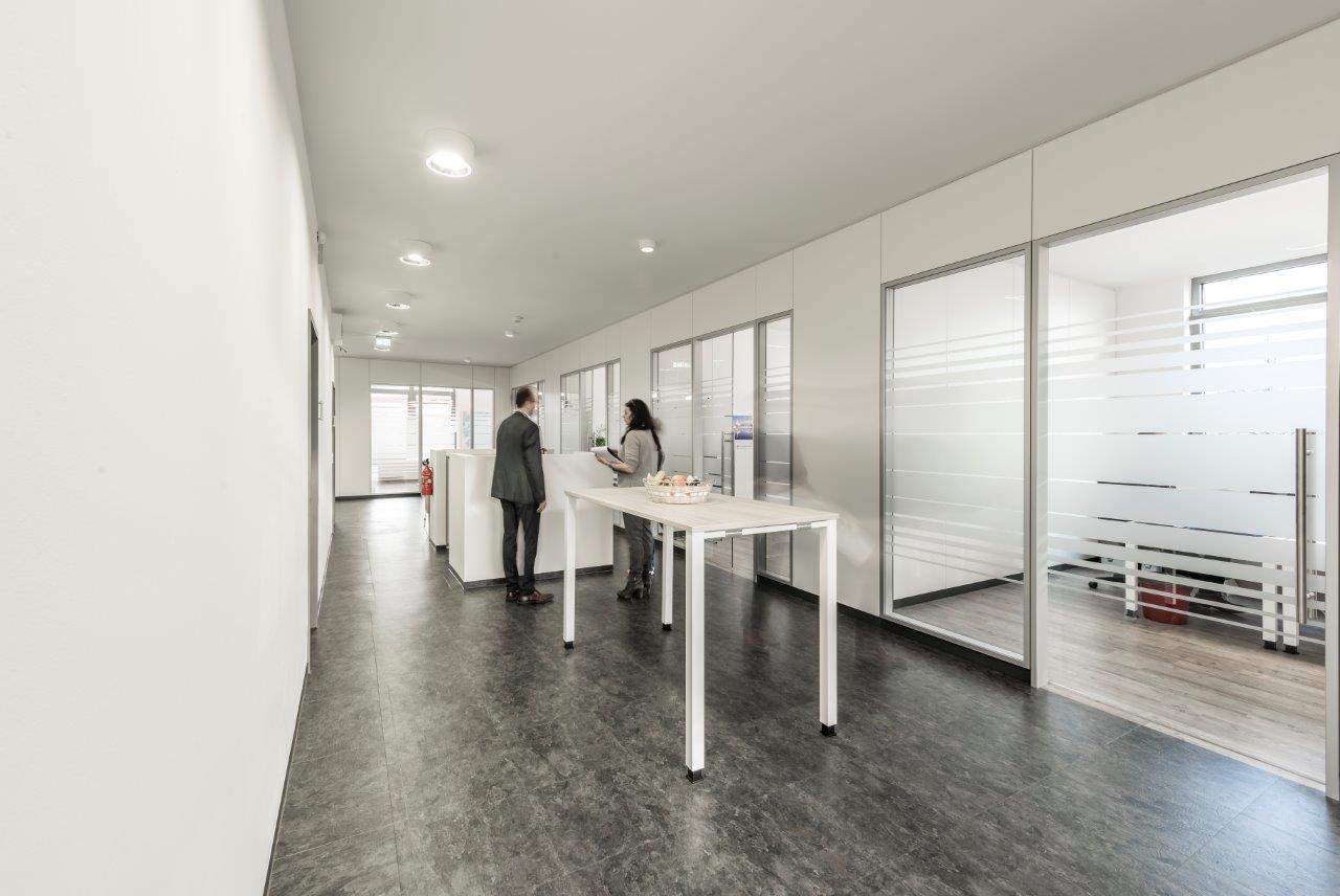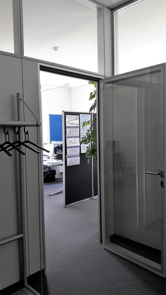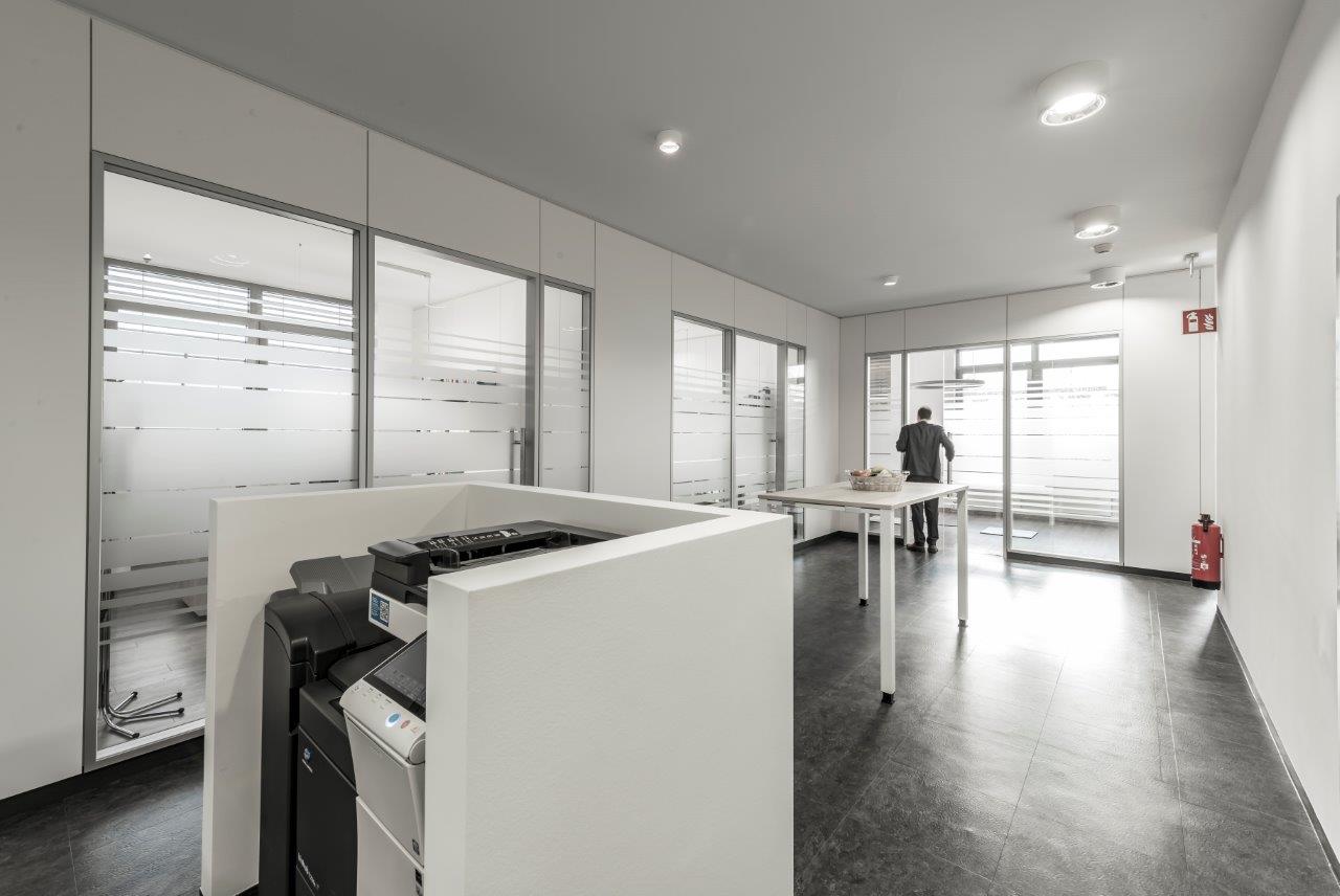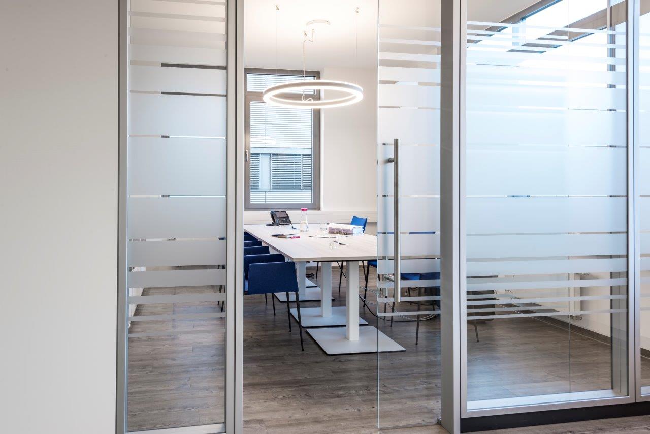 Einen wichtigen Schritt für das Team von raum in form – Innenarchitektur & Architektur stellte die Entwicklung und Gestaltung der individuellen Büro-Trennwände mit raumhohen Glasschiebetüren dar, welche sowohl in Gestalt wie auch Materialität an die Wünsche des Unternehmens angepasst und auf Maß gefertigt und eingebaut wurden. Hierbei wurde in enger Zusammenarbeit der verschiedenen ausführenden Firmen darauf geachtet, dass die Elektroinstallationen möglichst dezent in den Trennwänden verschwinden und den Blick auf die moderne und praktische Büroausstattung lenken.