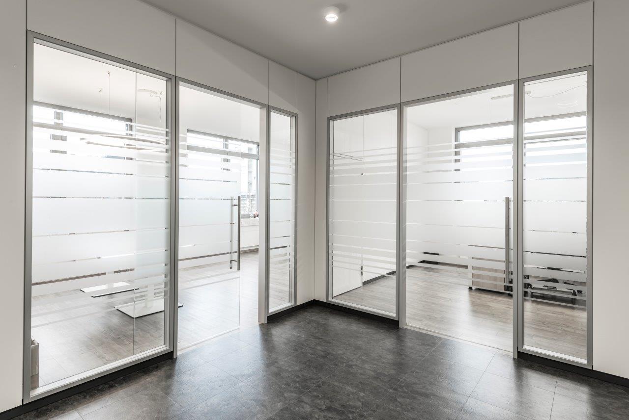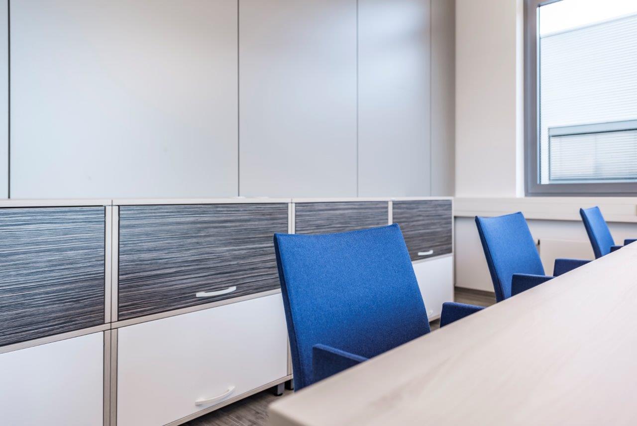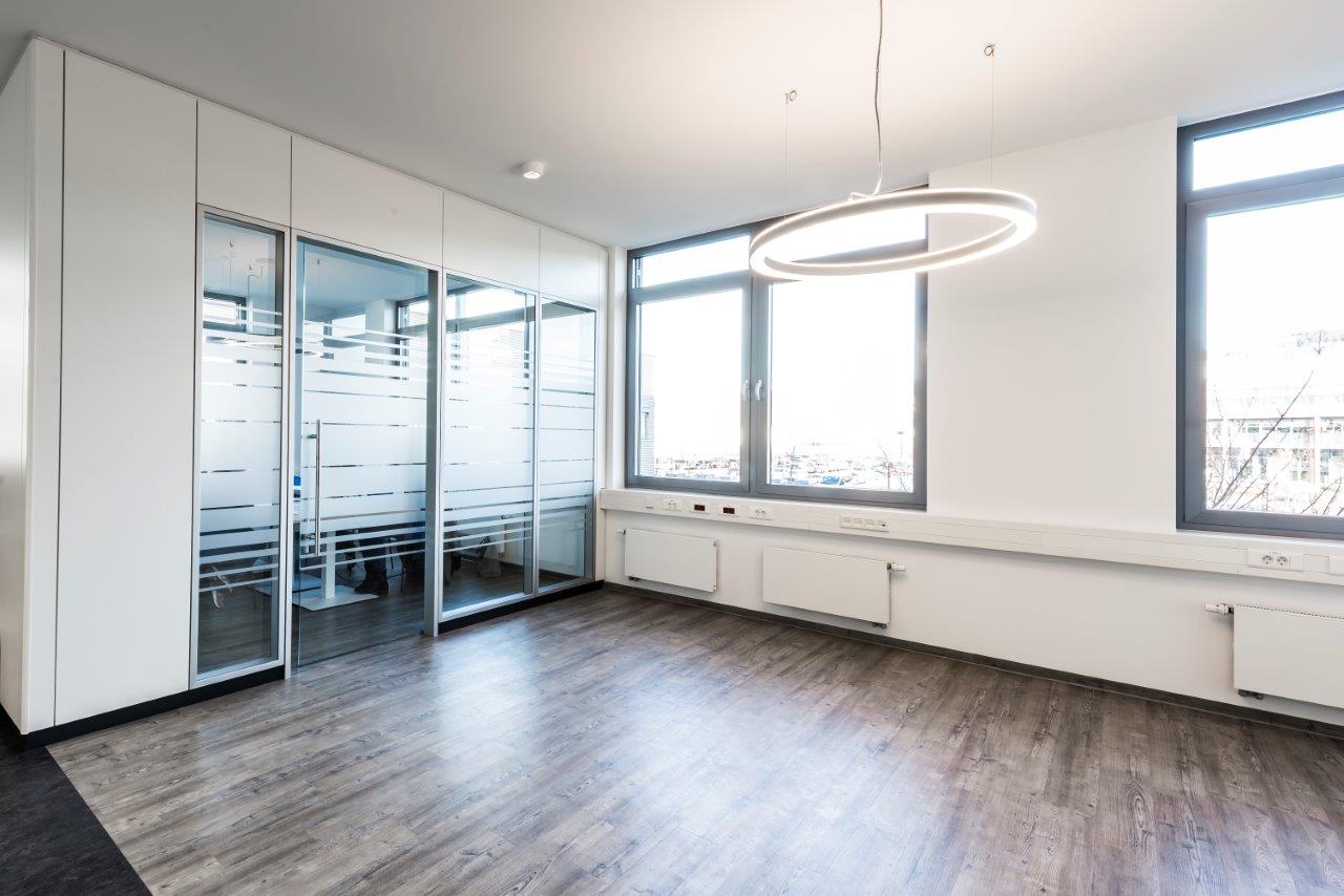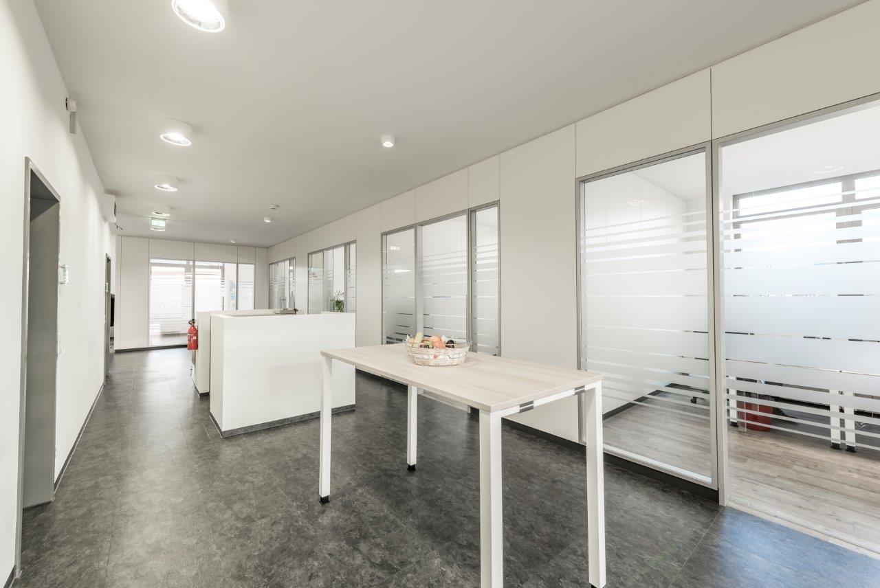 Einen wichtigen Schritt für das Team von raum in form – Innenarchitektur & Architektur stellte die Entwicklung und Gestaltung der individuellen Büro-Trennwände mit raumhohen Glasschiebetüren dar, welche sowohl in Gestalt wie auch Materialität an die Wünsche des Unternehmens angepasst und auf Maß gefertigt und eingebaut wurden. Hierbei wurde in enger Zusammenarbeit der verschiedenen ausführenden Firmen darauf geachtet, dass die Elektroinstallationen möglichst dezent in den Trennwänden verschwinden und den Blick auf die moderne und praktische Büroausstattung lenken.
