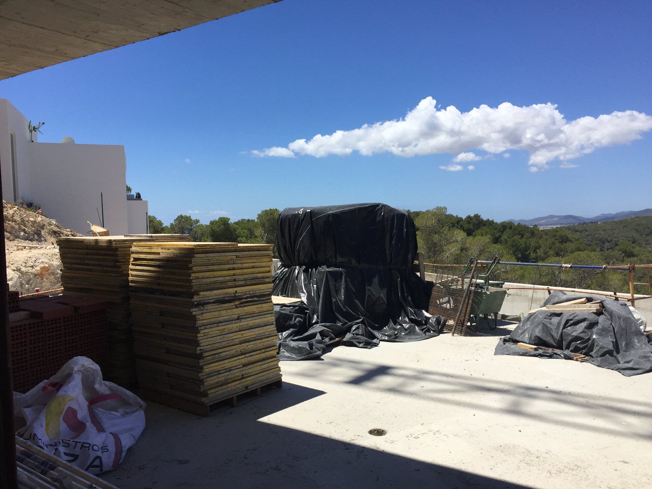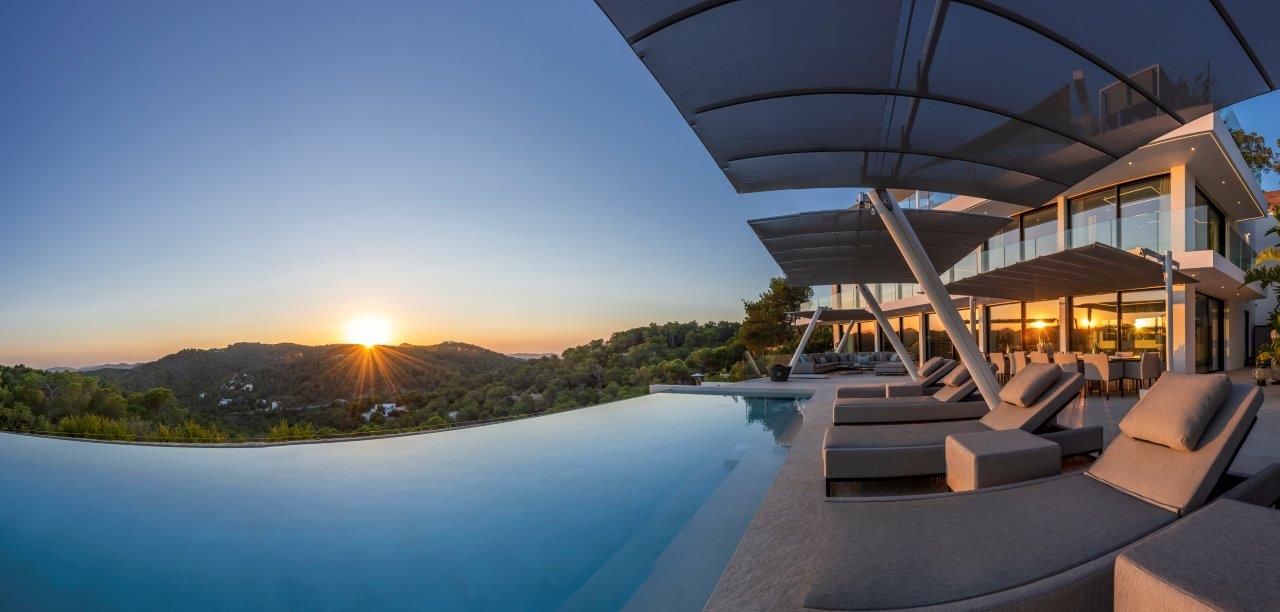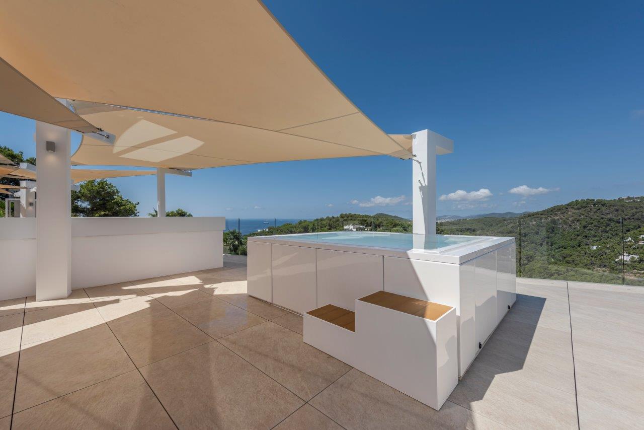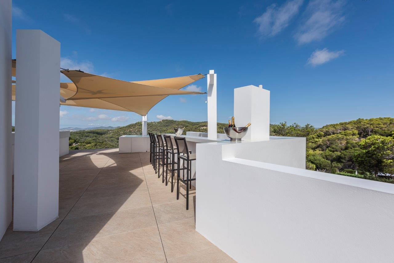 Die Villa, die auf einem 2.500 m² großen Hanggrundstück entstehen sollte, wurde so konzipiert, dass die Villa über ein Haupthaus mit zwei Geschossen, das von den Eigentümern genutzt werden kann, sowie über ein separates Gästehaus mit mehreren Schlafzimmern und Wohnbereichen mit Terrassen verfügt. Das Flachdach des Haupthauses, von dem man einen großartigen Meerblick in Richtung Formentera sowie den Blick auf Ibiza-Stadt hat, wurde als „Rooftop-Area“ mit Bar und Outdoor-Küche, großzügigen Lounge- Bereichen mit Feuerstellen sowie einem Sonnen- und Wellnessbereich mit Whirlpool konzipiert.