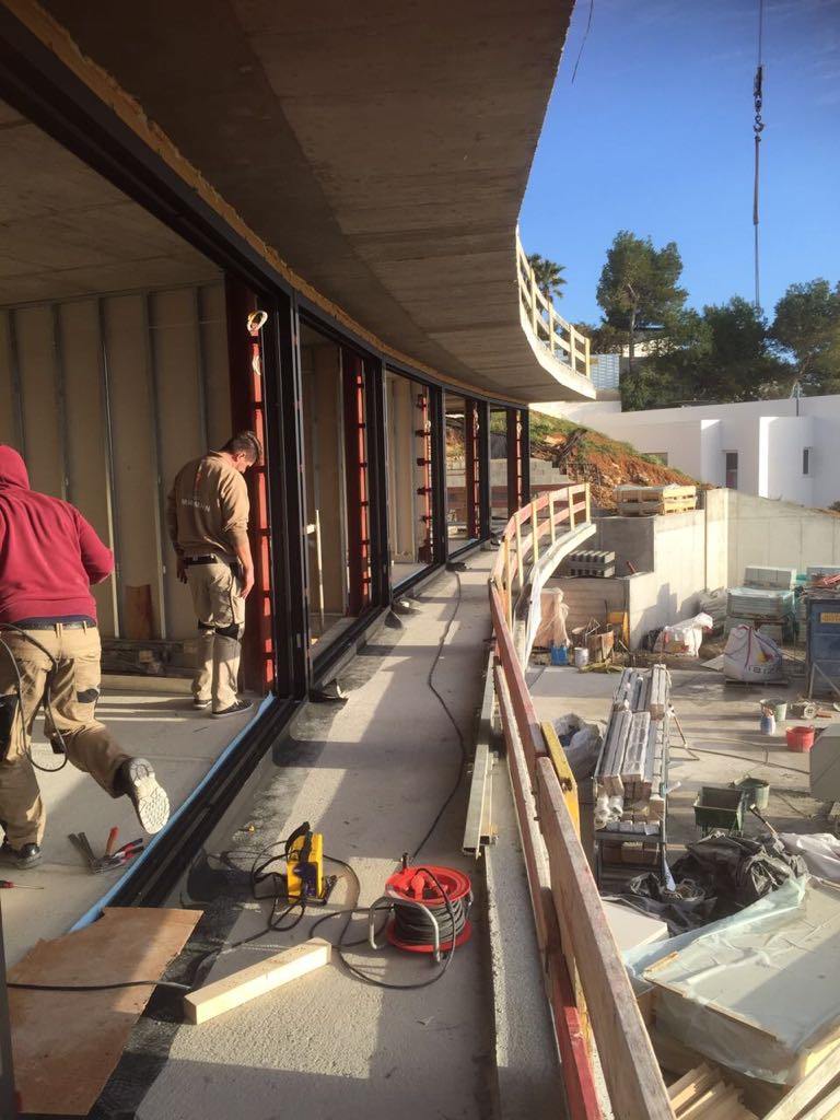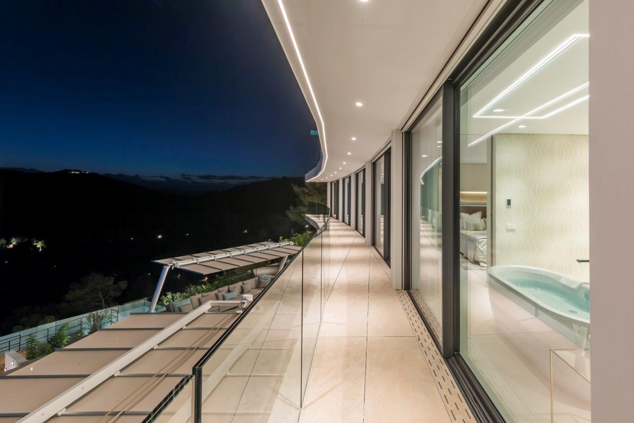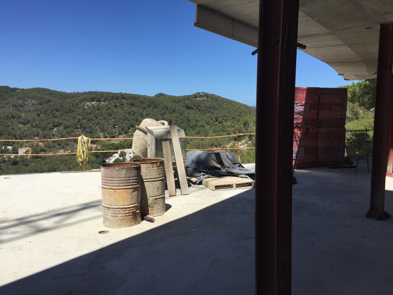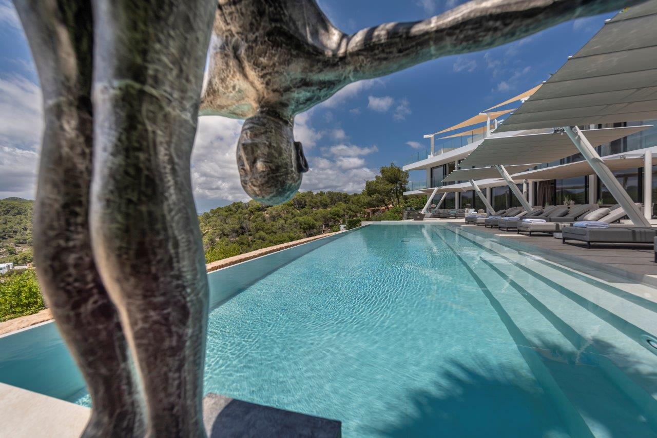 Die Villa, die auf einem 2.500 m² großen Hanggrundstück entstehen sollte, wurde so konzipiert, dass die Villa über ein Haupthaus mit zwei Geschossen, das von den Eigentümern genutzt werden kann, sowie über ein separates Gästehaus mit mehreren Schlafzimmern und Wohnbereichen mit Terrassen verfügt. Das Flachdach des Haupthauses, von dem man einen großartigen Meerblick in Richtung Formentera sowie den Blick auf Ibiza-Stadt hat, wurde als „Rooftop-Area“ mit Bar und Outdoor-Küche, großzügigen Lounge- Bereichen mit Feuerstellen sowie einem Sonnen- und Wellnessbereich mit Whirlpool konzipiert.