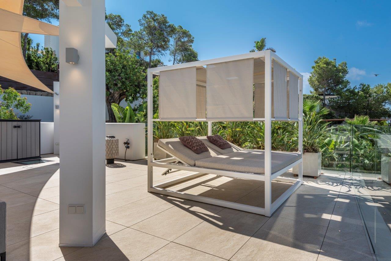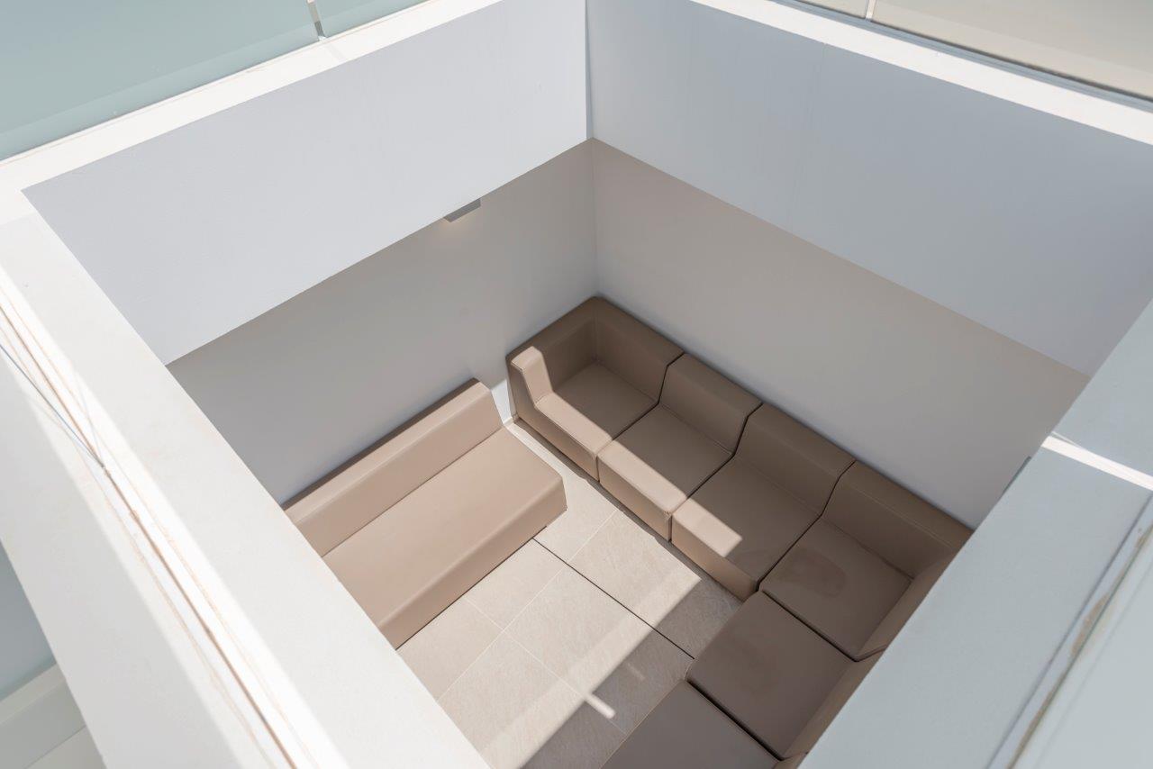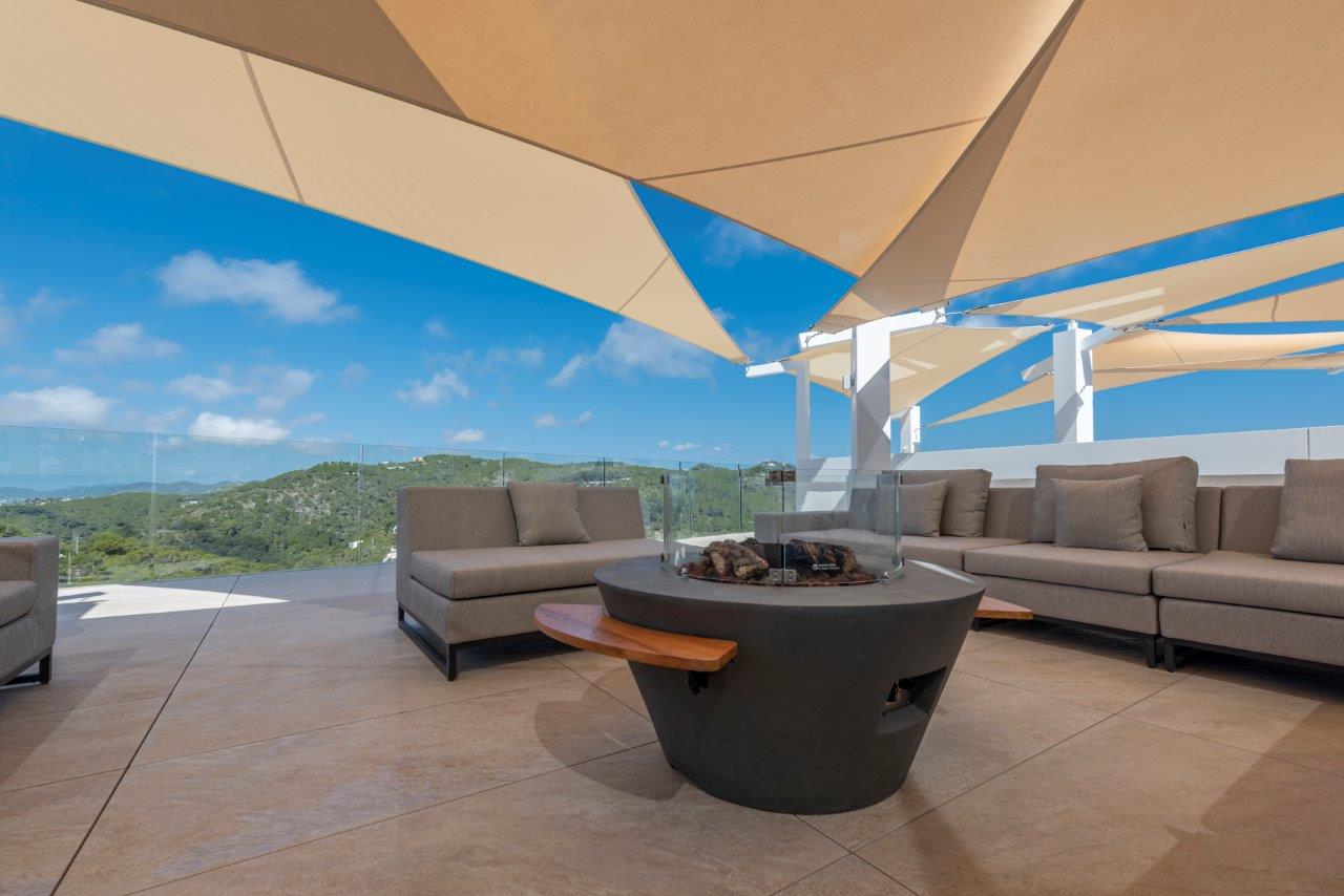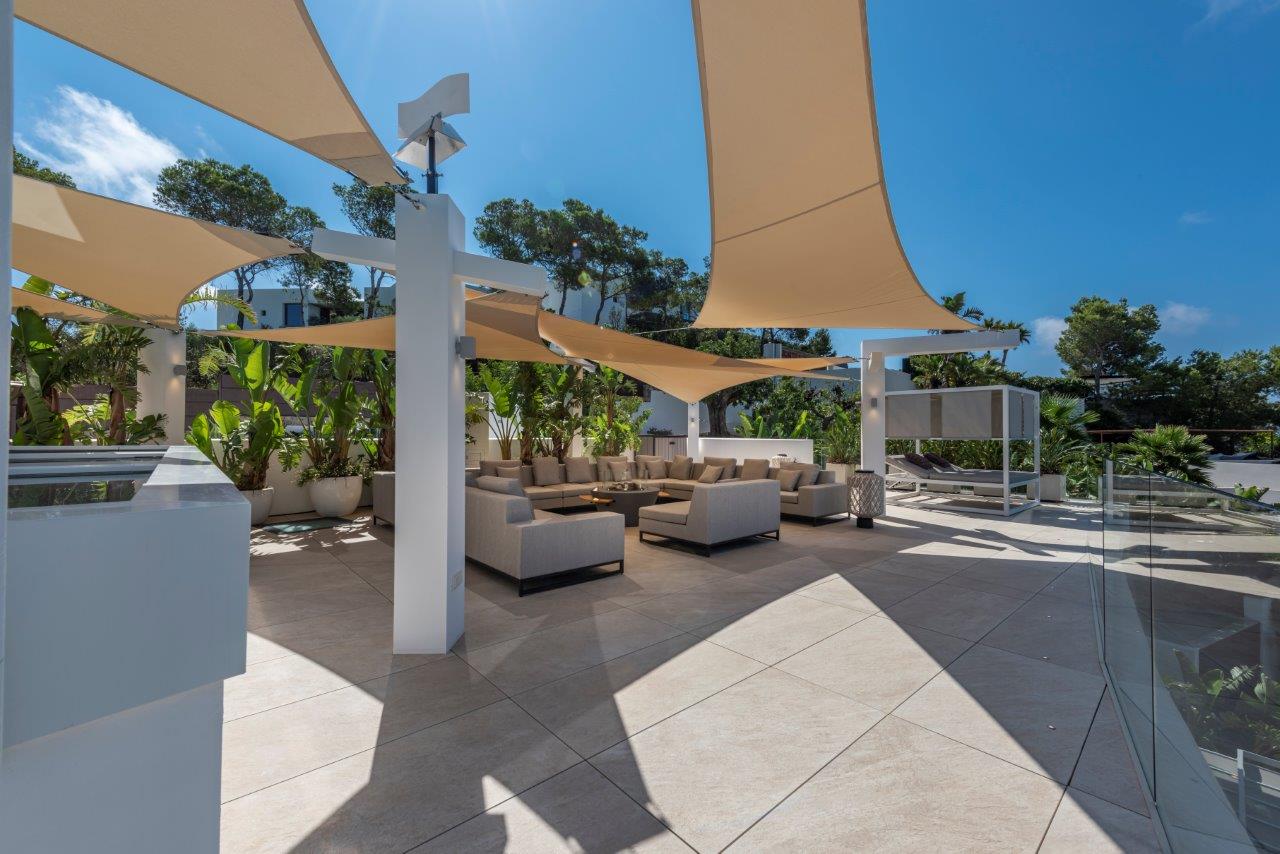 Gekrönt wird das Haupthaus durch das von Palmen und Solitärpflanzen umsäumte, offen gestaltete Rooftop, dass durch die Anordnung von Lounge- Bereichen mit Feuerstellen, Daybeds und einem Barbereich mit Whirlpool zoniert ist und von dem der traumhafte Meeresblick Richtung Formentera ein ganz besonderes Highlight bietet.