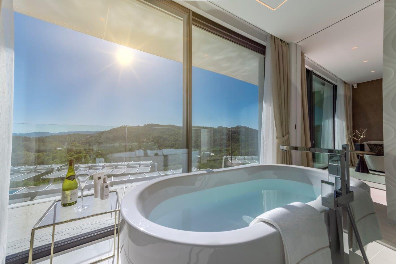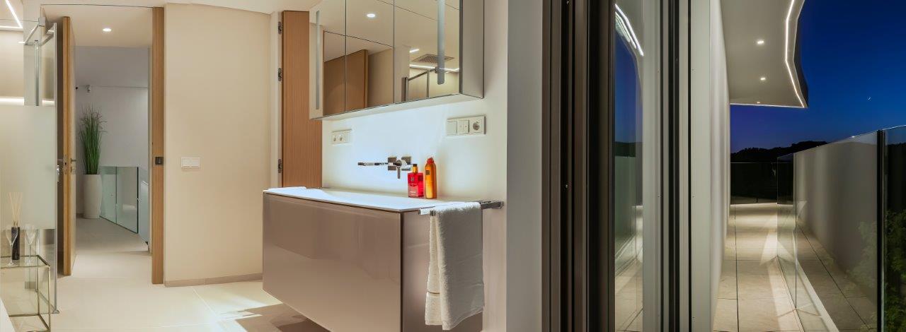 In Ebene drei sind drei Schlafbereiche mit eigenen Badezimmern untergebracht- eines der Bäder wurde als Masterbad konzipiert und ist mit einer Badewanne mit Blick in Richtung Meer ausgestattet. Die großzügige Dusche und das Doppelwaschbecken runden die luxuriöse Atmosphäre ab- ein WC mit Waschbecken befindet sich angrenzend in einem abgeschlossenen Raum. Neben den Schränken in den einzelnen Schlafbereichen sind auf dieser Ebene weitere begehbare Ankleiden mit Schminkbereich integriert.
