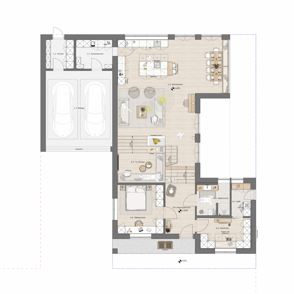 Im Querriegel öffnet sich der Grundriss zu einem weitläufigen Wohn- und Essbereich, der durch zahlreiche bodentiefe Sprossenfenster mit Tageslicht durchflutet wird und einen unmittelbaren Bezug zur umlaufenden Terrasse sowie dem Garten schafft. Die Terrasse auf der Südseite lädt durch ihre geschützte Lage zu sonnigen Stunden im Freien ein, während die östliche Terrasse besonders für das Frühstück in den Morgenstunden vorgesehen ist.