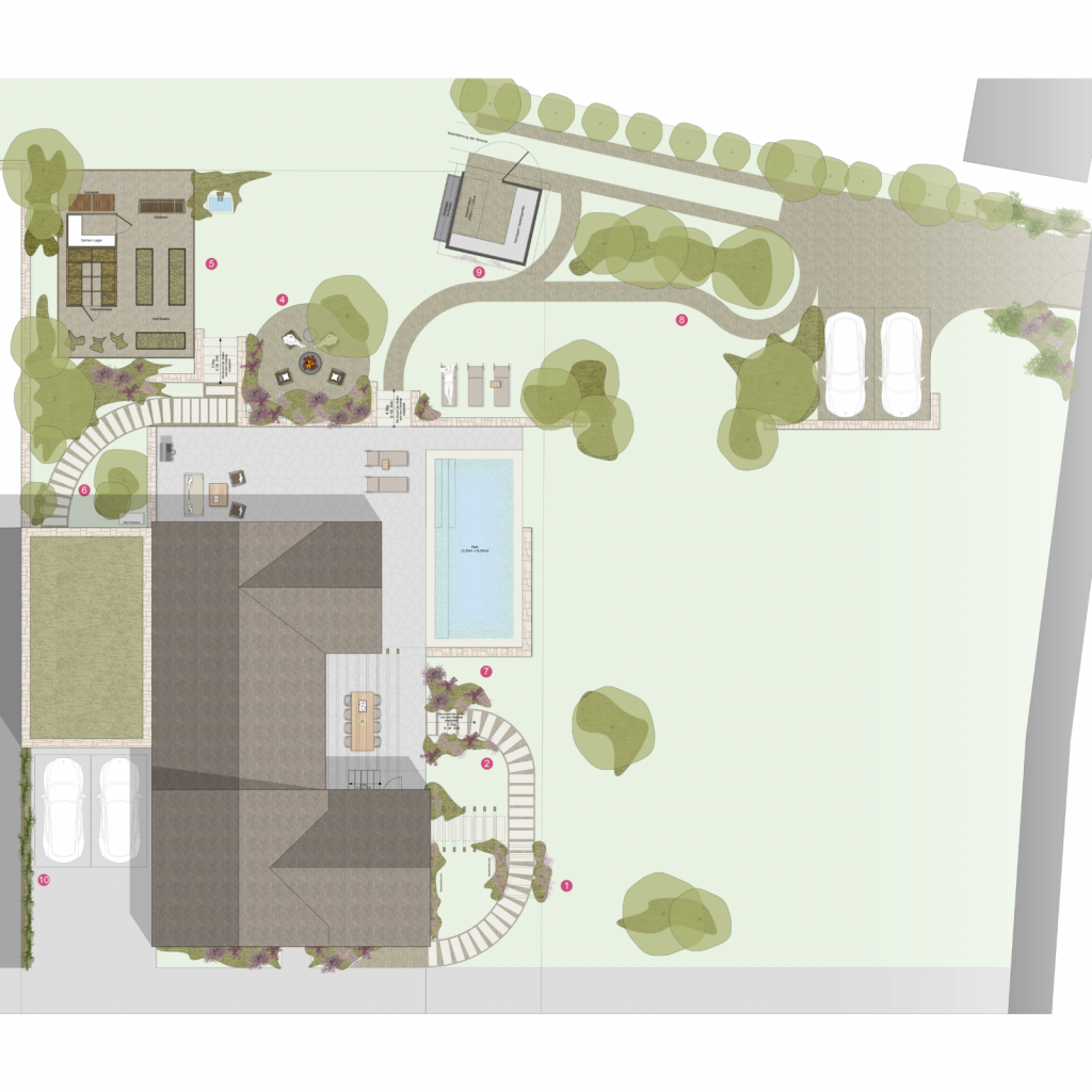 Die Gartenplanung fügt sich mit ihrer romantisch-organischen Formsprache nahtlos in die Topografie des Grundstücks ein. Der Infinity-Pool an der Südseite ist in eine Natursteinmauer eingebettet, die sich als wiederkehrendes Gestaltungselement durch das gesamte Außenkonzept zieht. Eine umlaufende Terrasse verbindet die unterschiedlichen Gartenbereiche und bildet zusammen mit dem Pool ein zentrales Element des Außenraums. Auch der zweite Zugang im hinteren Grundstücksbereich wurde berücksichtigt- die dort angeordneten Stellplätze sind dezent mit Naturstein eingefasst und fügen sich harmonisch in das Gesamtbild ein.